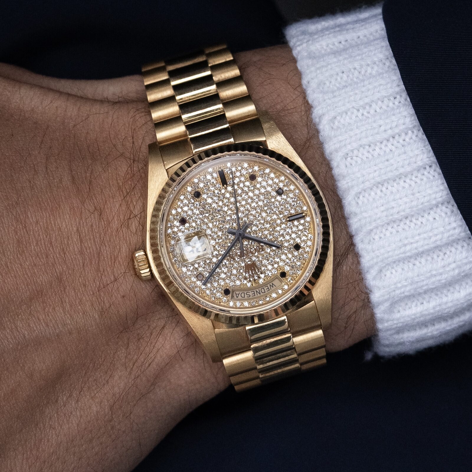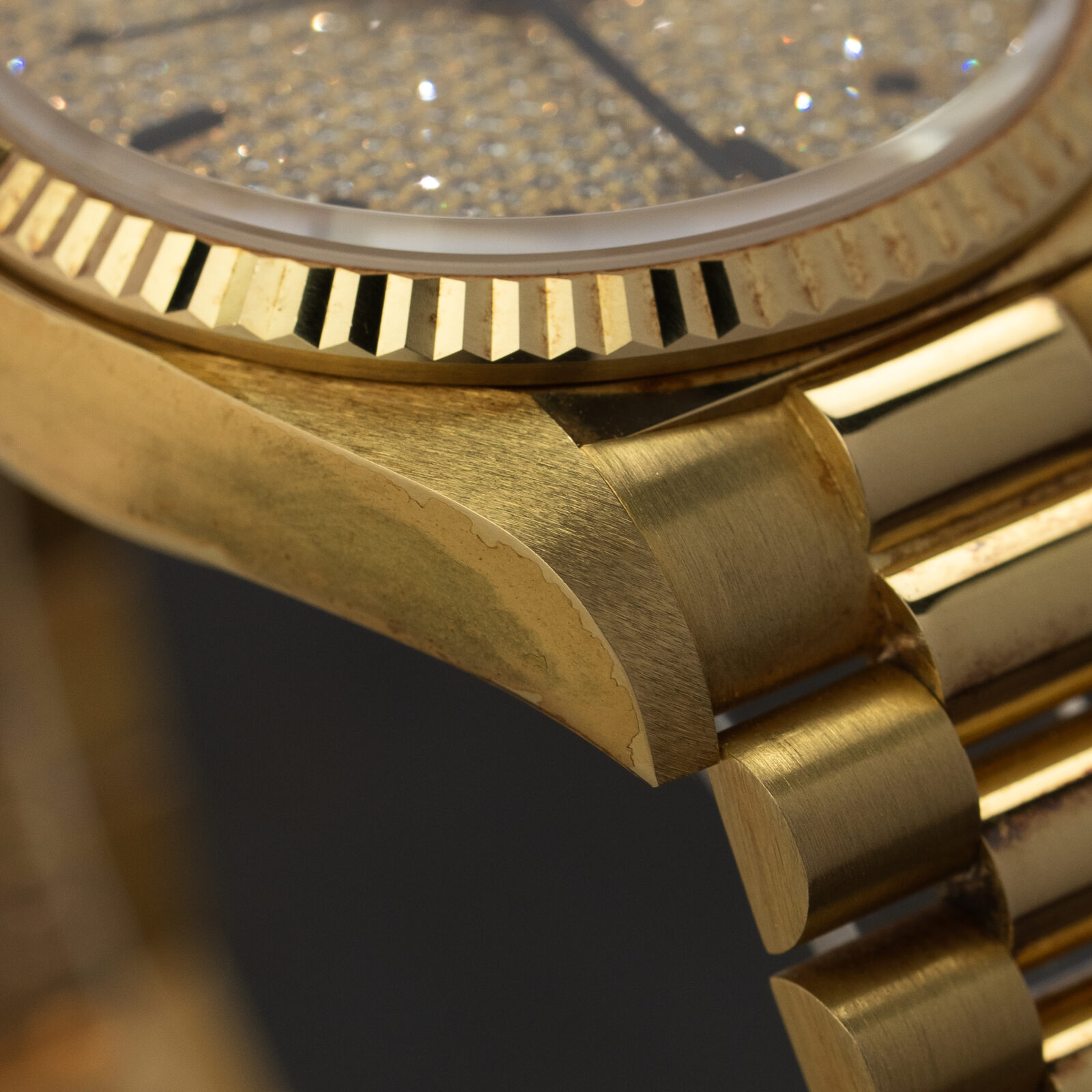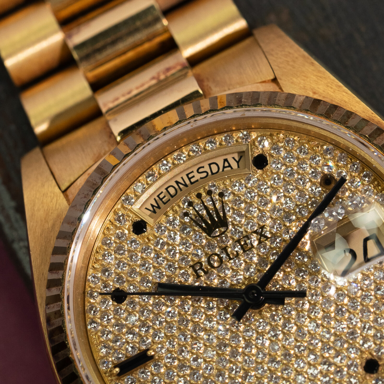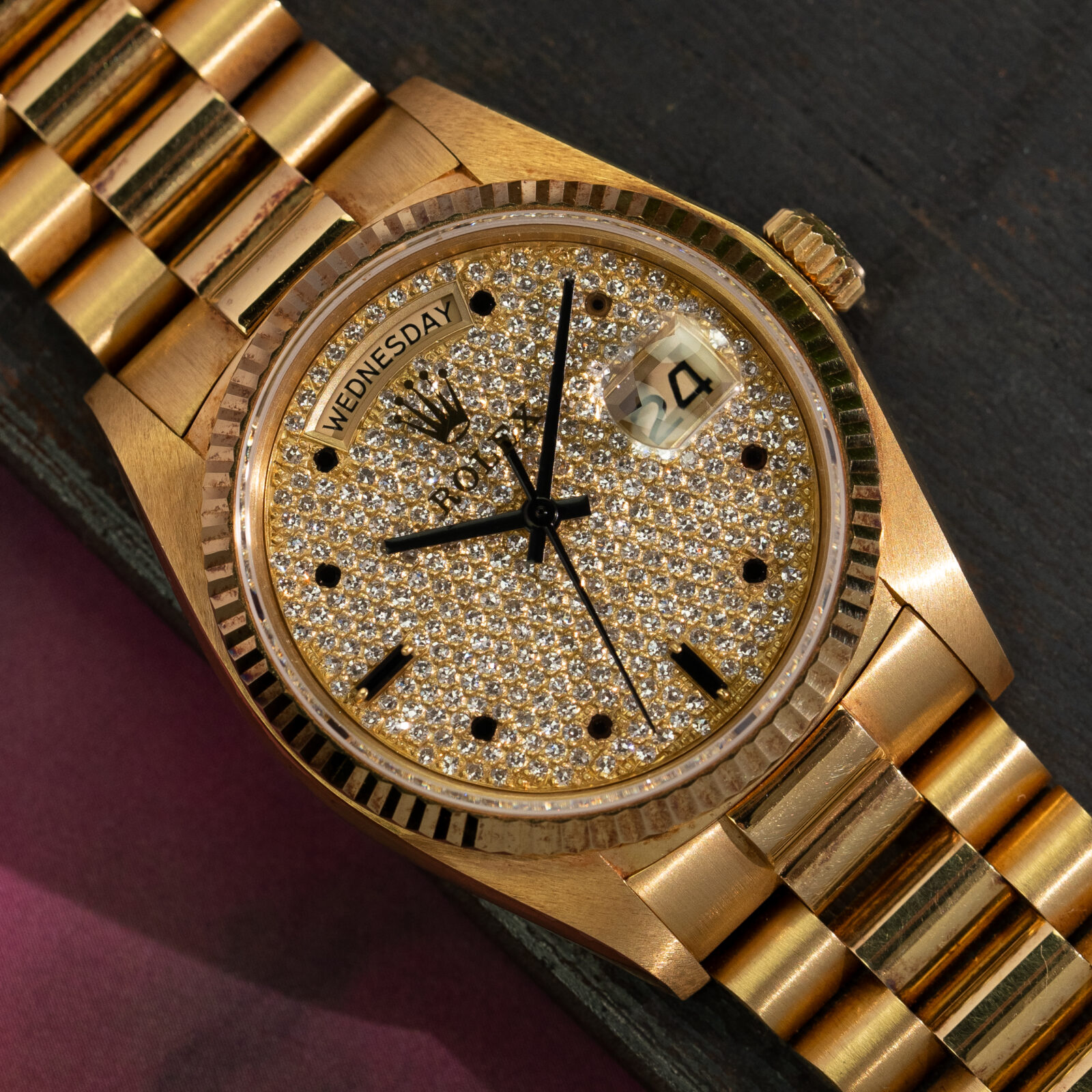 The Rolex Day-Date is a true pioneer: the first automatic, waterproof, chronometer wristwatch that indicated both the date and day of the week. The 18xxx series, introduced in 1978, is the fourth generation of Day-Dates. This ref. 18038 dates back to 1983 and houses Rolex’ caliber 3055 self-winding movement with a single quickset function, allowing for the independent adjustment of the date disc.