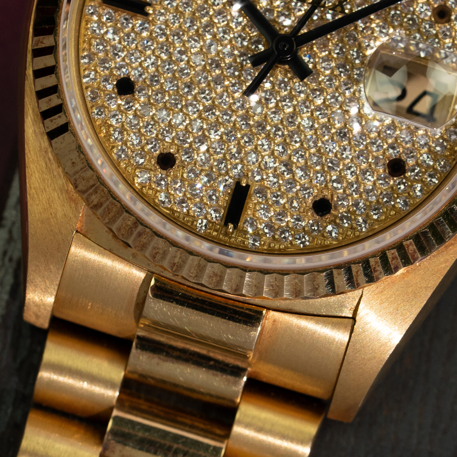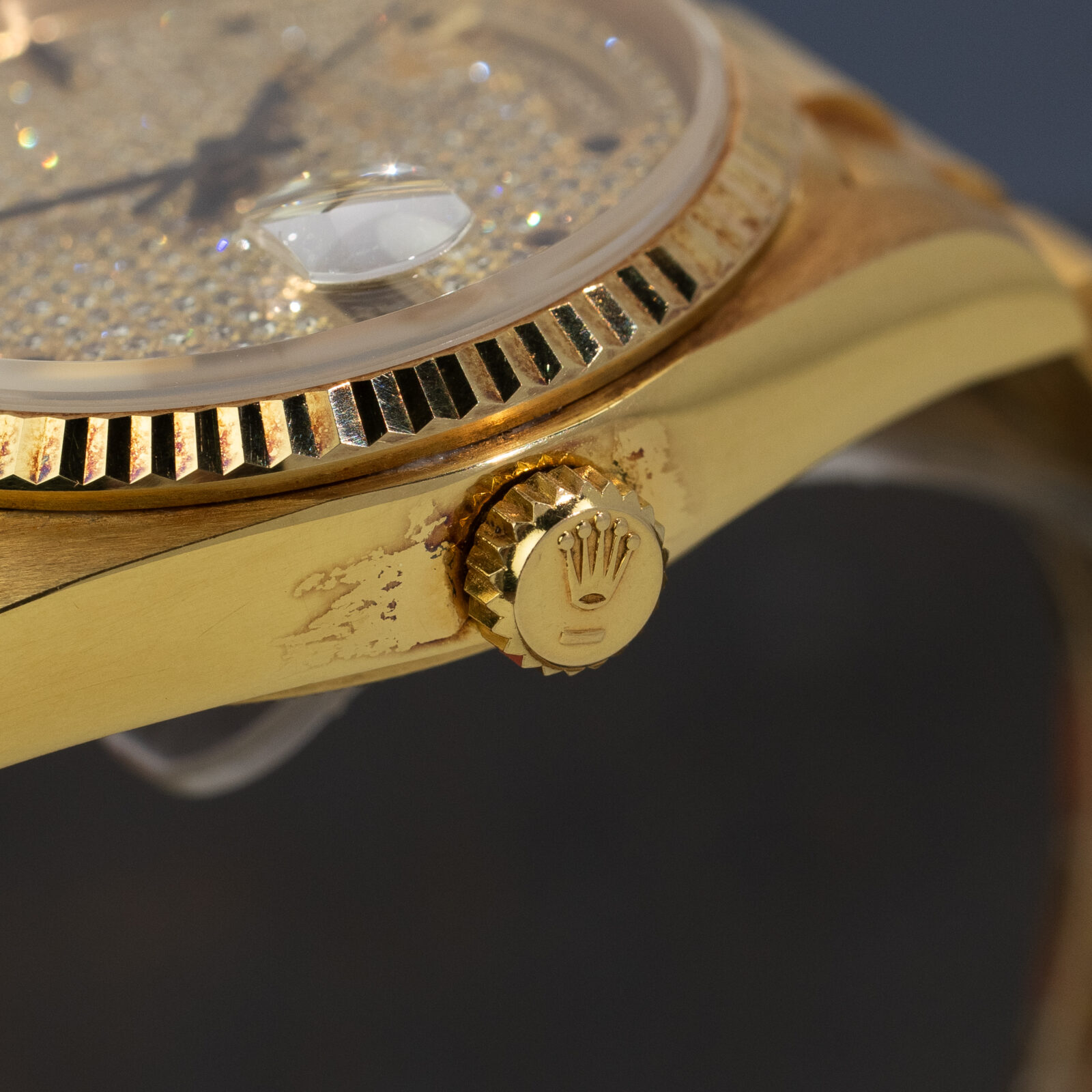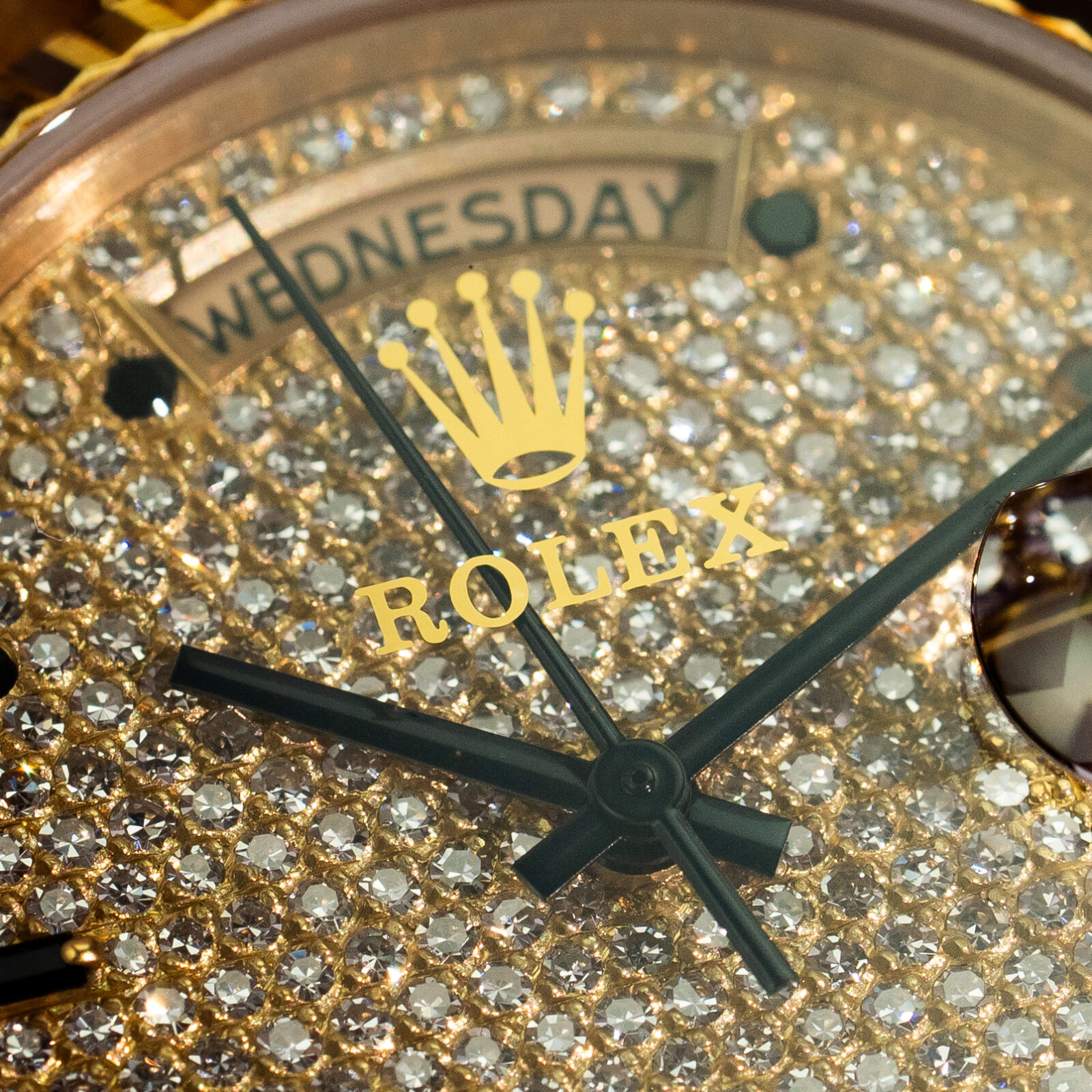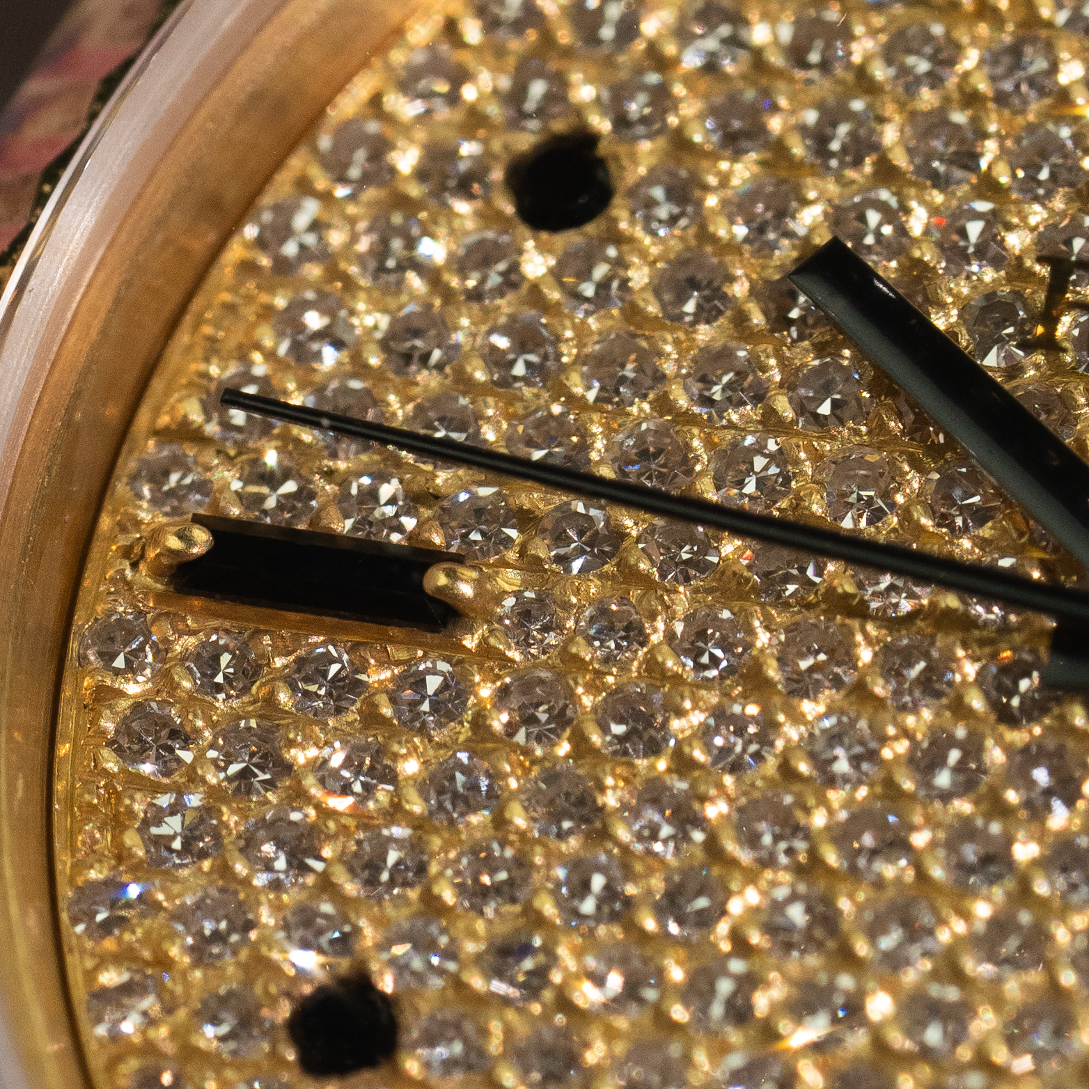 Now the absolute star of the show is the dial that can't be missed. The original, factory diamond paved, dial is filled with brilliant cut diamonds and Onyx on the indices. A combination that is rarely seen and as such Rolex probably believed to keep the integrity of the dial undisturbed. Hence we can see that the Rolex coronet and brand are printed on the inside of the sapphire crystal.