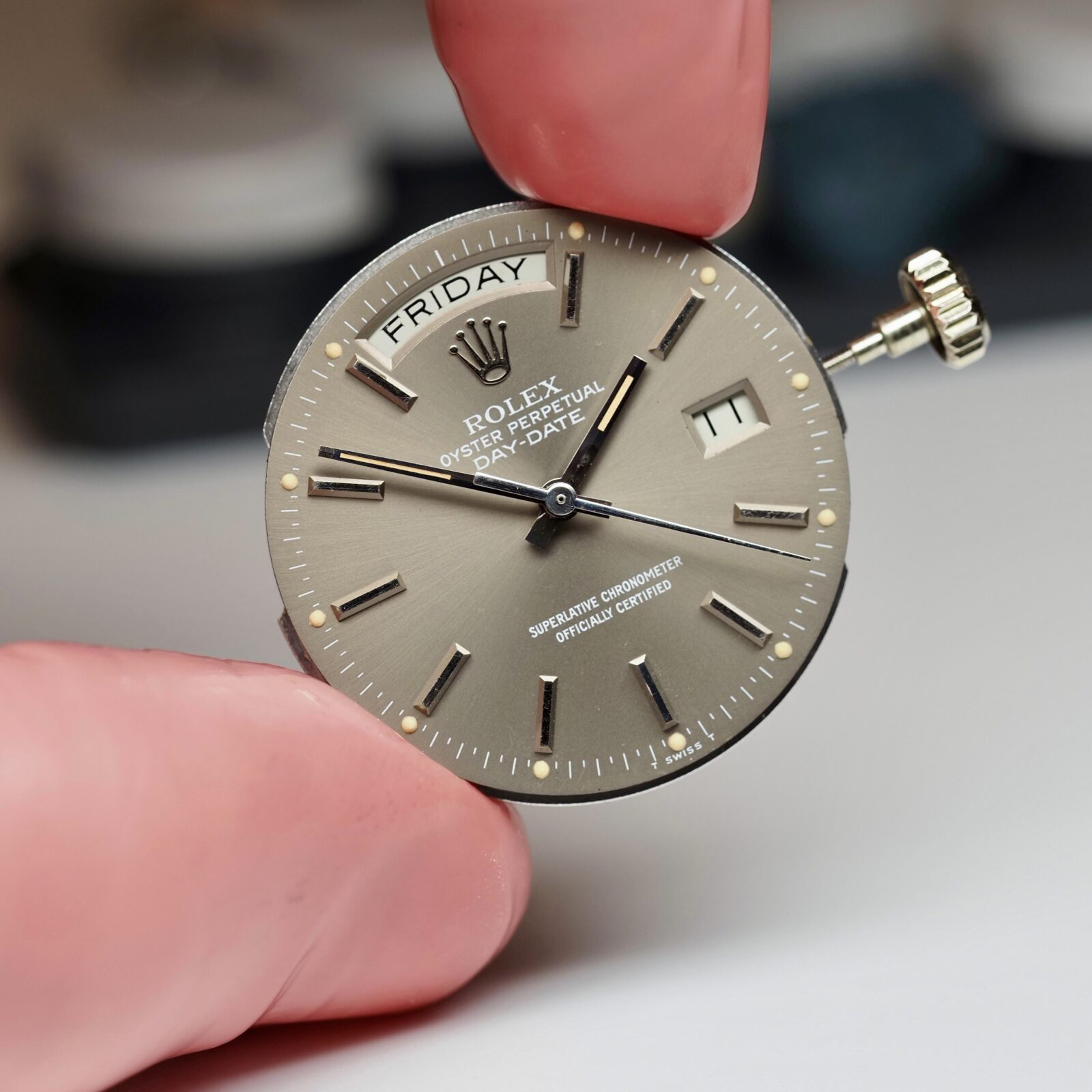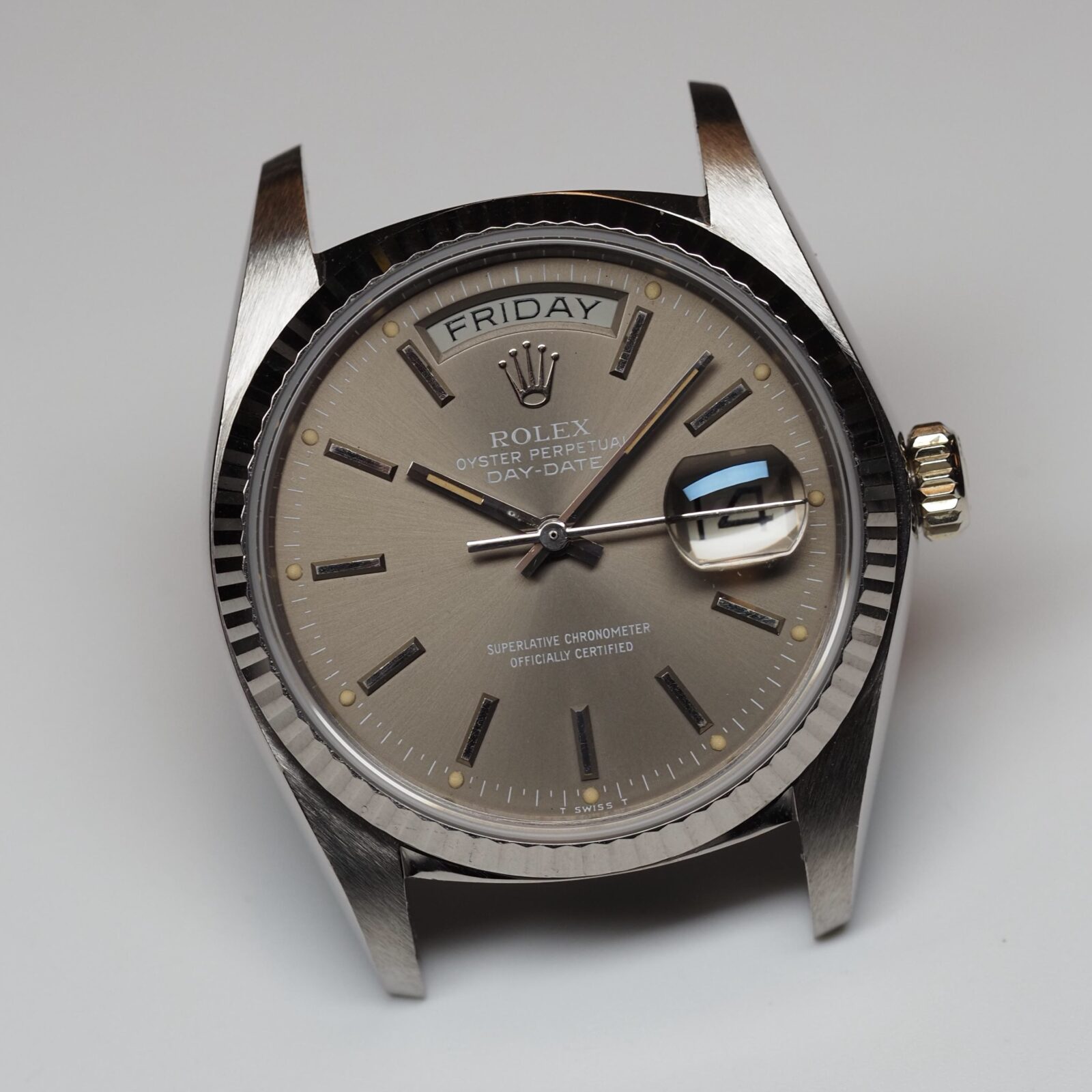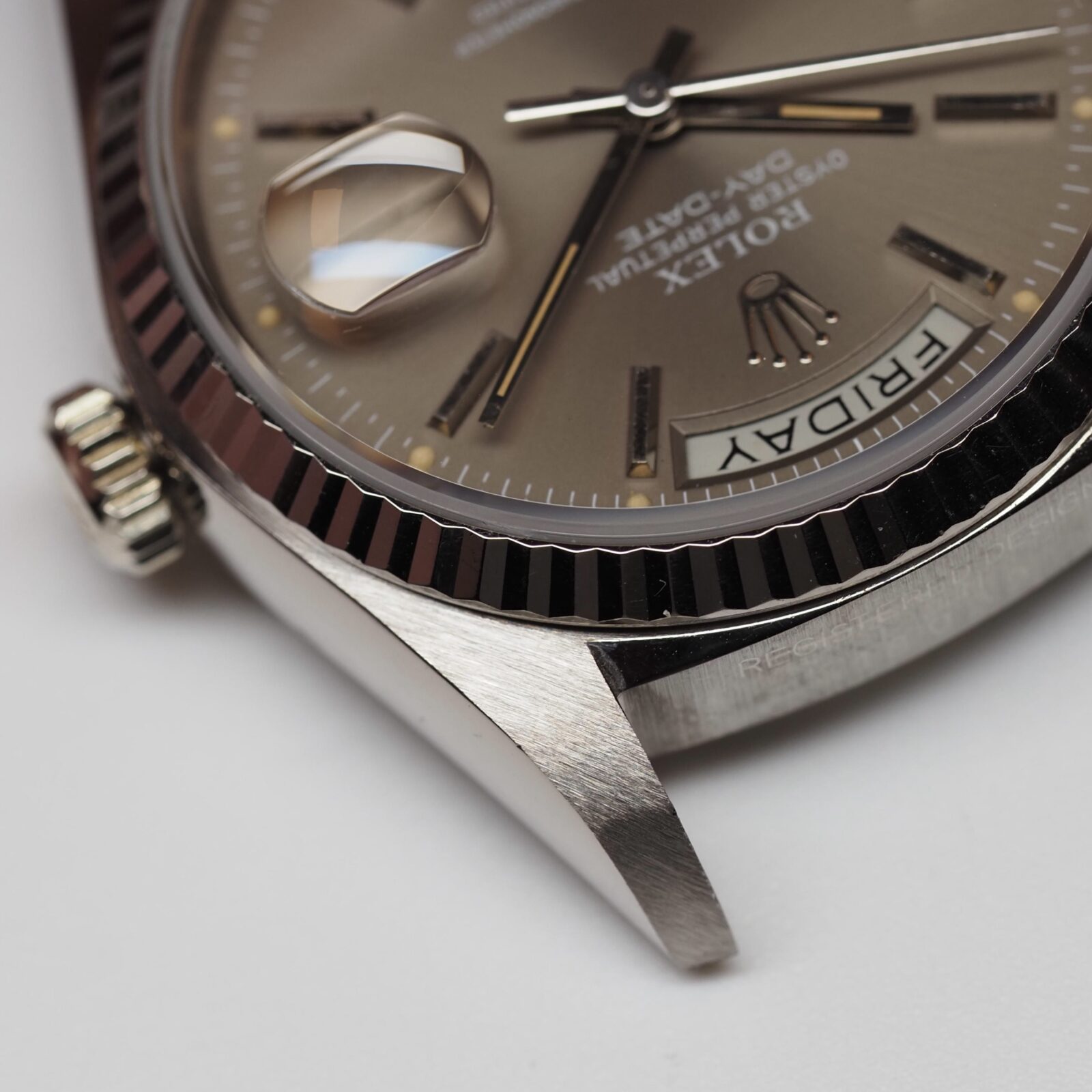 This Rolex Day Date 18039 in solid white gold stands out for its rarely seen taupe dial. The color sits in a refined middle ground between grey and brown and gives the watch a distinctive presence without drawing unnecessary attention. The white printed text is sharp and well preserved, providing clear contrast against the dial surface.