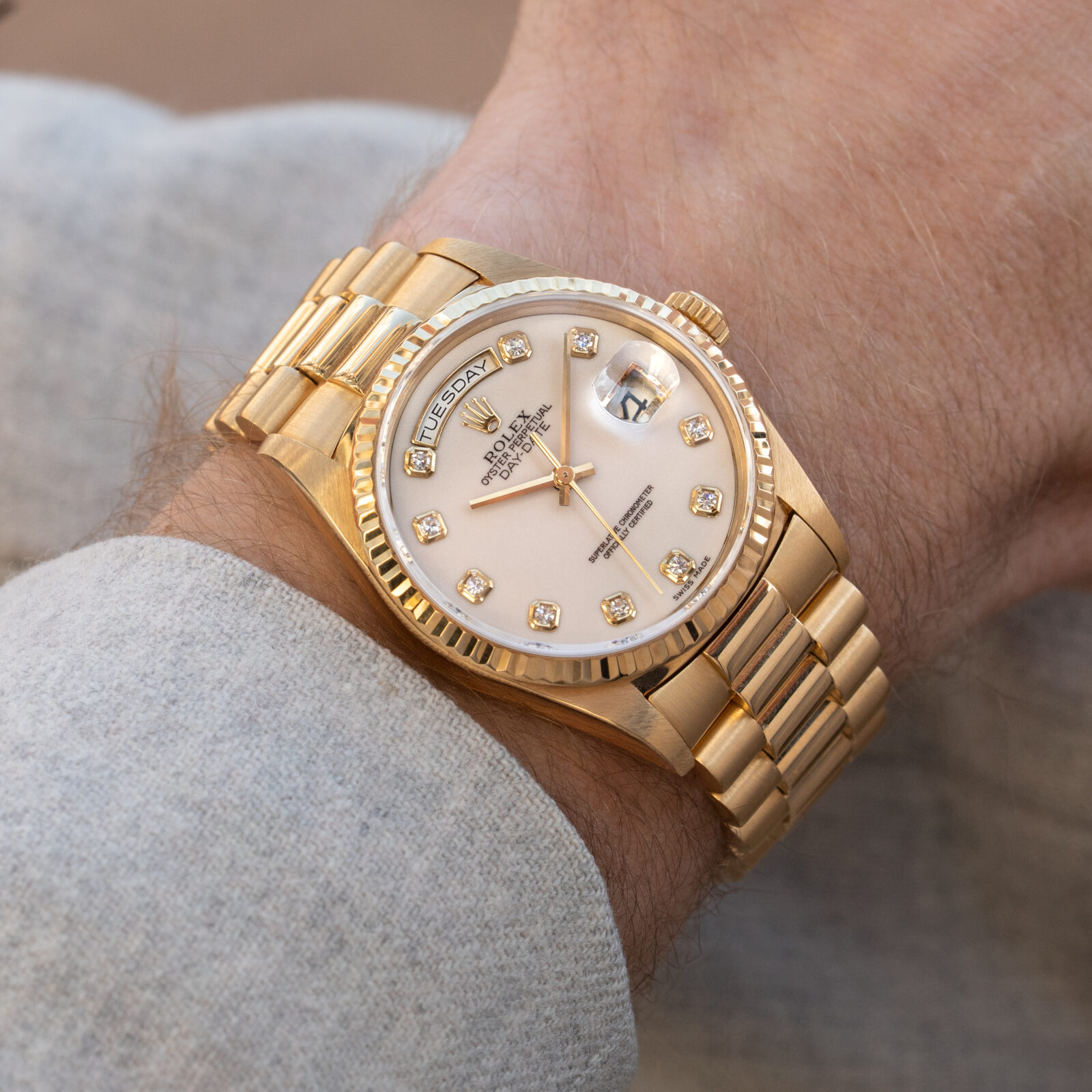 Rolex Day-DateThe very essence of luxurious time-keeping, provided with a day and date function. It was launched in 1956 as a niche model and was only produced in precious metals, the retail price was way costlier than previous models. However, due to its popularity among a lot of prestigious people (for example a lot of Presidents, hence its nickname/ bracelet name), it became Rolex’ flagship model.Over the years this model enjoyed associations with various ‘kinds of people’, from celebrities to Mafiosi (like Tony Soprano). They had all one thing in common: being successful in their area of expertise. To this day the Day-date is still synonymous with prestige and style. With exception of the most modern models the Day-Date comes in at 36mm. Do you earn this watch?