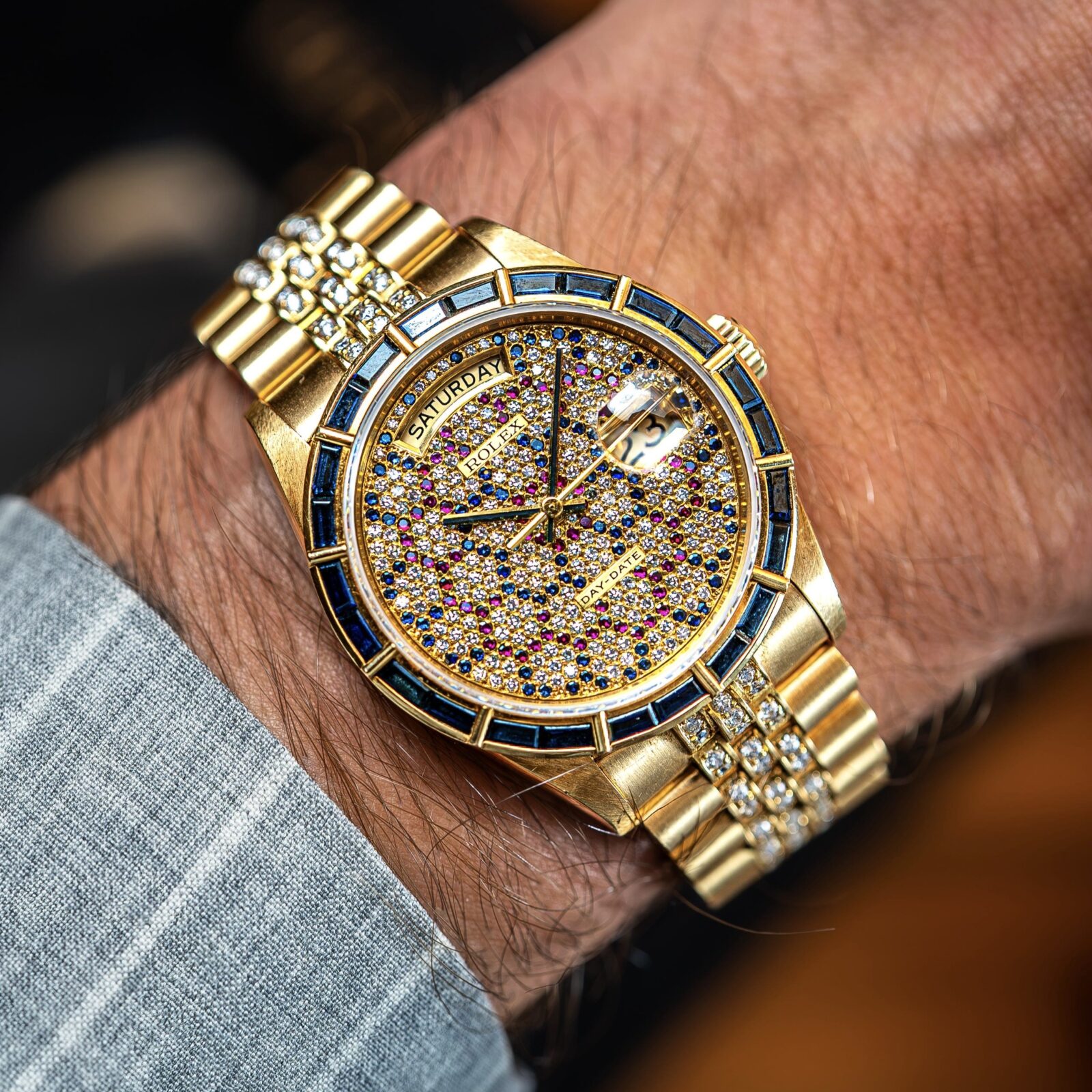 Reference 18168, produced in the 1980s, is a seldom-seen sub-reference of the 180xx series, distinguished by its factory baguette-set bezel. Twenty-four stones frame the case, most often diamonds, but the configuration seen here elevates things further. A master catalogue from the same year as this watch list a sapphire-set example at $25,350, a significant premium over the roughly $11,000 required for a standard Day-Date at the time.