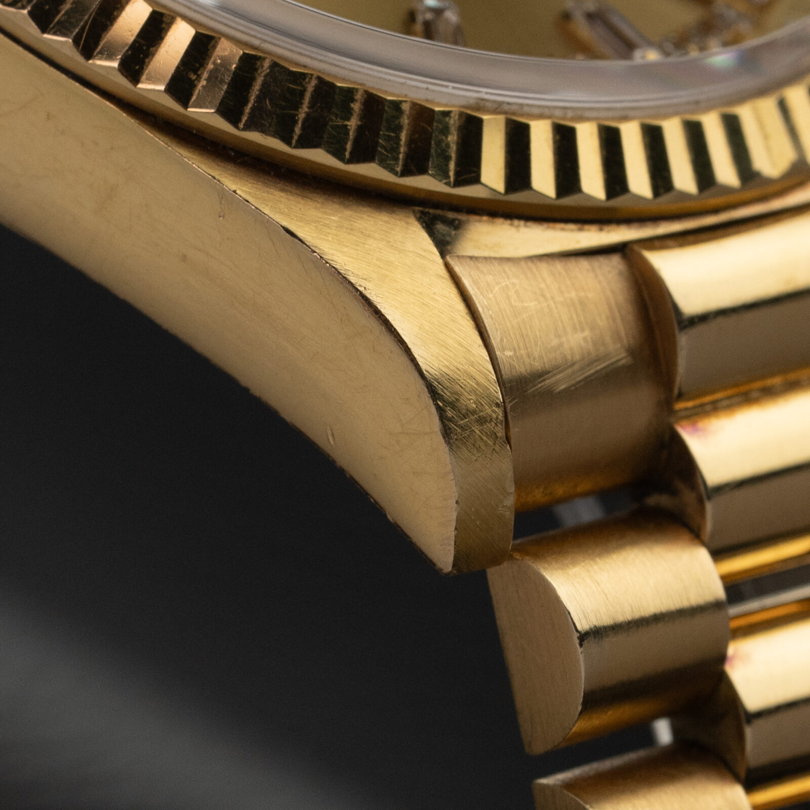 The 36 mm case is executed in 18K yellow gold and is in sharp condition. The iconic President bracelet with hidden folding clasp has virtually no stretch. The star of the show, of course, is the dial. The classic champagne dial is executed with brilliant factory-set diamond markers for minute track and baguettes for the hour track; known as "string dial". It dates back to 1993.
