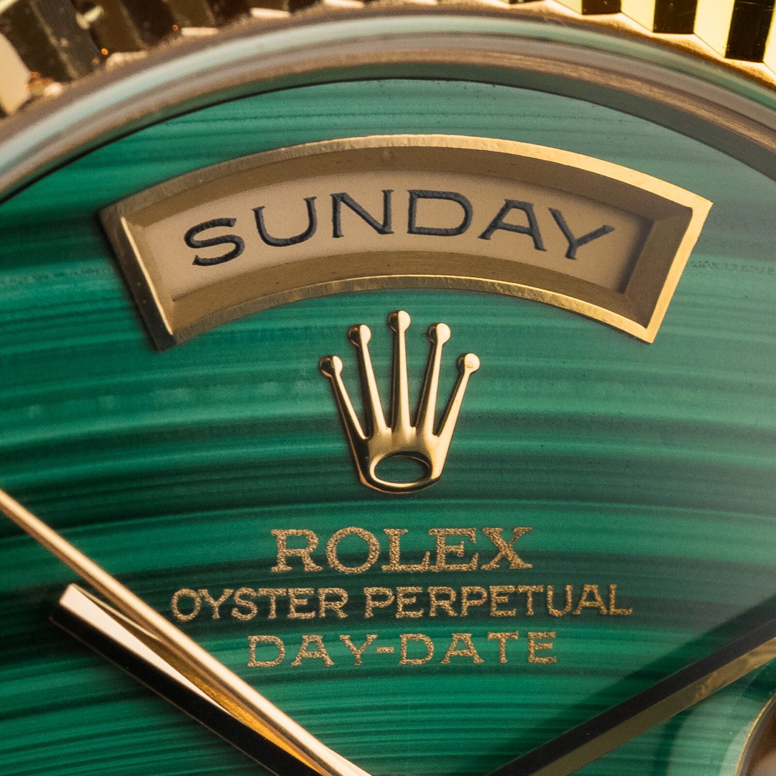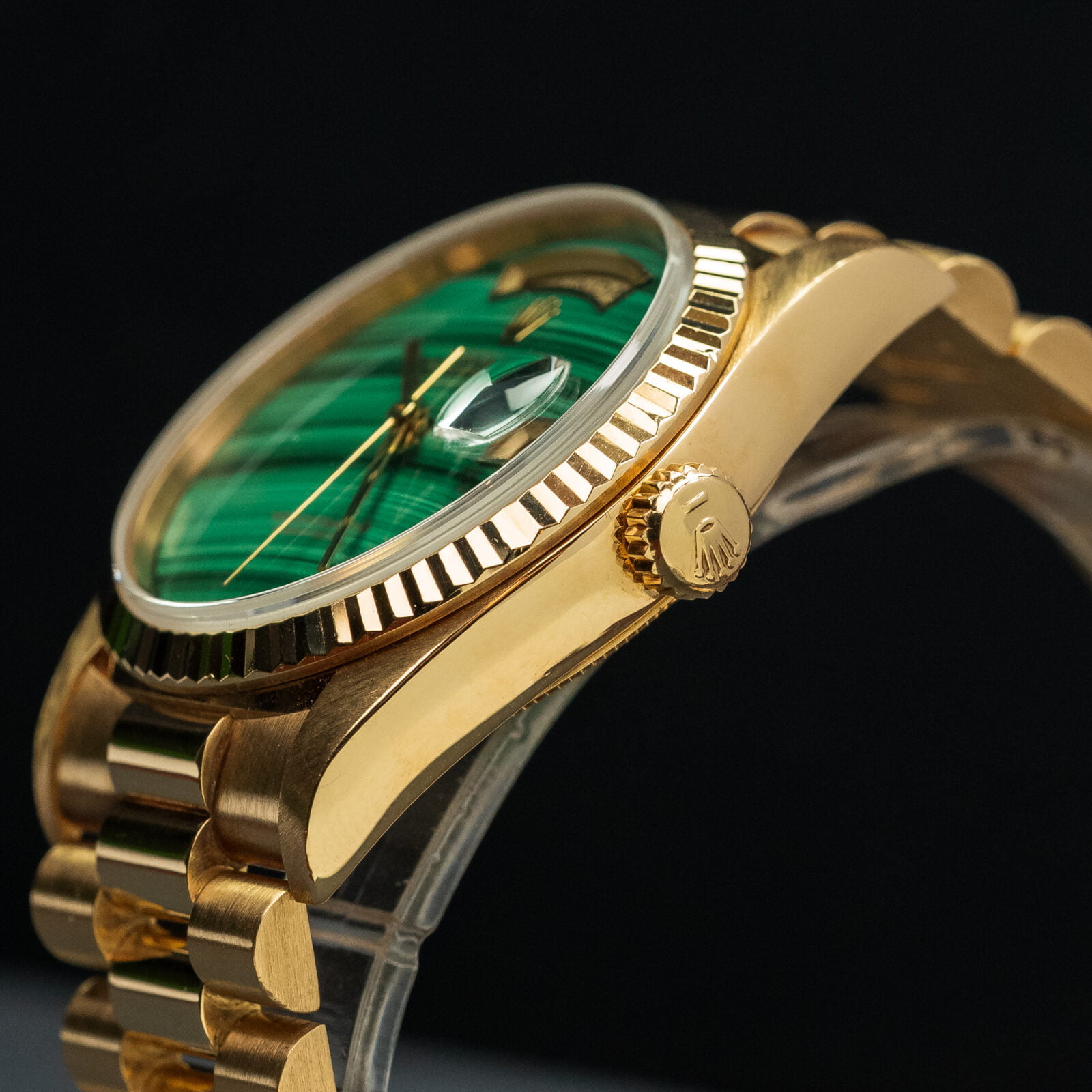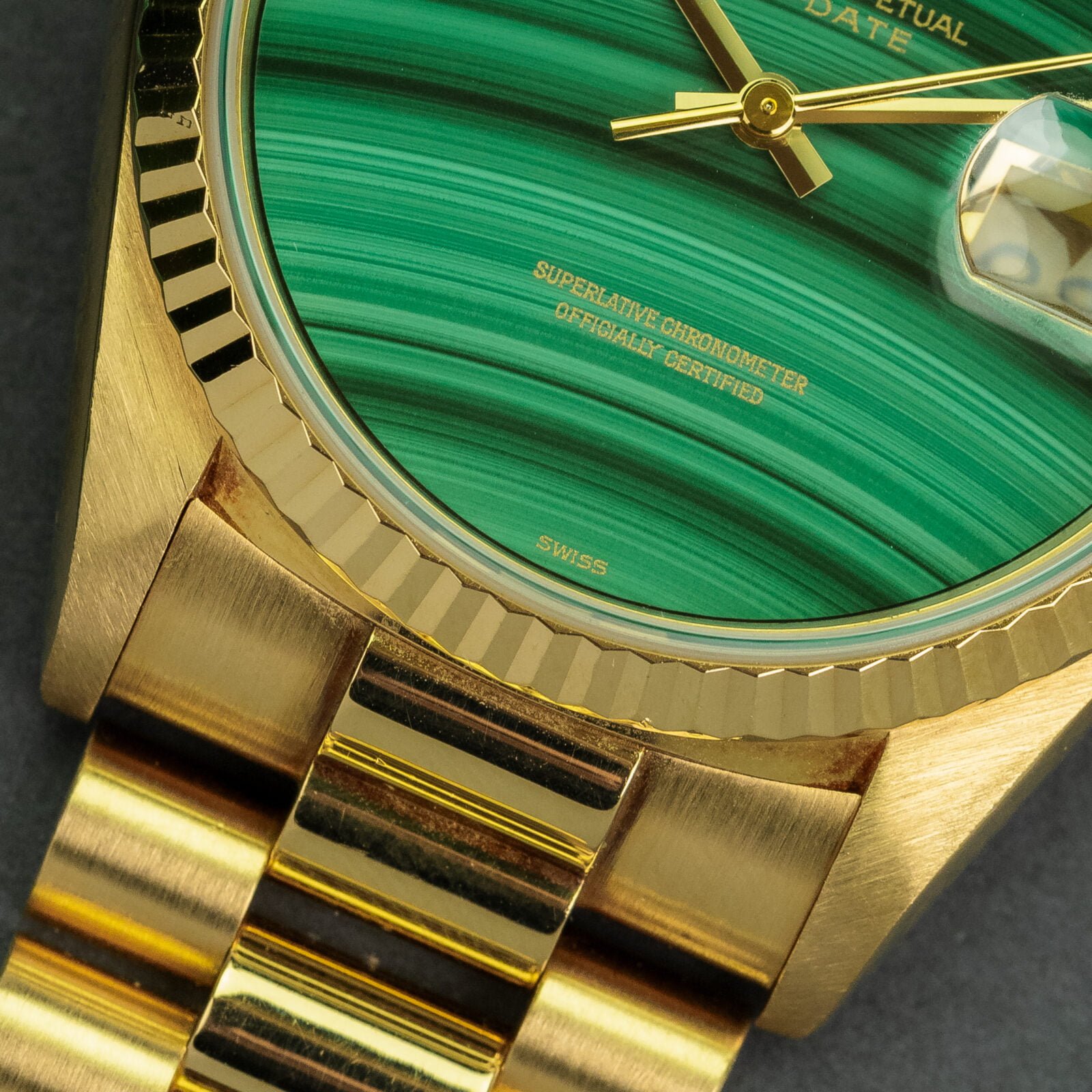 Basically that is all you need to know. This disqualifies about 90% of the, already very few, Malachite dials that are out there. Arguably the most striking type of hard stone that has been used by Rolex in the past. This particular piece being a testamant to that statement. The striped appearance of this mineral, ranging from bright to racing green, is so dynamic and mesmerising. But the overal appearance and aesthetics are just one important factor.