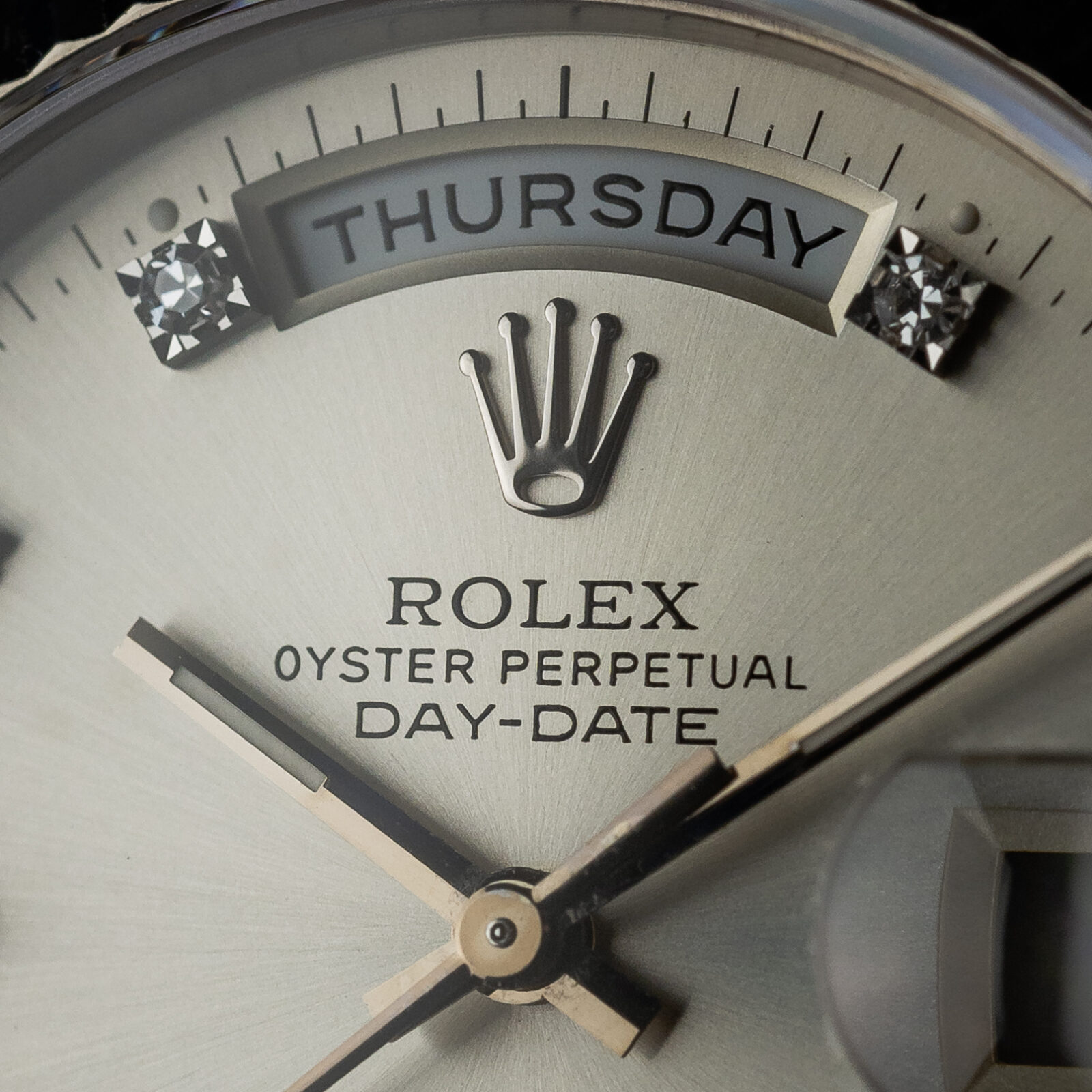 This ref. 18239 combines the 36mm solid white gold case, fluted bezel, matching white gold President bracelet, and classic silvered dial. However, it comes with a bit of "dab of ranch" added to that dial with the inclusion of factory set brilliant-cut hour markers and baguette-cut markers on 6 and 9 o'clock positions.