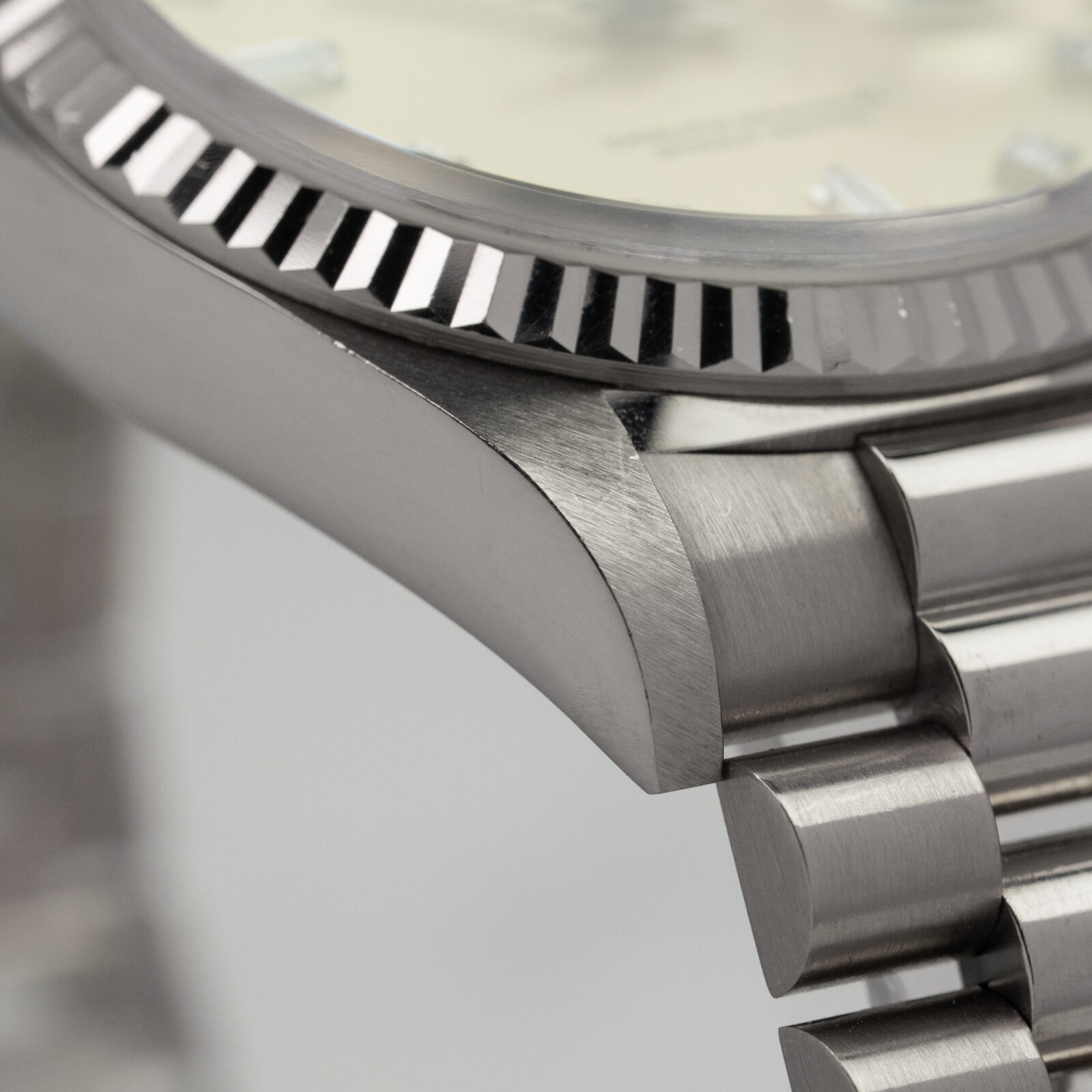 This ref. 18239 combines the 36mm solid white gold case, fluted bezel, matching white gold President bracelet, and classic silvered dial. However, it comes with a bit of "dab of ranch" added to that dial with the inclusion of factory set brilliant-cut hour markers and baguette-cut markers on 6 and 9 o'clock positions.