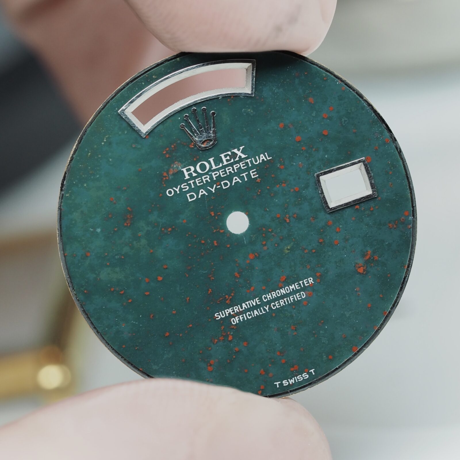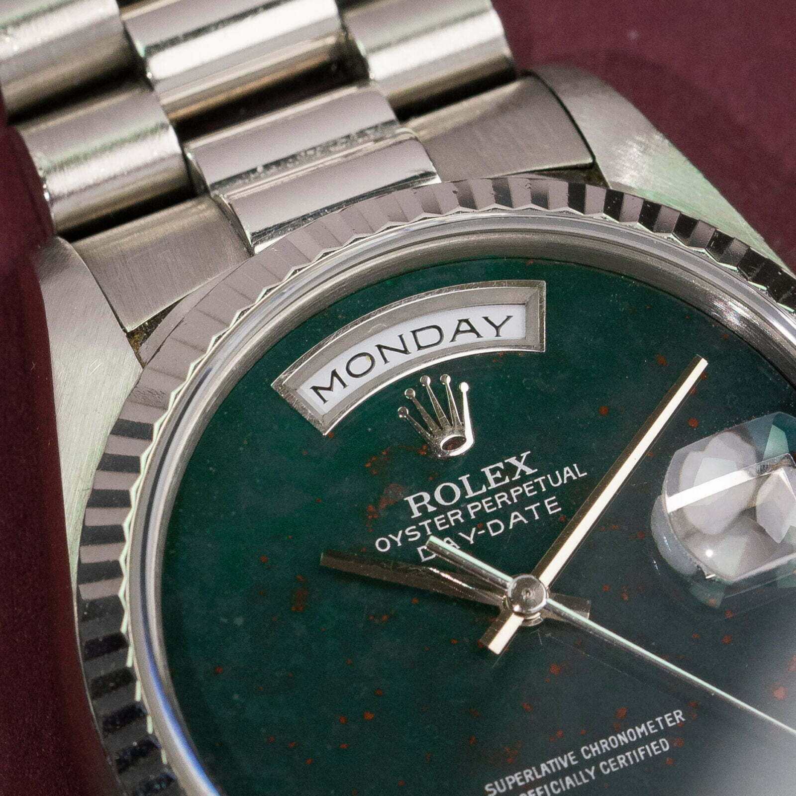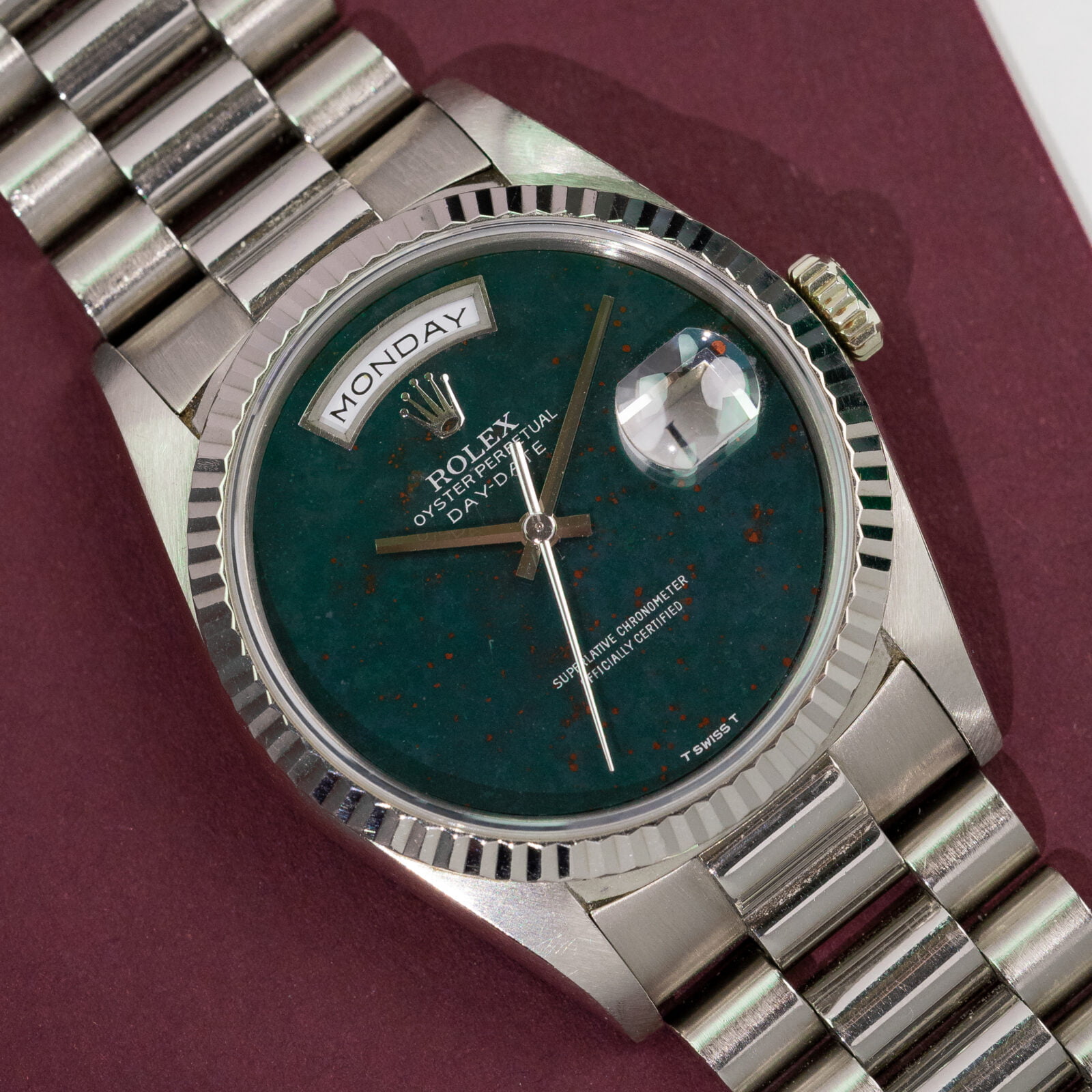 The green quartz variety with an opaque appearance is referred to as Jasper. There are subcategories of this appealing mineral and the most coveted one has to be the Heliotrope, often called "Bloodstone" due to the red speckles caused by Hematite inclusions. The result is a unique and inspiring canvas of complementary colors. There is one more color on this watch that is very significant: white. The print, coronet, hands and day & date aperture are all in white, meaning it has been made for a white metal Day-Date; in this case 18K white gold. Stone dials are exceedingly rarer for white gold than they are for the yellow gold models.
