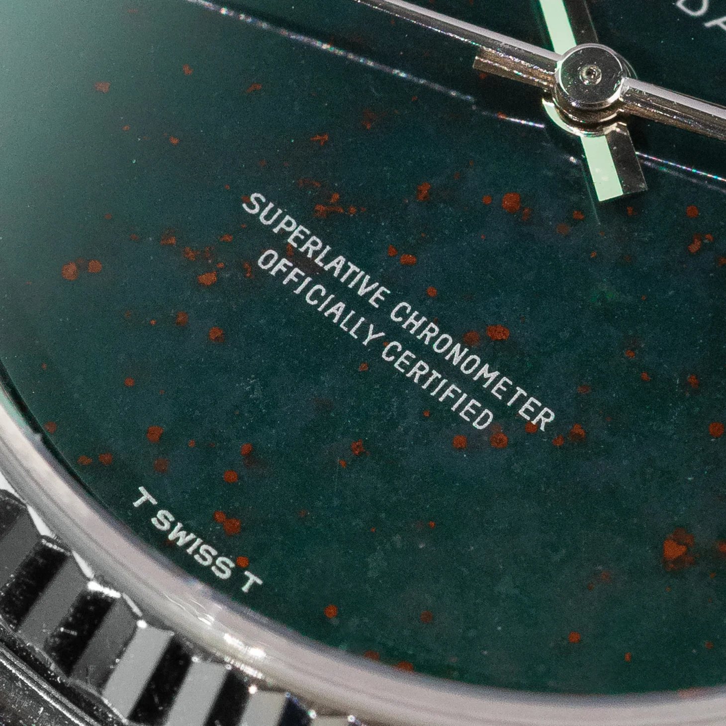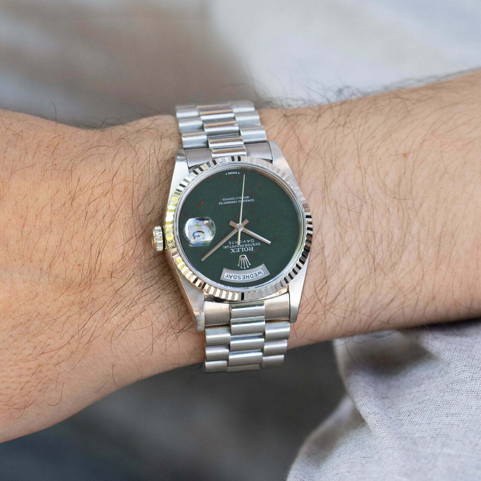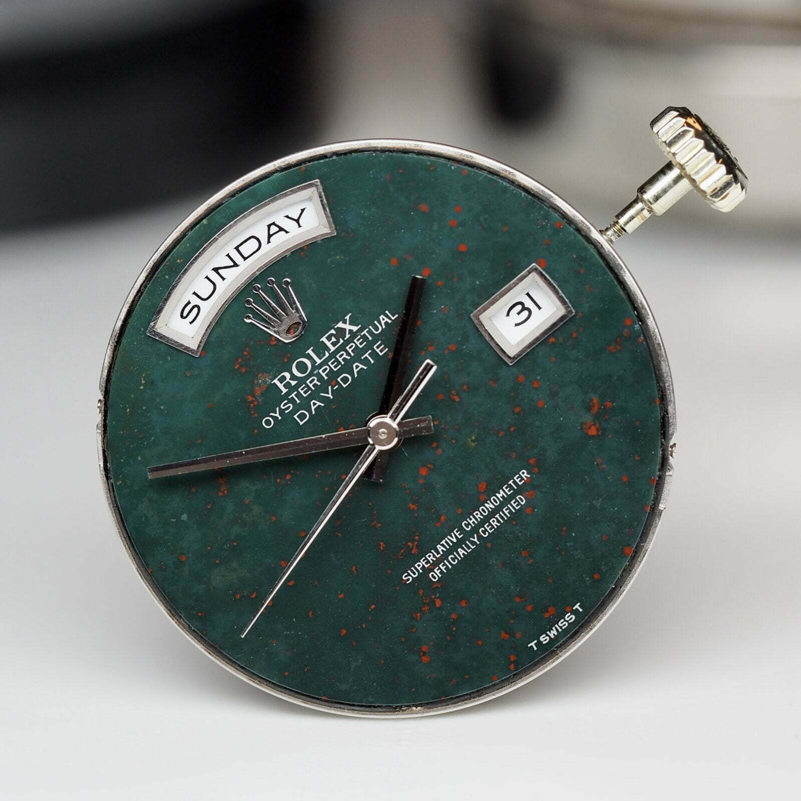 The green quartz variety with an opaque appearance is referred to as Jasper. There are subcategories of this appealing mineral and the most coveted one has to be the Heliotrope, often called "Bloodstone" due to the red speckles caused by Hematite inclusions. The result is a unique and inspiring canvas of complementary colors. There is one more color on this watch that is very significant: white. The print, coronet, hands and day & date aperture are all in white, meaning it has been made for a white metal Day-Date; in this case 18K white gold. Stone dials are exceedingly rarer for white gold than they are for the yellow gold models.