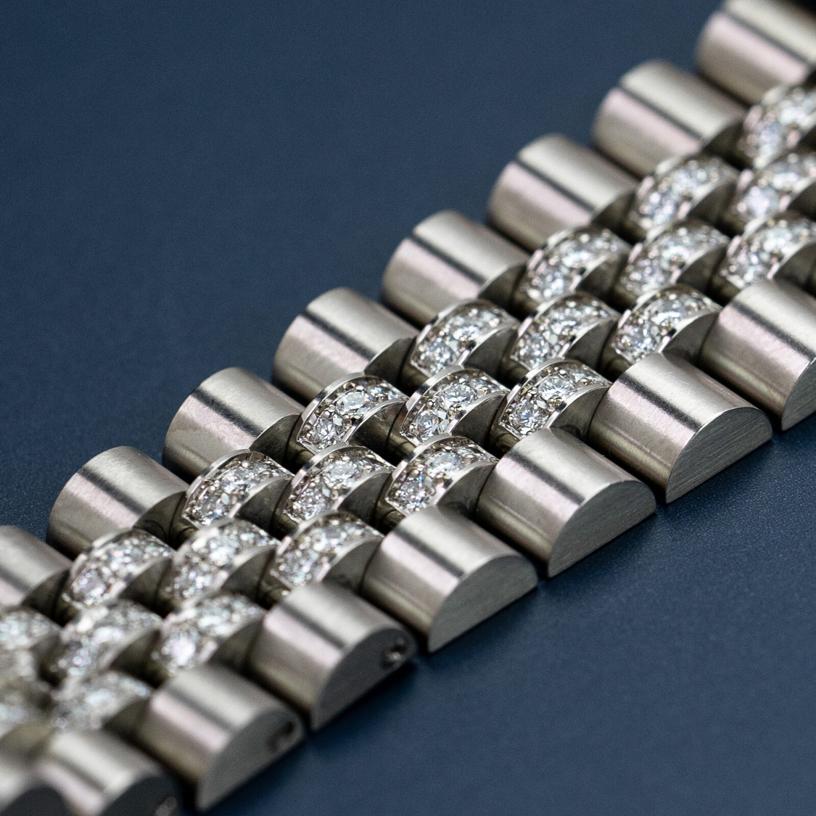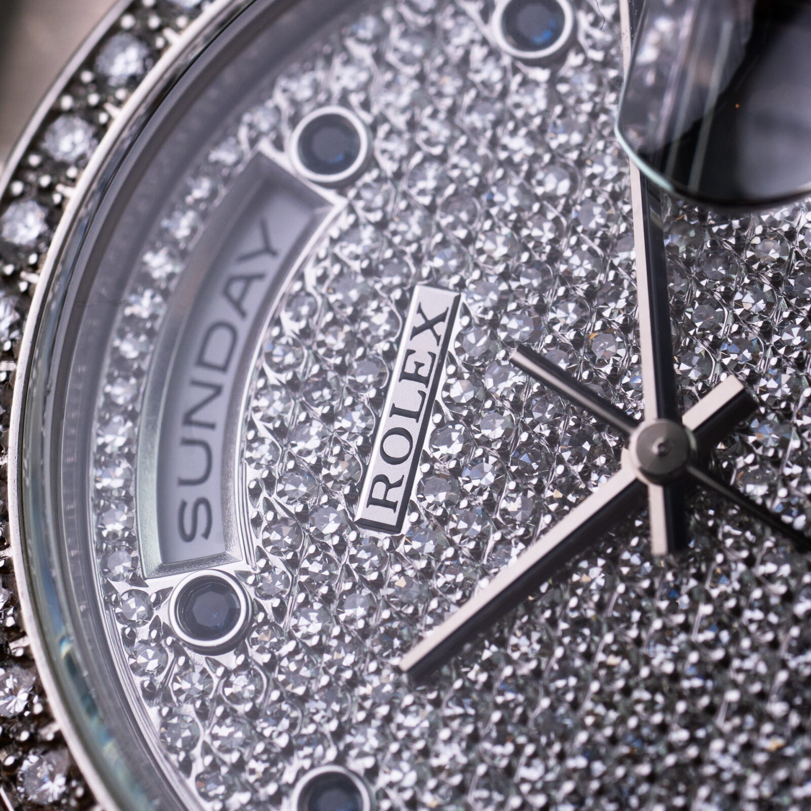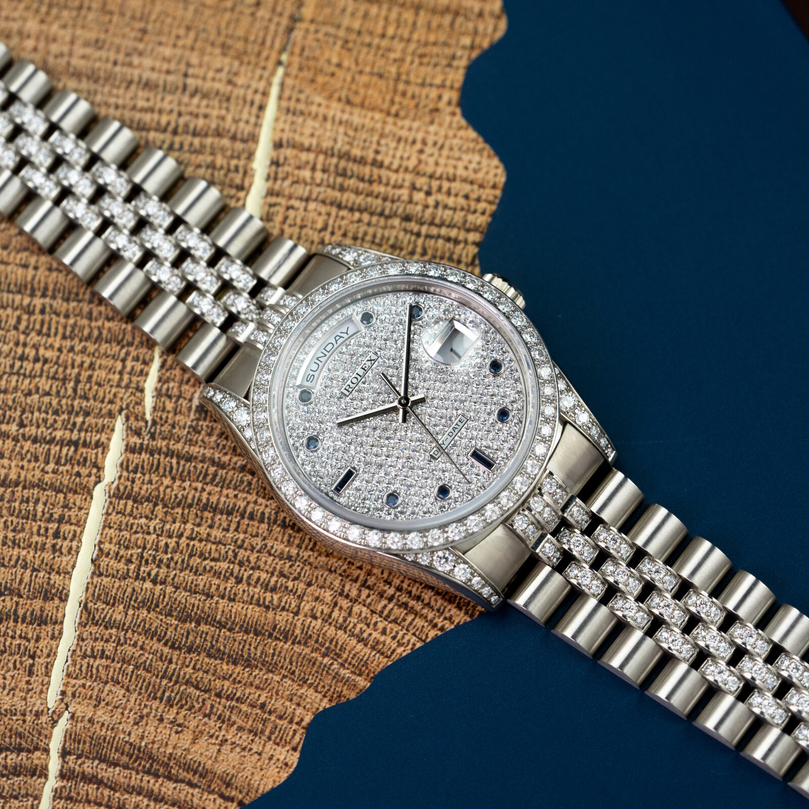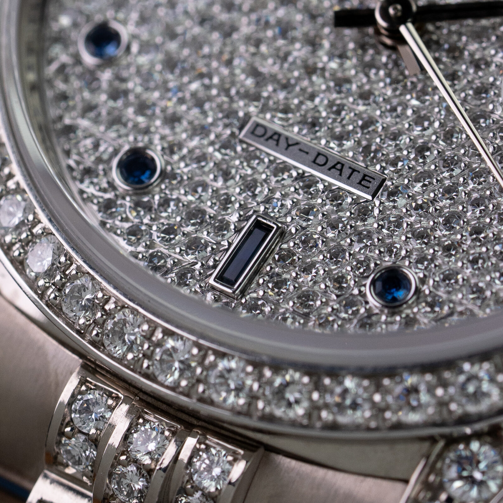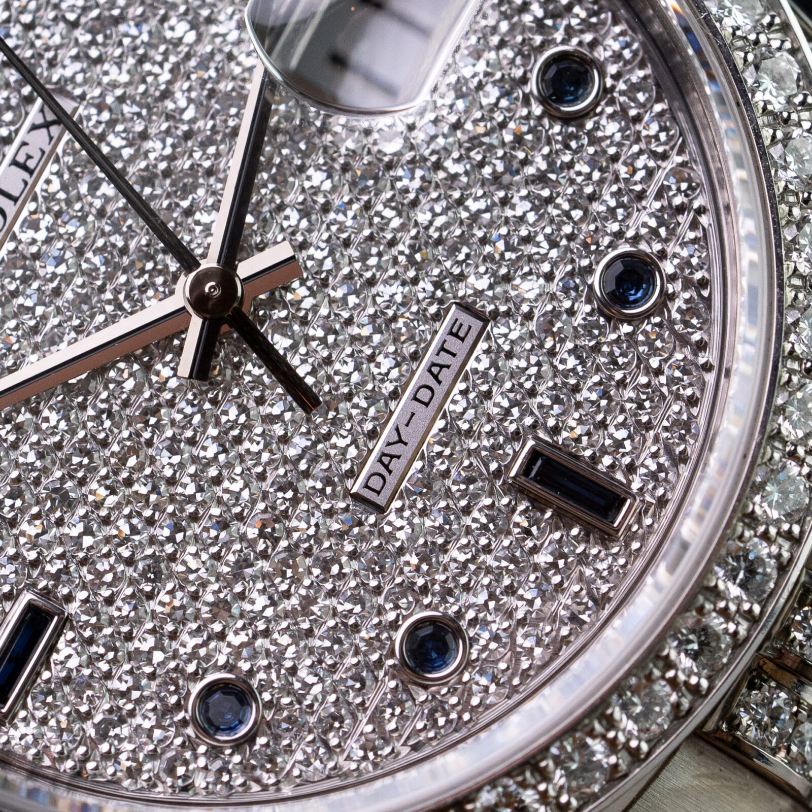 The iconic 36 mm, 18k white gold, Oyster case is adorned with brilliant cut diamonds in various sizes on the lugs and features a diamond-set bezel alongside of it. The dial itself is executed in a luxurious paved diamond setting and features blue brilliant-cut sapphire hour markers in an uncommon round setting and baguette-cut sapphire markers at the 6 and 9 o’clock positions. As the dial is fully set with diamonds, the traditional printed text and the Rolex coronet are replaced by two small applied plaques at the 6 and 12 o’clock positions that read “ROLEX” and “DAY-DATE”.