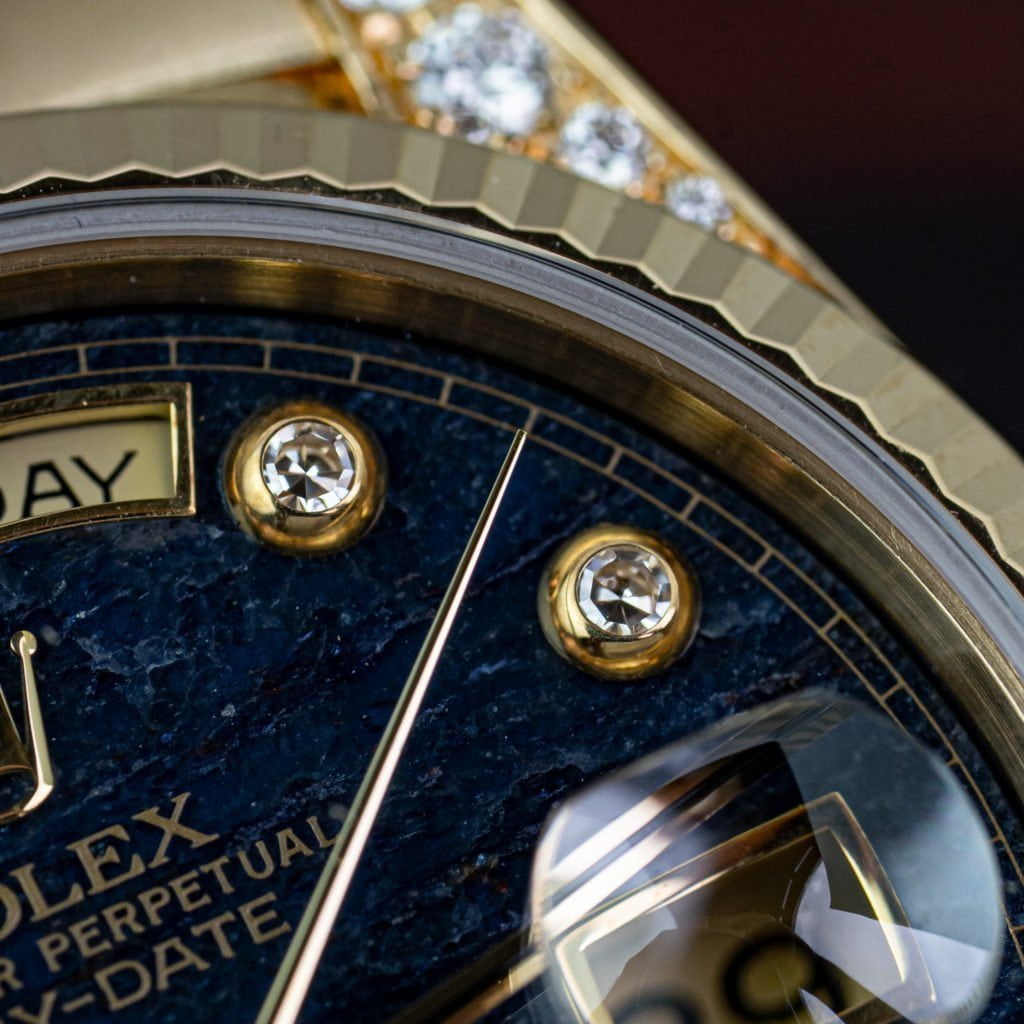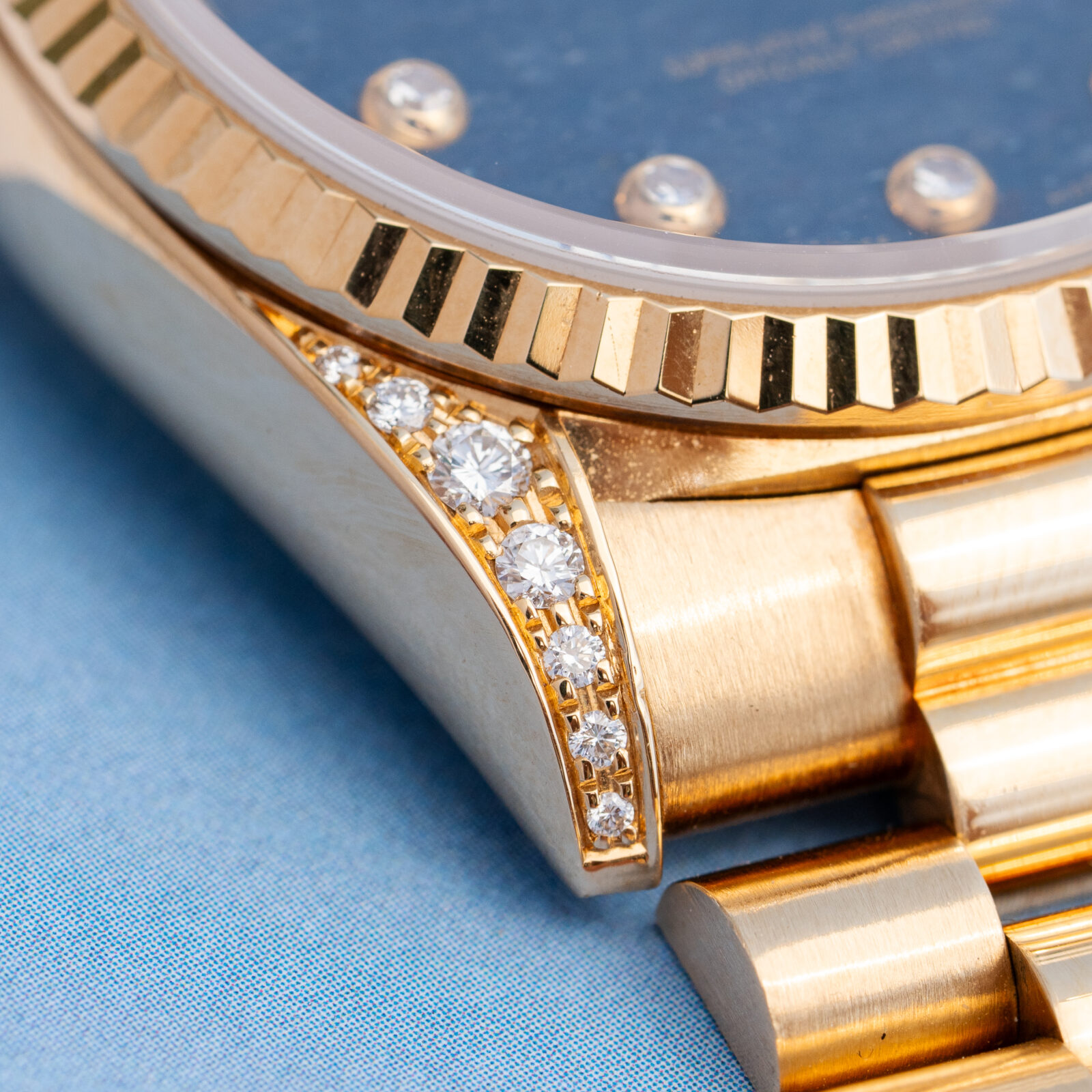 What are the chances of running into an aventurine dial Day-Date in the wild? Close to zero. But there’s no need to leave it to chance. As always, Amsterdam Vintage Watches has got you covered.Aventurine, a quartz mineral, is one of the rarest precious stone dials produced by Rolex. Its name is derived from the Italian “a ventura”, meaning “by chance”. Stone dials are quite fragile and many of them have developed cracks over the years, making a flawless dial like this one uncommon.Aventurine usually occurs with a green color but the inclusion of chrome-bearing fuchsite gives the stone a deep blue sheen, as is the case on this dial. If an aventurine dial weren’t enough by itself, this particular example also features beautiful diamond hour markers in an uncommon round setting.The 36 mm 18k yellow gold case comes with its own special reference number (18338), with the first ‘3’ indicating that the case is adorned by brilliant cut diamonds in various sizes on the lugs. As the 18338 is a sub-reference of the 182xx-series Day-Dates, it houses the caliber 3155 automatic movement with a double-quickset function. This allows you to independently adjust the day, date, and time.The watch is in amazing condition and comes on an exceptionally tight 18k yellow gold President bracelet with the classic concealed Rolex clasp.