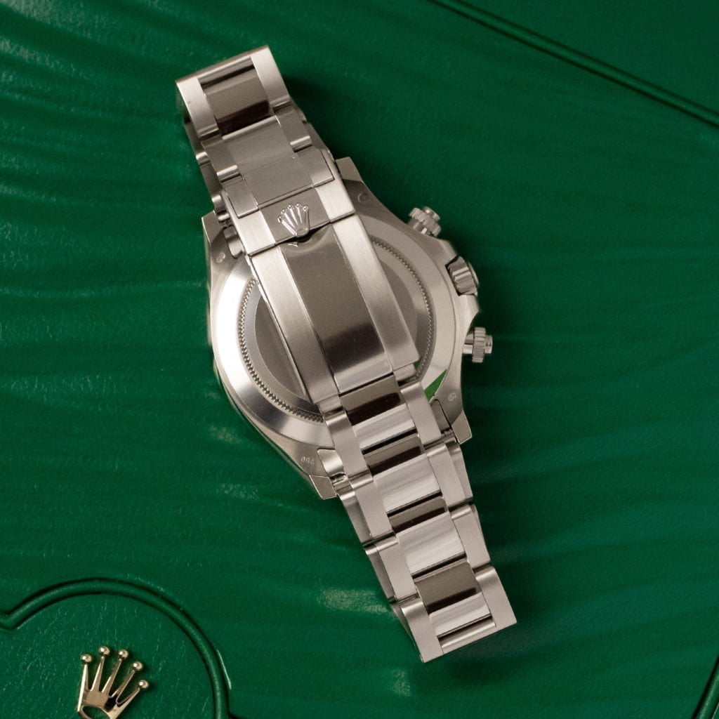 It’s time for an ‘Automatic Daytona Only’ thematic drop this week!The ref. 116509 is the stealth-wealth Daytona. While it may look like steel to the undiscerning eye, the case and bracelet are crafted from 18k white gold and it’s noticeable as soon as you feel the heft on your wrist. A few weeks ago we had one with a meteorite dial. This time around it’s a stunning blue one!Let’s kick off with the real star of the show: the dial. Rolex unimaginatively calls it a “blue dial”. But that doesn’t do it any justice. It’s a vibrant blue with sunburst effect. The dial features ‘snailed counters’ with red highlights and recessed outer rings at the 3, 6, and 9 o’ clock positions. The red detailing is also at the five-minute hash marks in the dial’s minute track.The watch is just one year old (2019) and is in excellent condition with only a few hairline scratches on the case and Oyster bracelet. The box and papers are included and the watch still has 4 years left on the Rolex factory warranty.