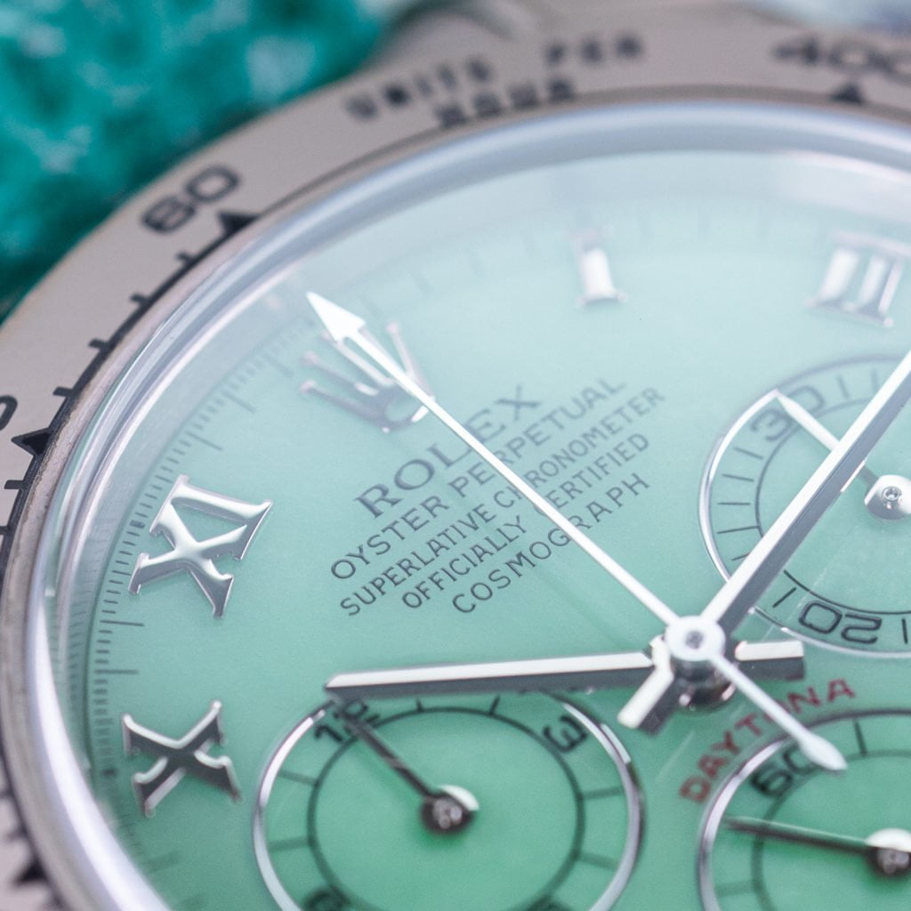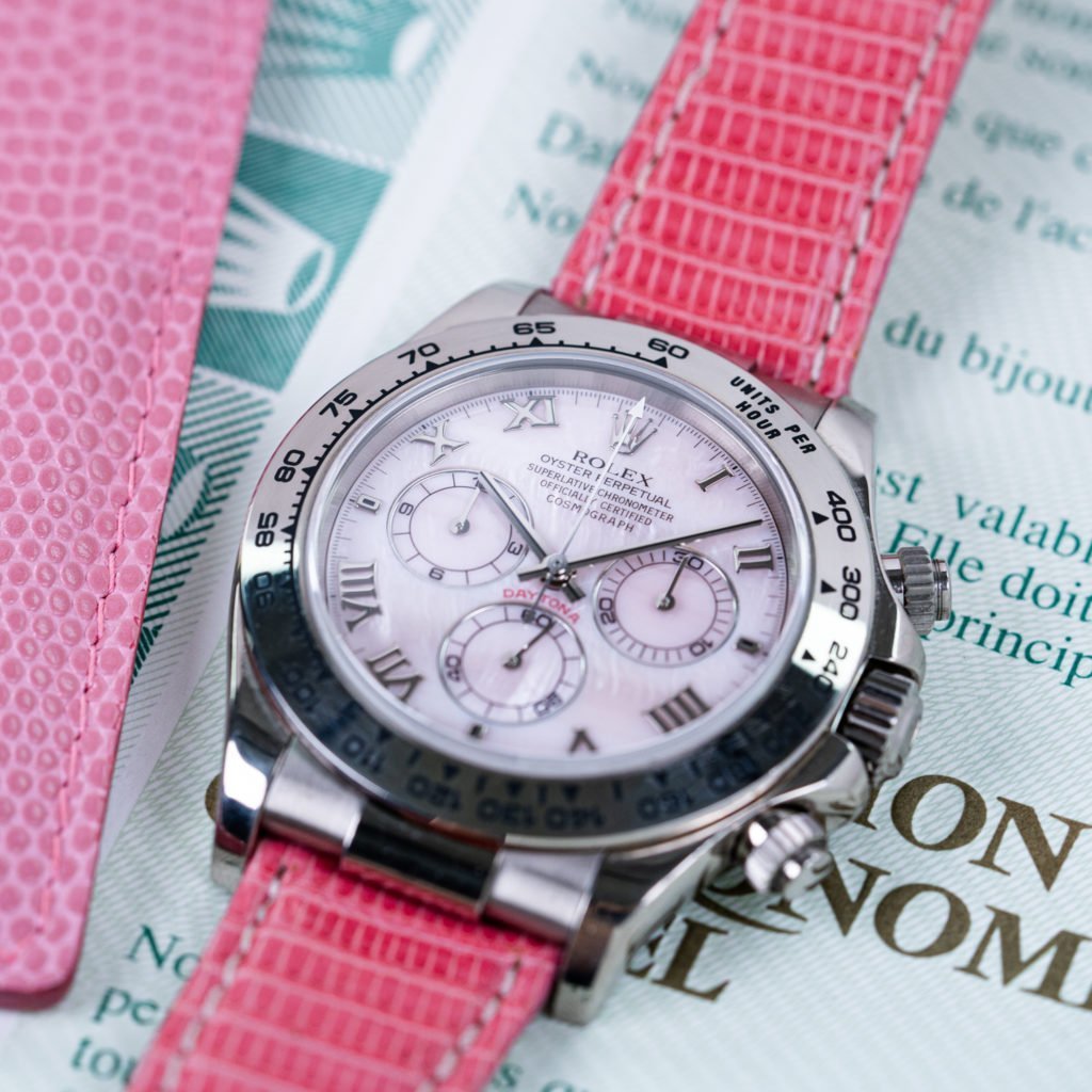 Needless to say, mother-of-pearl and Oysters go hand in hand, Rolex used them in many different models, including earlier examples of the Daytona. For the yellow and pink variety, they also use this beautiful organic material, making each and every dial unique. Depending on the mollusk and the water the colors vary. Rolex only uses the finest nacre out there, with the best luster and smooth surface.