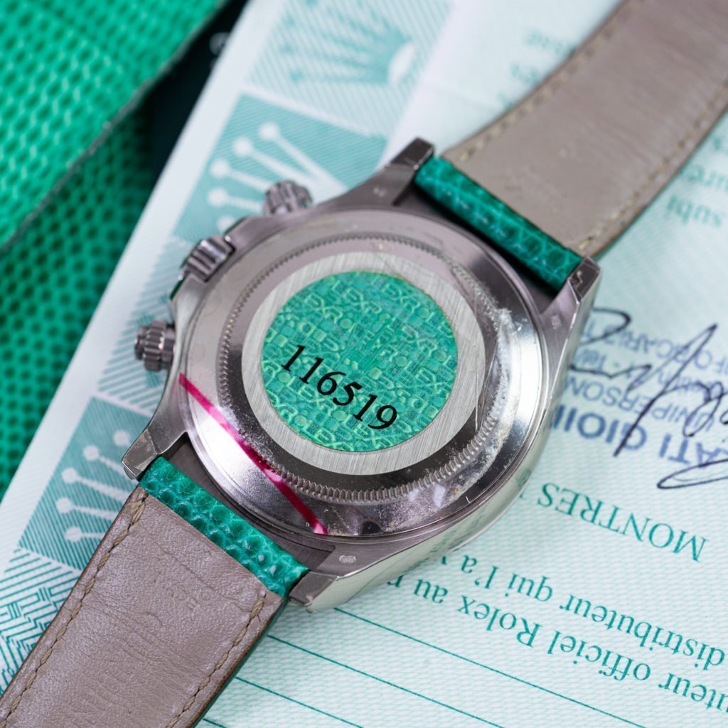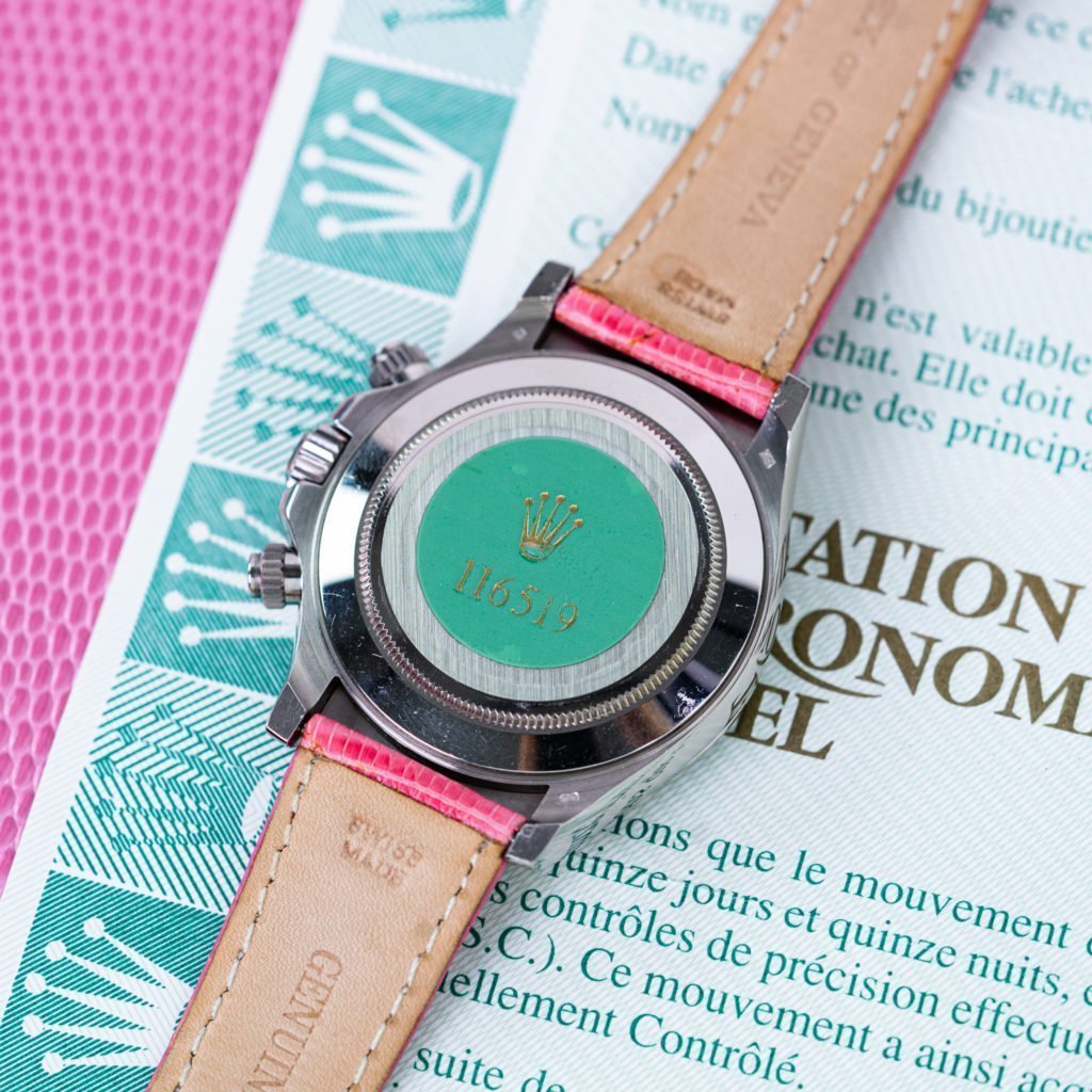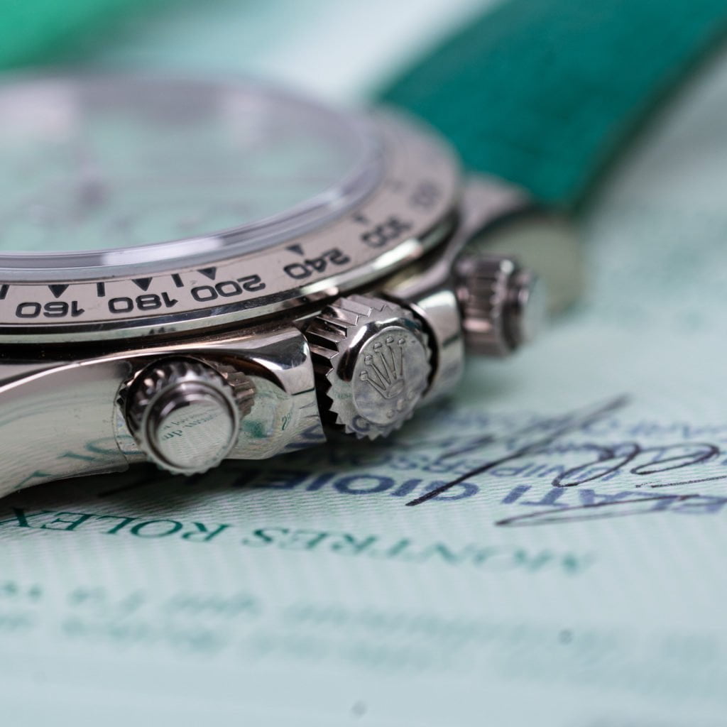 Ever since Rolex incorporated automatic calibers in the Cosmograph, the case size has been 40mm. The last number of its reference, a 9, refers to the use of 18K white gold on all external elements including the case back and bezel. The last mentioned featuring a different design compared to the steel counterpart. On precious metal models a fatter font is used and it features triangles instead of dots and a closed track from 100 to 60.