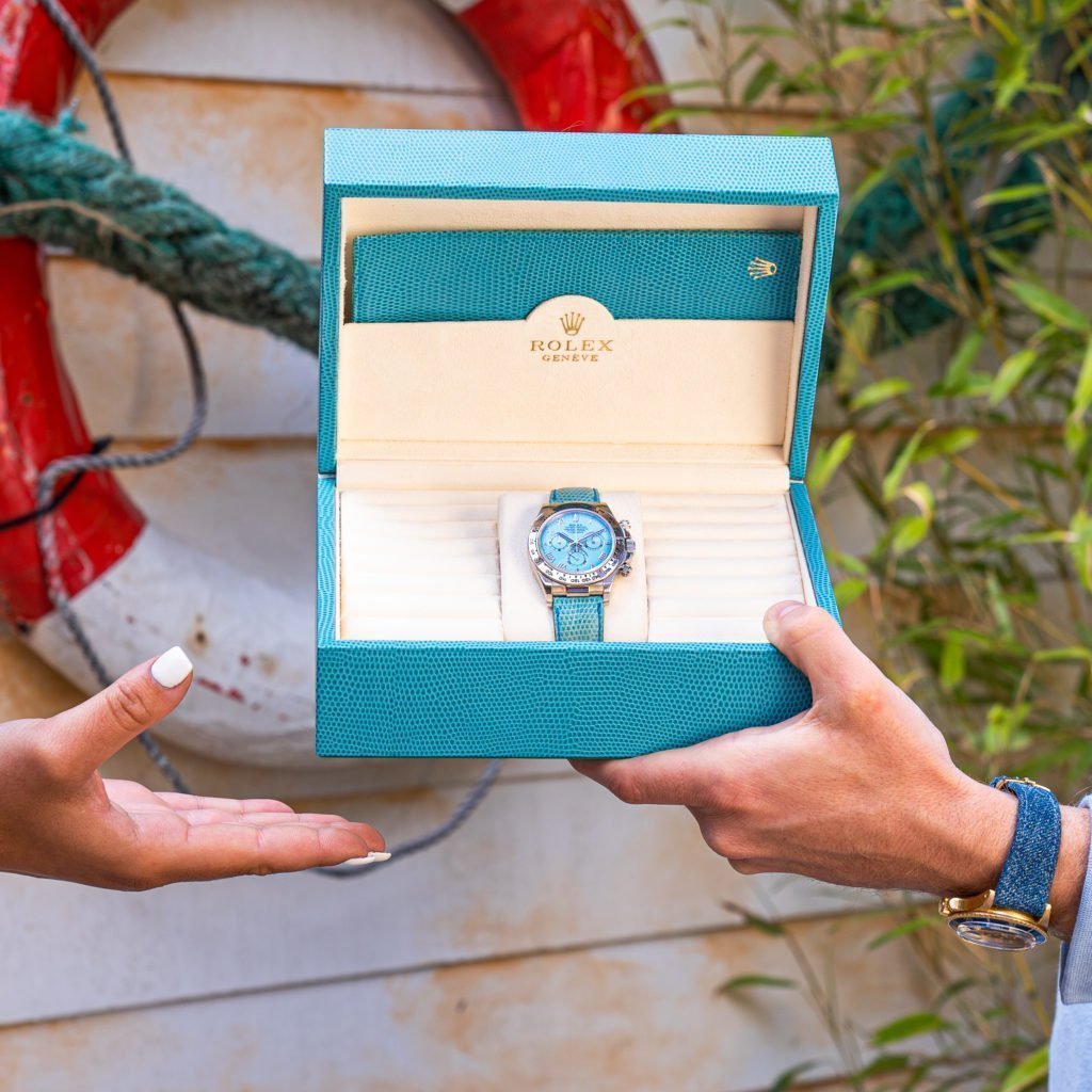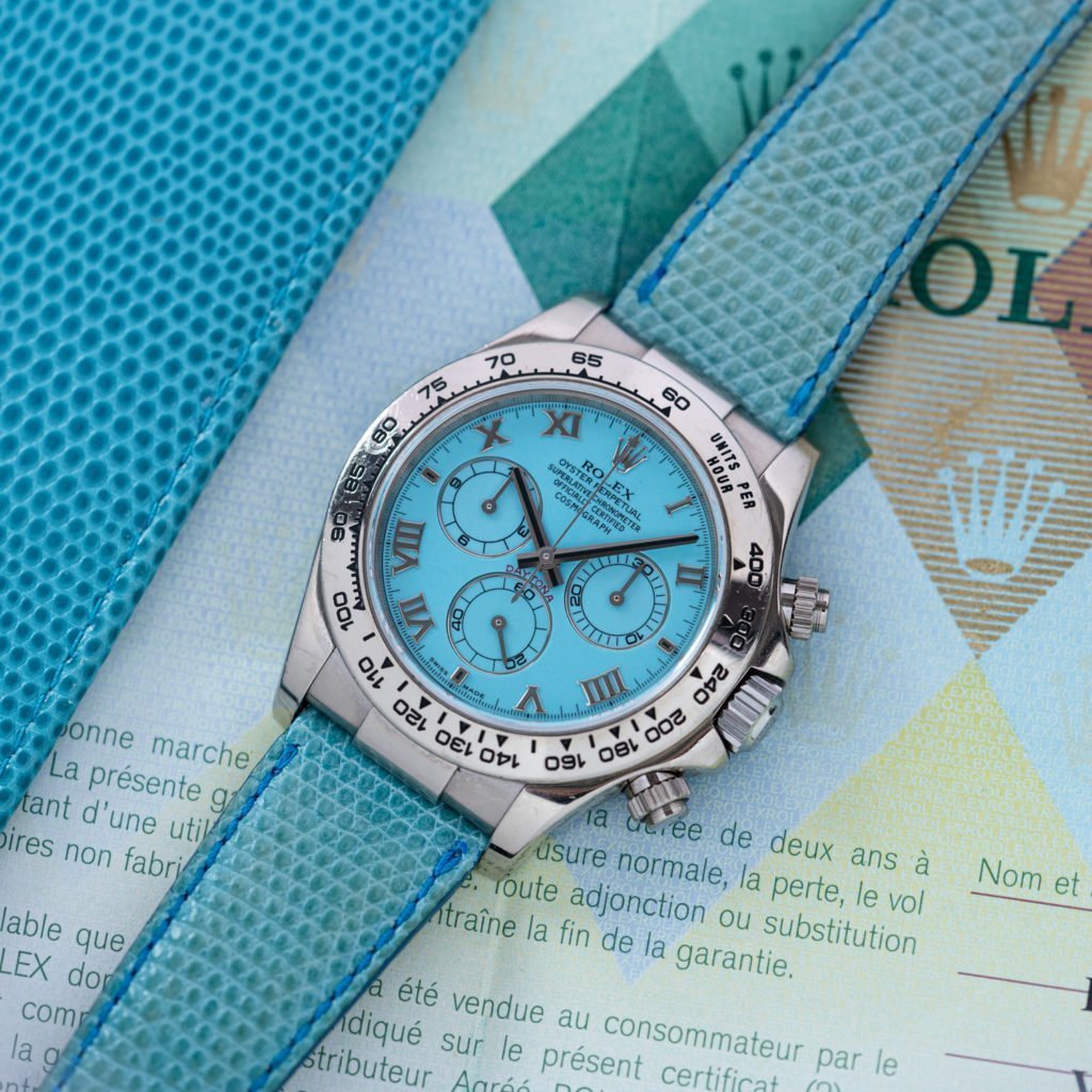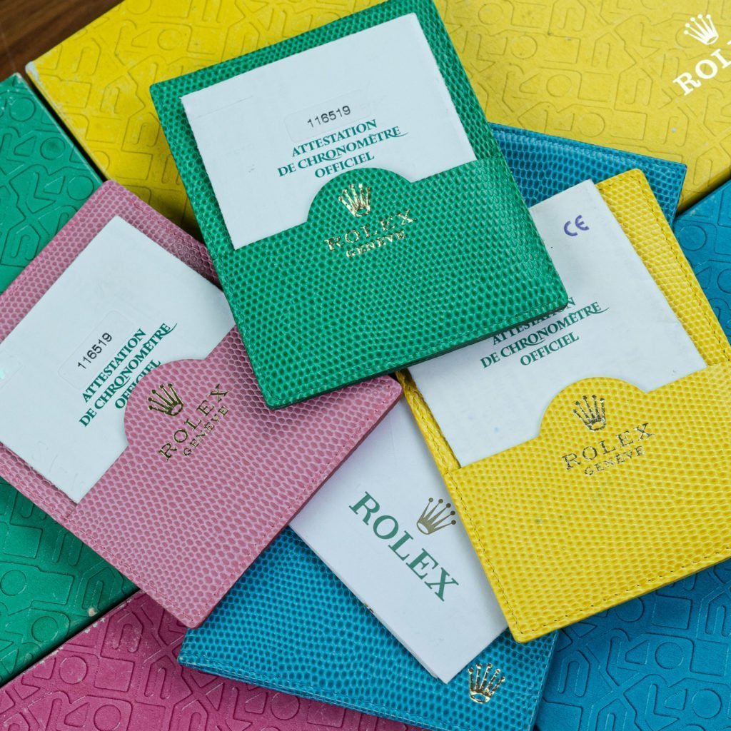 The previous generation of Rolex’ renowned chronograph, already had some remarkable pieces, examples with gem-setting or cool stone dials, often available upon request. But few as colorful as this commercially available series; where they kicked of their 6-digit reference Daytona line with. Although it was officially marketed as “Special edition” (not numbered or limited), it was nicknamed the Beach. To emphasize the “Joie de vivre” Rolex made the unconventional choice to deliver these watches with color-matching accessories. For many reasons we usually care little about additional items around the watch, like papers; but how cool is this funky set!