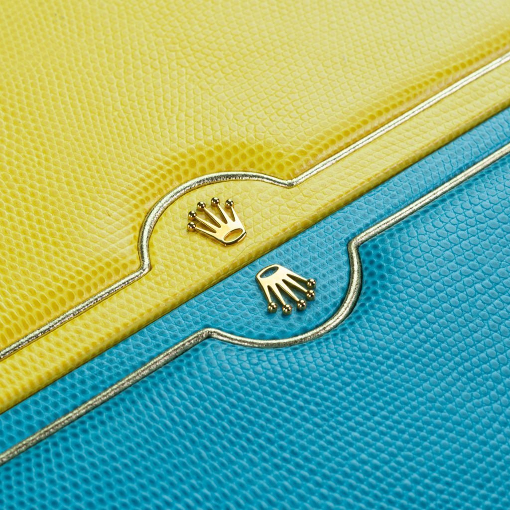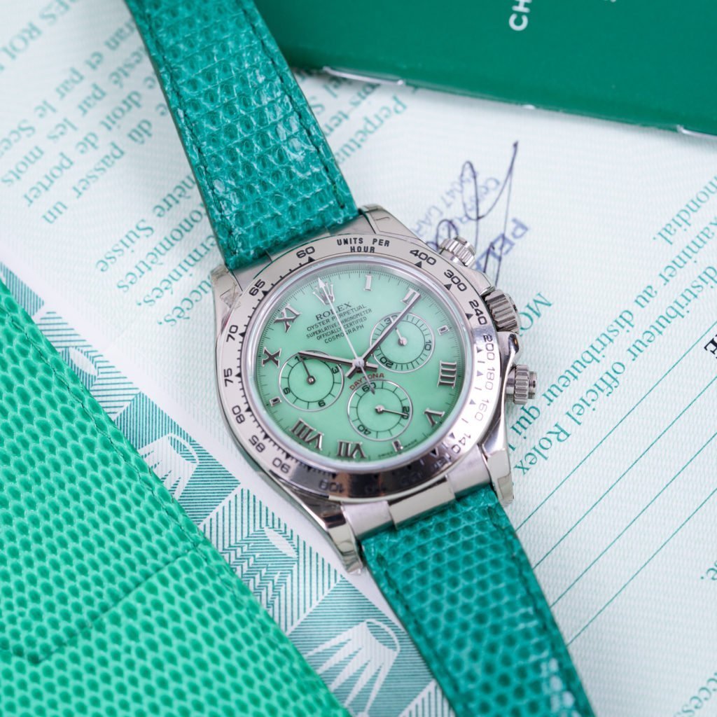 Lastly the lugs are “hooded”, therefore allowing to sport a leather strap without showing a gap between the case and band. However, this means one cannot attach a metal bracelet instead. the strap plays an important role on this model. Whilst most straps are still obtainable, the colored lizard straps from Rolex aren’t anymore. The soft leather with fine texture is dyed in the same color of the dial, or accessories for that matter, but tends to slightly discolor over the years due to UV or moist. Making an original strap with one of these bright colors rather valuable.