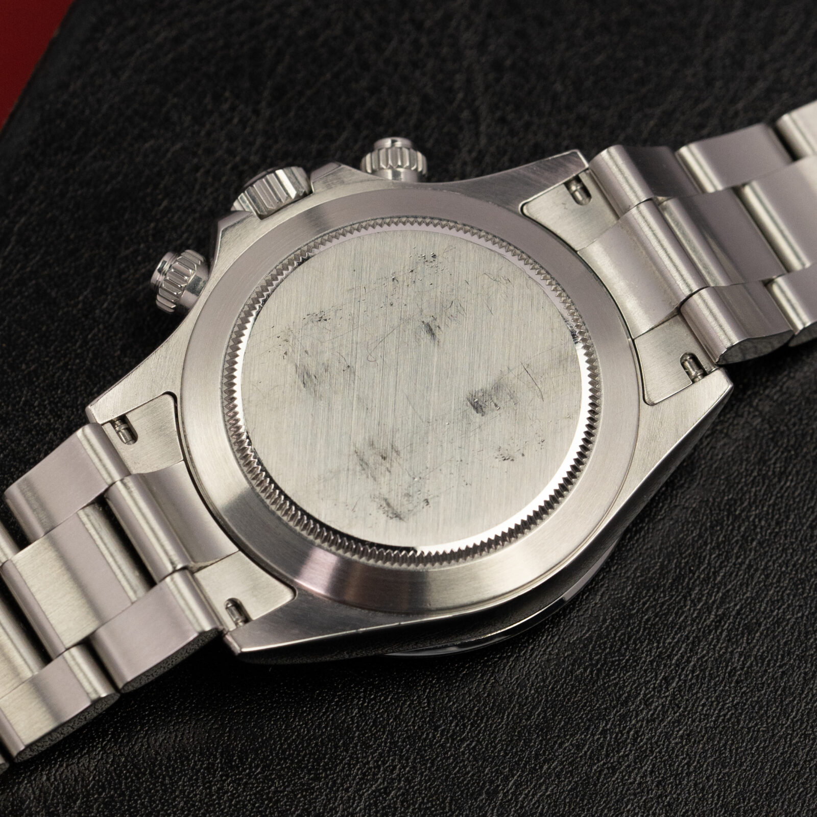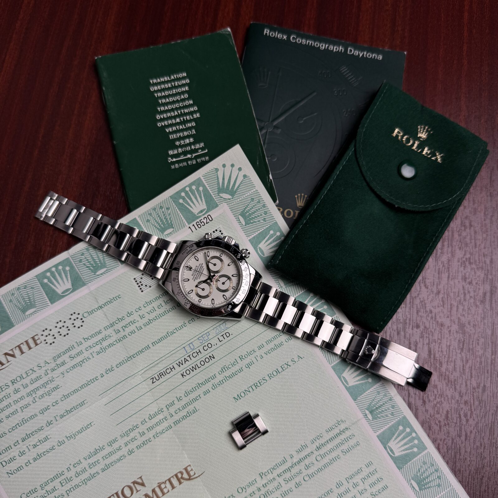 This 116520 is a nice execution of a ‘Panna’ Daytona, dating back to 2002, therefore still having the slimmer handset we also see on its predecessor. The dial has turned into a warm creamy white color. The watch is in good condition, with a thick case and tight Oyster bracelet. The variety in satin-finish and high polish -on this generation of the Cosmograph- is very dynamic and enhances the contemporary look. Furthermore it is supplied with its original documentation.