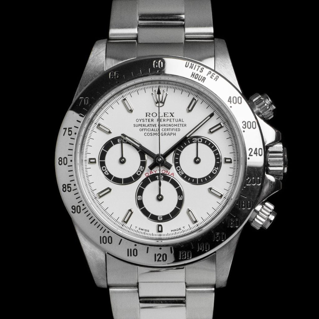 Rolex DaytonaRolex started making chronographs in the 1930s, but it was only in 1963 that a named product line was introduced: the Cosmograph. In some early advertisements, Rolex referred to the watch as the ‘Le Mans’ after the famous race track in France, although the name never appeared on the dial. After a few years, the line was officially renamed Cosmograph Daytona, after the racetrack in Florida.The most noticeable difference between these Cosmograph (Daytona) models and earlier Rolex chronographs, was the tachymeter scale (used for measuring distance and speed) that was moved from its traditional placement on the dial to the bezel. Furthermore, the dial was updated with the introduction of contrasting sub-dials.It’s hard to imagine now, but Daytonas received little love after their release. Most Daytonas languished in dealer displays for years and were only started to get noticed by Italian collectors and dealers in the late 1980s. Nowadays, Daytonas are among the most sought after Rolex models, fetching prices from $15,000 for modern ones to many millions for rare vintage references. A big contrast with the $210 list price when it was first released!
