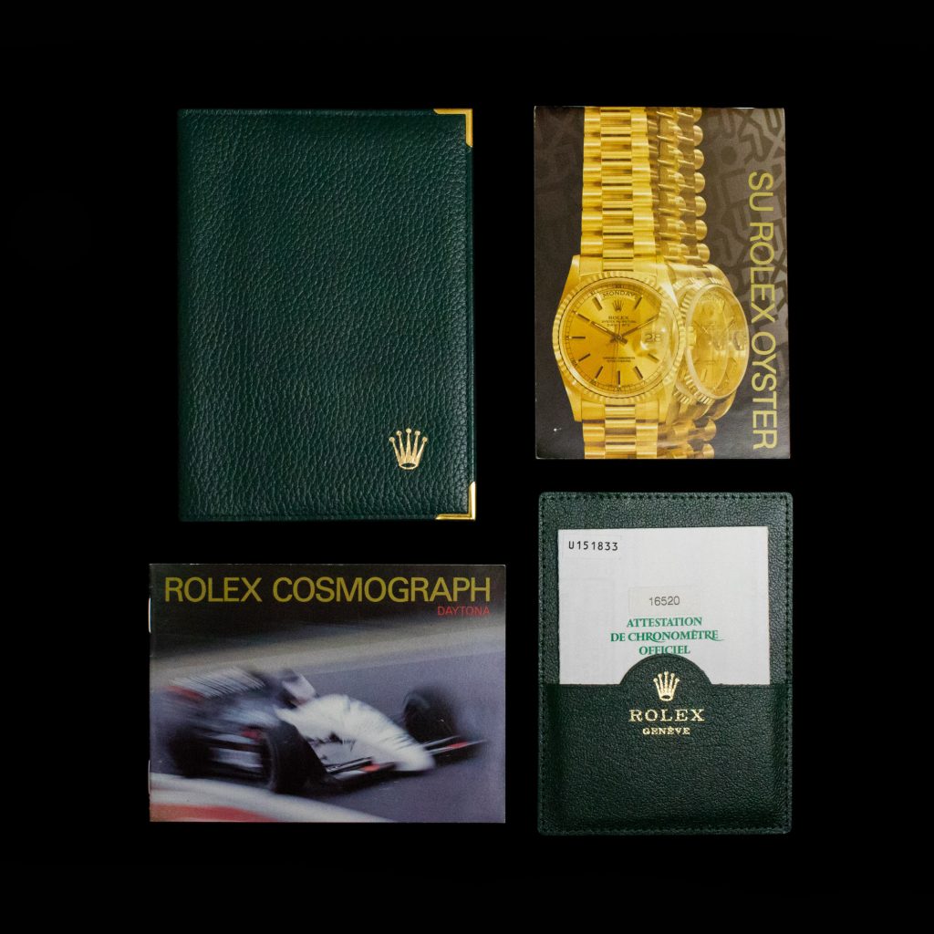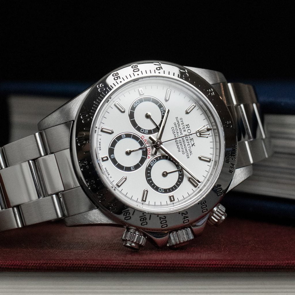 We just can’t get enough of the Zenith Daytona!The Rolex Daytona. A very special watch that is popular amongst collectors worldwide. 1988 was the introduction of the second-generation Daytona; the Zenith Daytona starting with reference 16520. This Daytona, dating back to 1998 (so, still with a tritium index), is a very handsome specimen as it is in absolute mint condition. The bracelet has no stretch and the watch has barely been polished, which can easily be seen when you take a closer look at the bezel as the numbers of the tachymetric scale are still clearly visible. Furthermore, this Daytona has a clear, white dial that matches the snow during the winter and your white sneakers during the summer. The Zenith Daytonas are larger (40mm) than their predecessors. The crown guards, chronograph pushers and sapphire crystal make it a very robust, sporty watch that could be a great daily beater for anyone! This white beauty even has the original box and papers. The watch is powered by the famous El Primero-based Zenith caliber 4030, which was Rolex’s first self-winding chronograph movement. Its predecessor, the 62XX-series, housed a Valjoux caliber and the third generation, which was introduced in 2000, houses a Rolex in-house movement.Recently, a similar Daytona was picked up at our store by a very stylish woman. So, also the ladies are welcome to come and check out this piece!