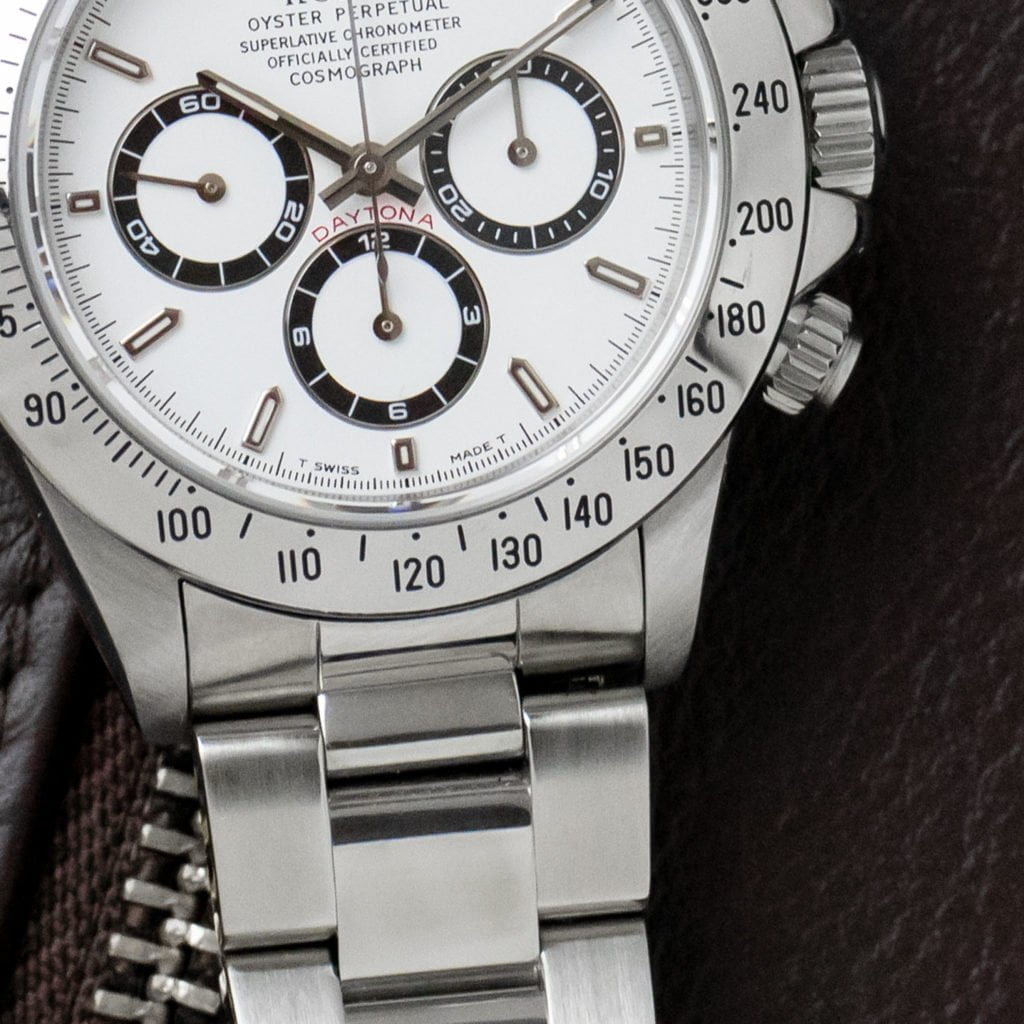 The Zenith Daytona is the new Valjoux Daytona (yep, again)!It doesn’t happen that often that we can offer two Zenith Daytona in one week. You might’ve already seen the black ‘Patrizzi’ dial. This one, dating back to 1995, is the opposite execution with a white dial and black counters.In 1988, Rolex finally retired the vintage 6xxx series Daytonas with the hand wound Valjoux movement and plexiglass. In its stead, it introduced the completely updated ref. 16520 Daytona. This second-generation iteration was updated to a modern 40mm steel case with sapphire crystal, a glossy black dial, and a heavily modified Zenith El Primero self-winding movement. The Zenith-powered Daytonas were produced for just a decade until Rolex, finally we might add, introduced its first in-house chronograph movement in 2000.This wite dialled execution is in stunning condition, with a perfect case and exceptionally tight Oyster bracelet with polished center links. Grab this one quick, because in a few years you’ll regret not having jumped on the wagon earlier!