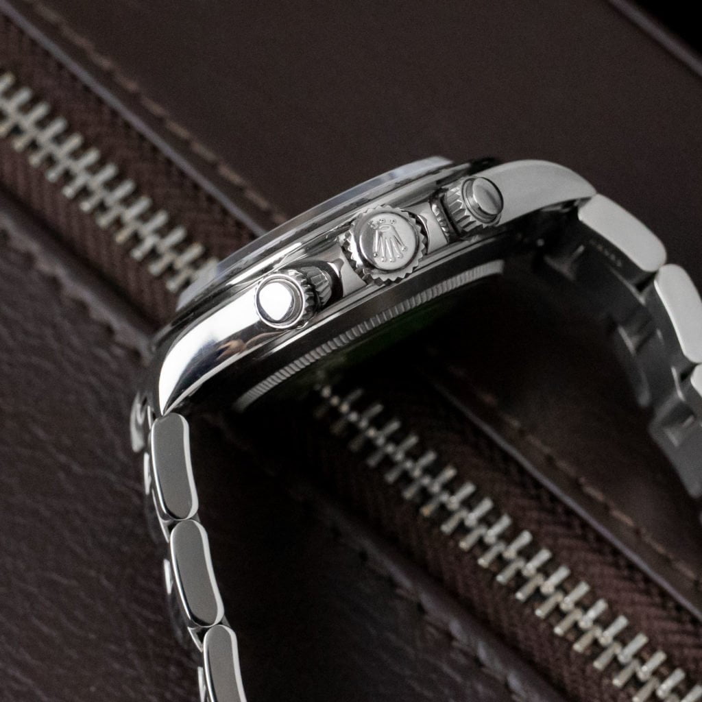 Rolex Cosmograph DaytonaRolex started making chronographs in the 1930s, but it was only in 1963 that a named product line was introduced: the Cosmograph. In some early advertisements, Rolex referred to the watch as the ‘Le Mans’ after the famous race track in France, although the name never appeared on the dial. After a few years, the line was officially renamed Cosmograph Daytona, after the racetrack in Florida.The most noticeable difference between these Cosmograph (Daytona) models and earlier Rolex chronographs was the tachymeter scale (used for measuring distance and speed) that was moved from its traditional placement on the dial to the bezel. Furthermore, the dial was updated with the introduction of contrasting sub-dials.It's hard to imagine now, but Daytonas received little love after their release. Most Daytonas languished in dealer displays for years and only started to get noticed by Italian collectors and dealers in the late 1980s. Nowadays, Daytonas are among the most sought after Rolex models, fetching prices from $20,000 for modern ones to many millions for rare vintage references. A big contrast with the $210 list price when it was first released!