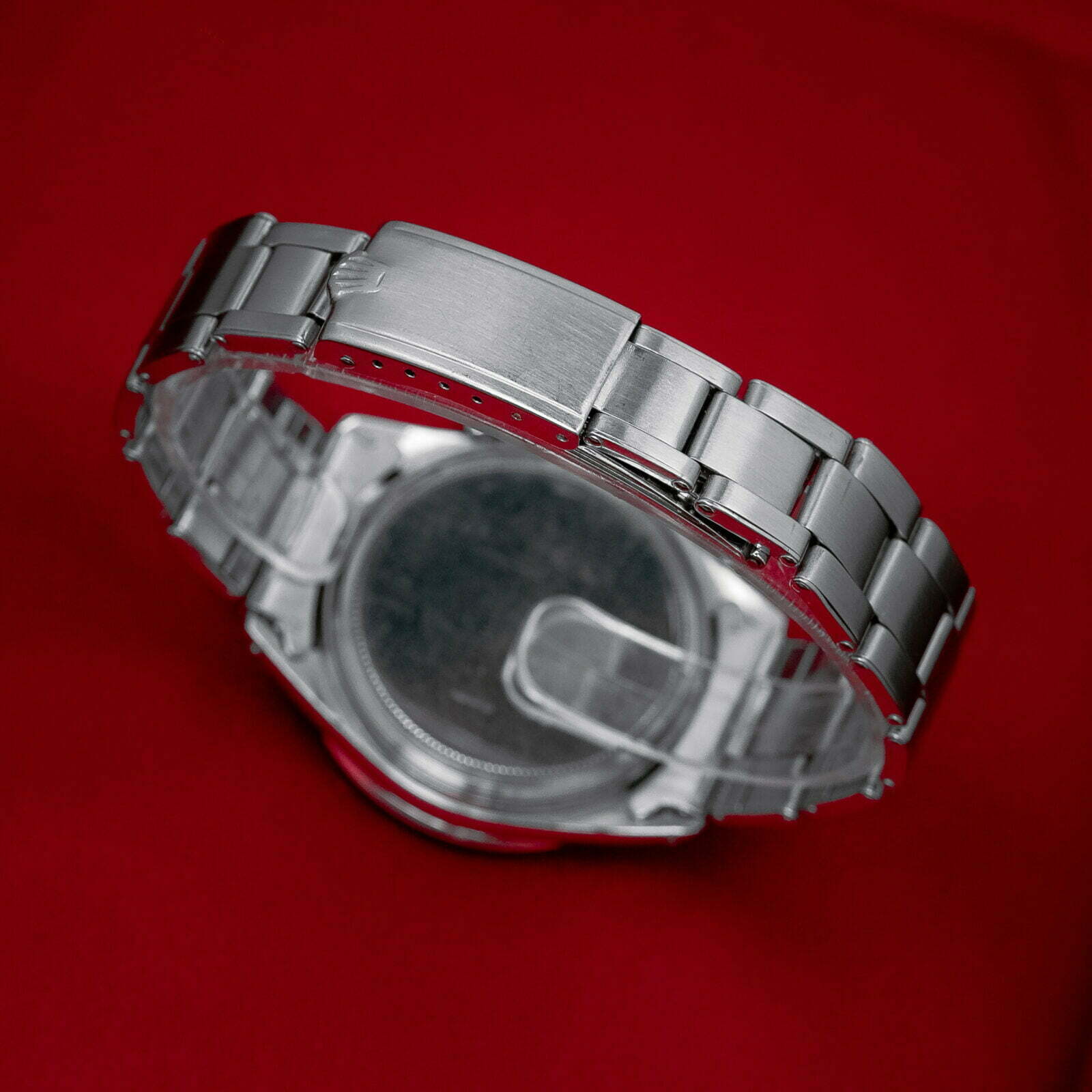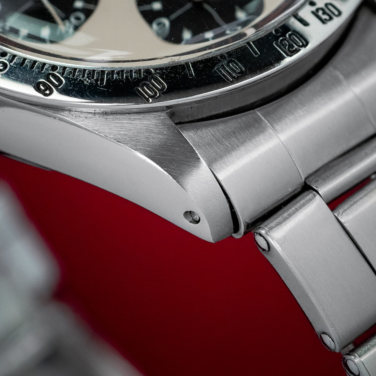 Considering the condition of the dial, one would expect matching case quality. You will not be disappointed when holding or wearing this strong stainless steel Oyster with thick lugs. The bezel is calibrated at 300UPH, again something one only finds on lower serial Daytonas. Talking about the serial, it is still very clearly readable and so is the reference number between the lugs. The '7205' riveted bracelet with original '71' end-links is ready to be worn for decades to come.