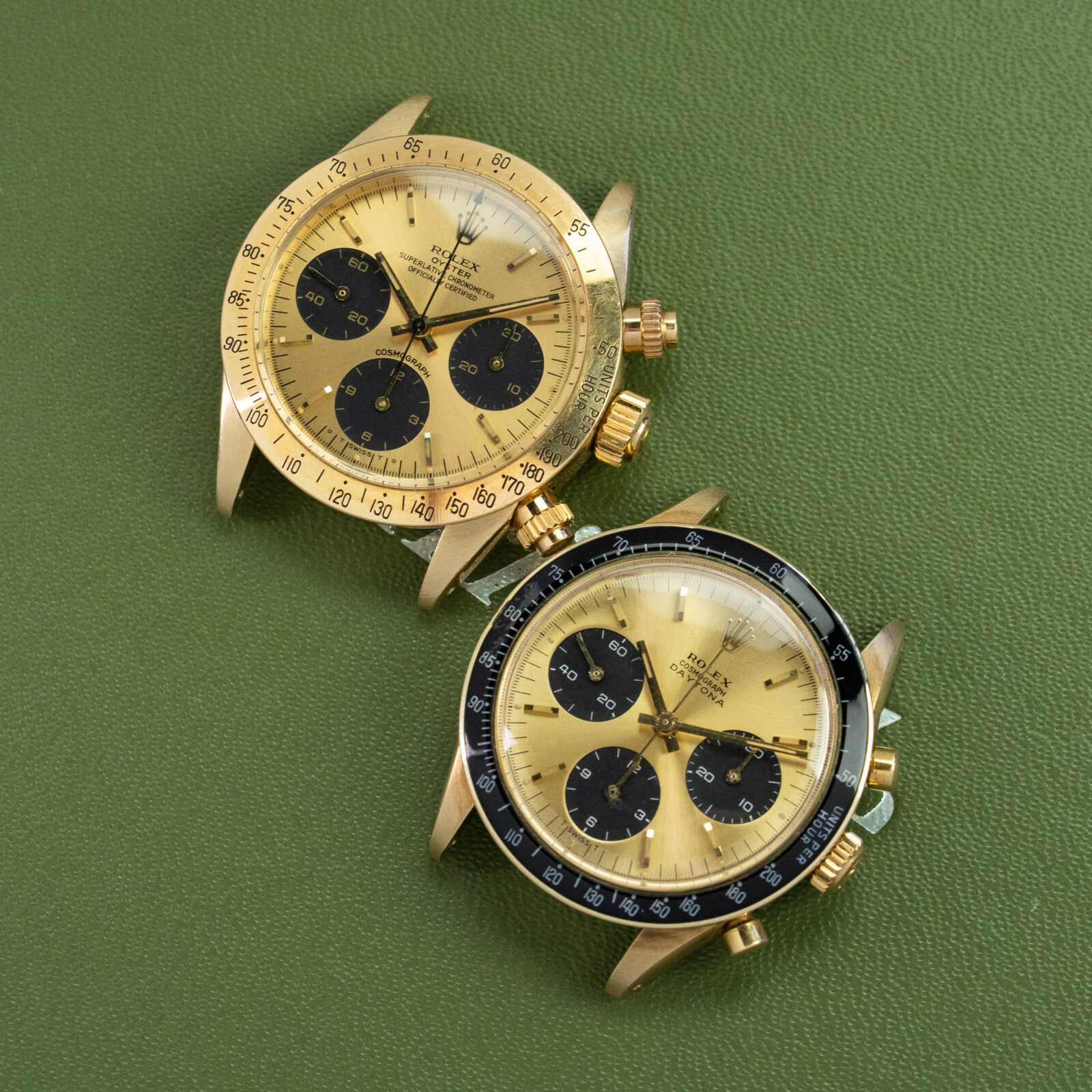 As we all know, vintage Daytonas from the four-digit reference era are highly collectible. Gold examples, however, are considerably rarer; especially those crafted in 14k yellow gold rather than the more common 18k. These 14k cases were produced specifically for the U.S. market to reduce import duties. This particular watch’s journey from Switzerland to the United States is further confirmed by the “ROW” engraving on the movement.