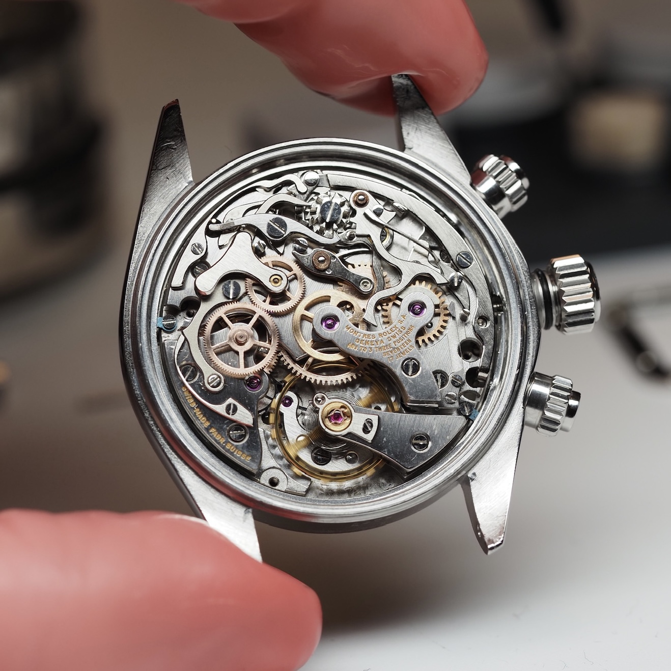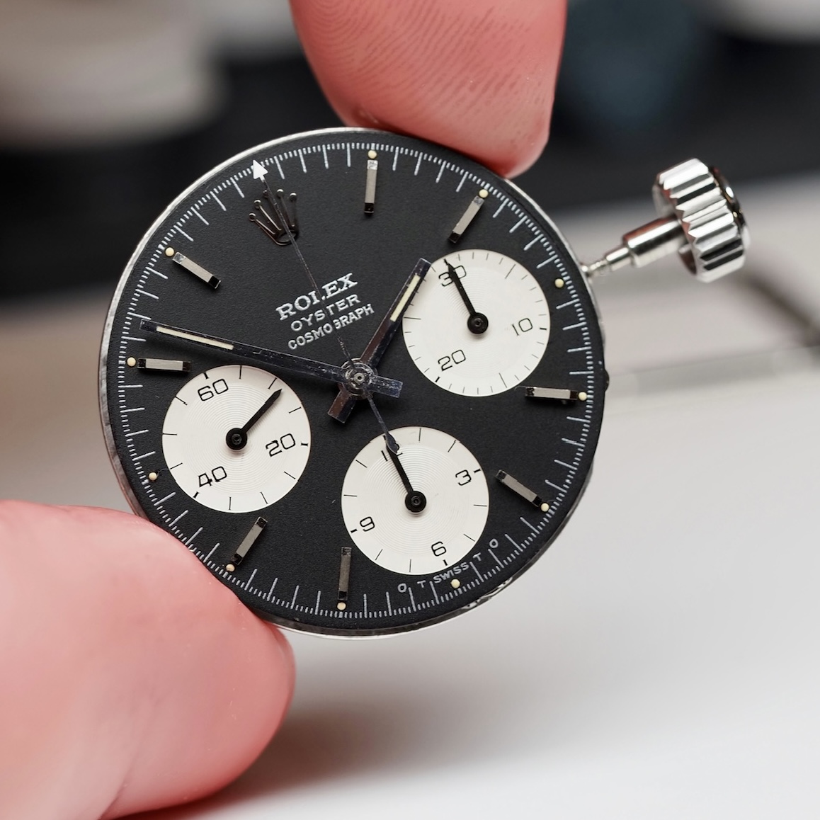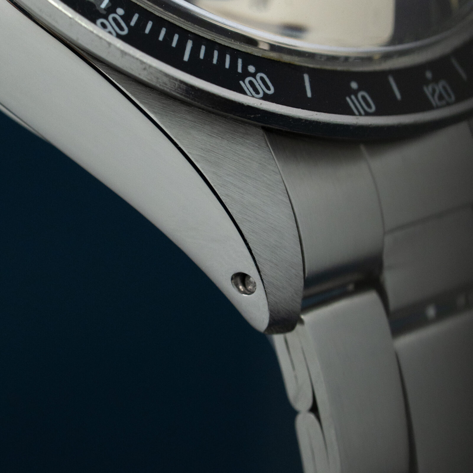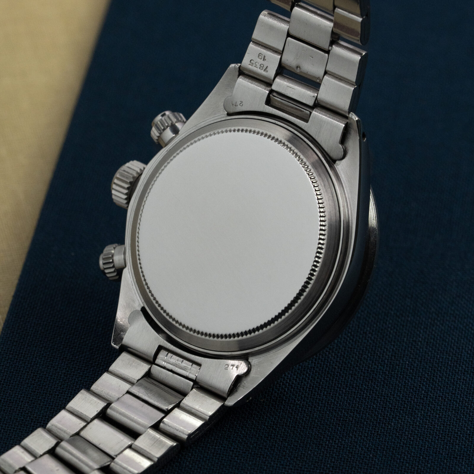 The printing on the dial is sharp and balanced, with the silver text (instead of the standard white) standing out subtly rather than forcefully. It elevates the entire look to another level. The sigma markings confirm the presence of applied white gold indexes, a detail that emphasizes both the rarity and refinement of this configuration. Together these elements create a dial that is highly collectible and unmistakably characteristic of early screw down Daytona production.