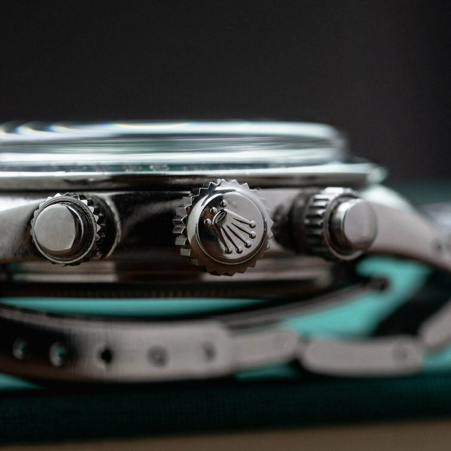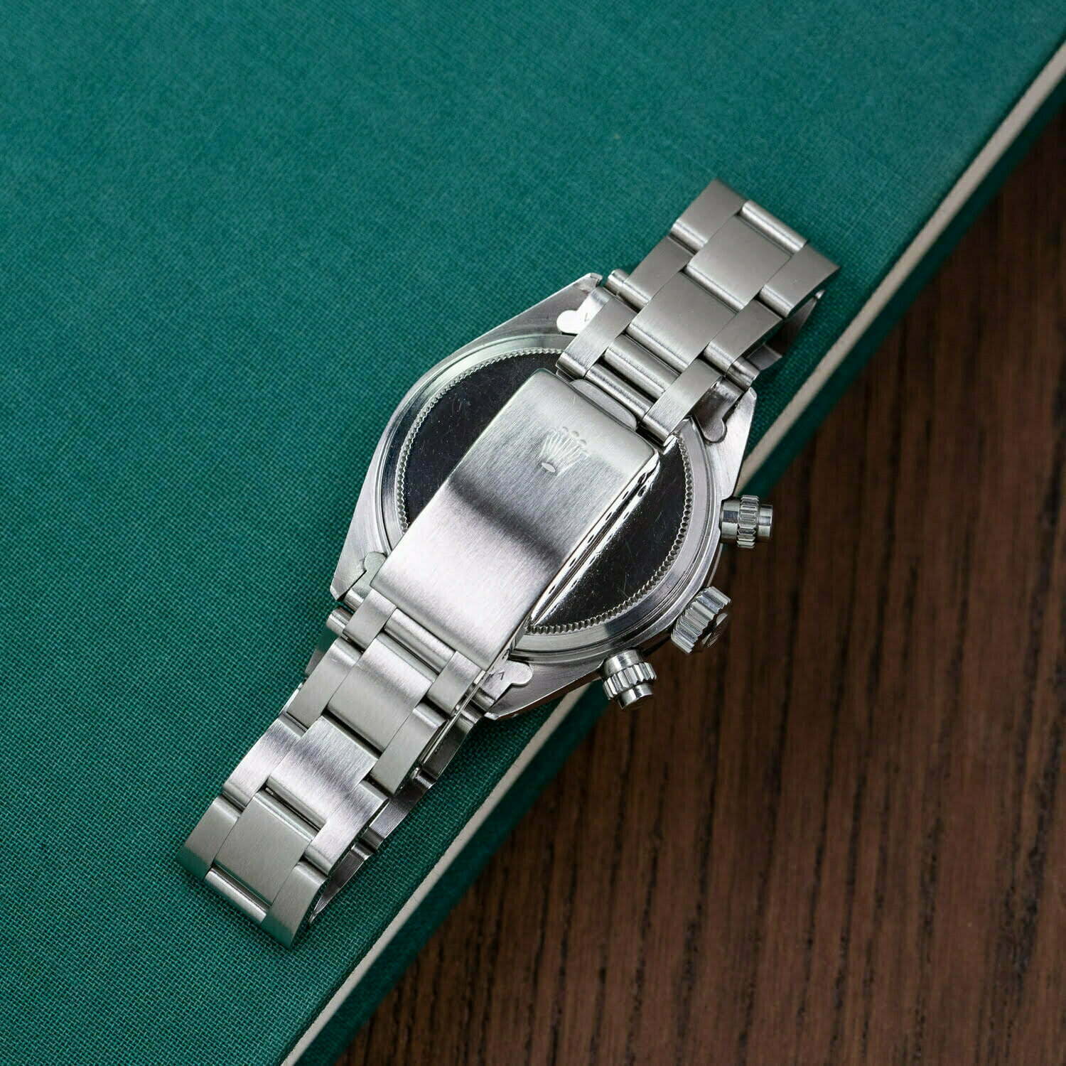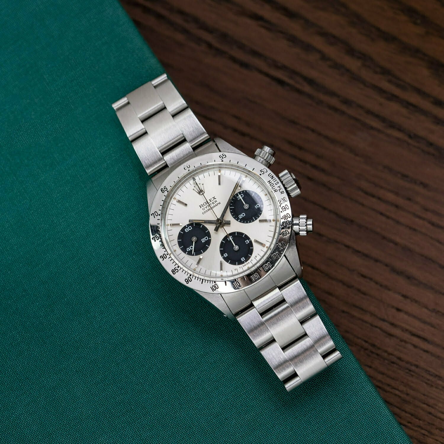 It was nearly impossible to sell this watch when it rolled off the production line in the late 1970s. Manual wind Daytonas like this 6263 often languished in dealer windows for years, until some good Samaritan finally took pity and gave it a new home for just a couple hundred bucks. Nowadays, these four digit Daytonas are among the most coveted and collectible watches on the planet. The reference 6265 (together with its sibling, the 6263) has the distinction of being the last vintage Daytona and the Daytona that enjoyed the longest production run, from 1971 until 1987 when it was replaced by the modern reference 16520 with automatic movement and sapphire crystal. Nowadays, these vintage four digit Daytonas are among the most coveted and collectible watches on the planet.This stainless steel ref. 6265 dates back to 1975 and features a silvered dial with black recessed sub-registers, a configuration lovingly referred to by collectors as a ‘panda dial’ due to its resemblance to a panda’s face.The dial on this 6265 is in wonderful condition with beautiful creamy luminous plots and a matching tritium handset. The bottom of the dial features a cool detail: two sigma (‘σ’) markings, an indication that was used by select Swiss watchmakers (namely Patek, Rolex, Vacheron, and IWC) in the 1970s and 1980s to indicate the use of 18k gold on the dial; in this case referring to the 18k white gold indices and hands.The watch is in excellent condition with a sharp case and a lovely 19 mm stainless steel Oyster bracelet.