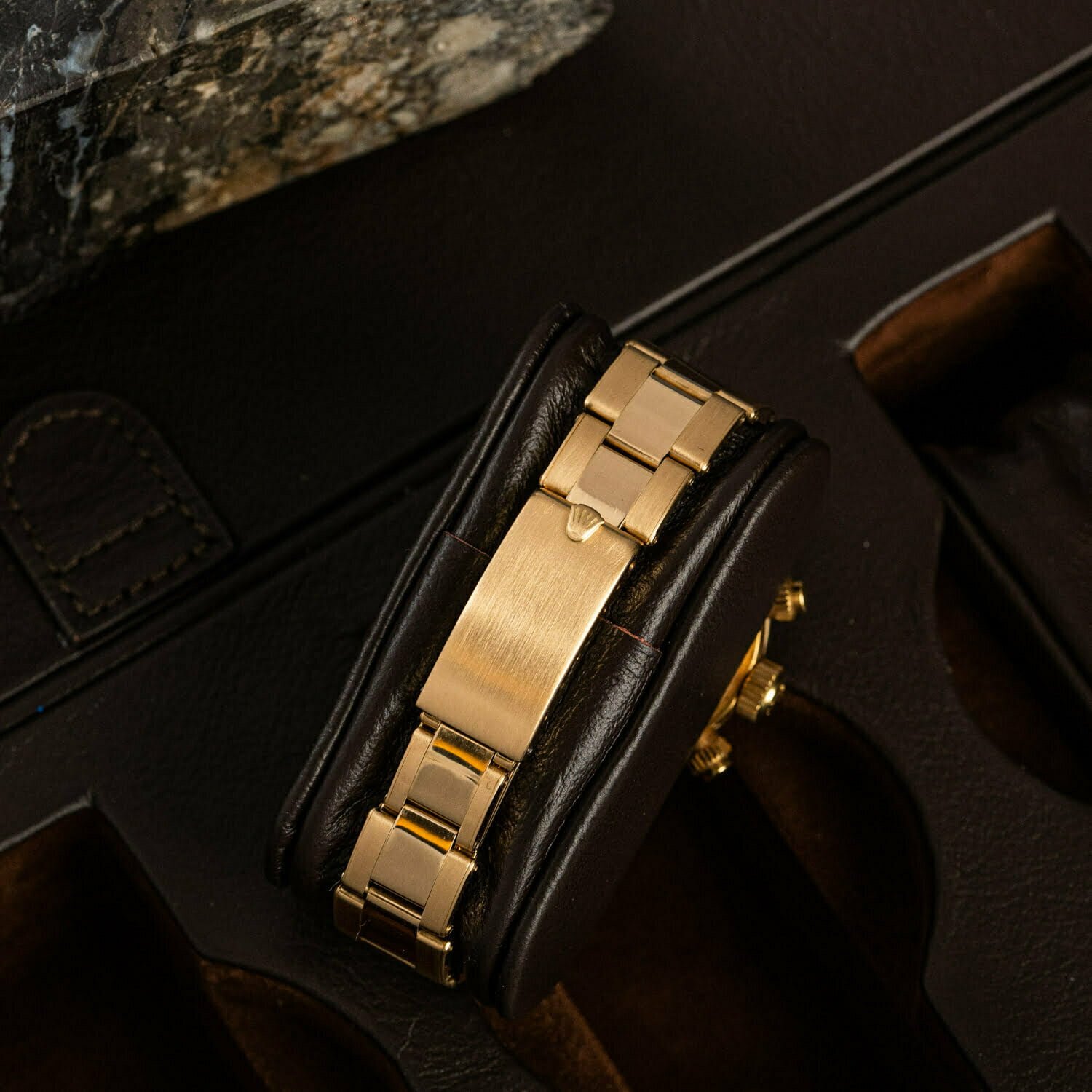 More often than once, the Daytona is associated with the Oyster bracelet, yet there are plenty of examples where the customers’ preference of a different configuration was granted. A Jubilee was the best contender for an alternative look on your gold Daytona as a President bracelet doesn’t fit between the 19mm lug-width. However, neither the 6269 nor the 6270 were in the catalogue and no official ads have surfaced, so it is impossible to tell what bracelet Rolex had in mind. It is safe to assume that if you we’re to spend such an exorbitant amount, the choice would be yours.