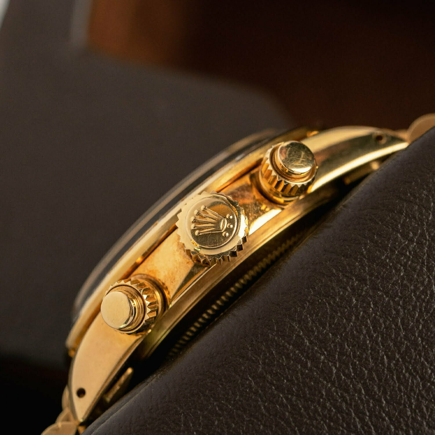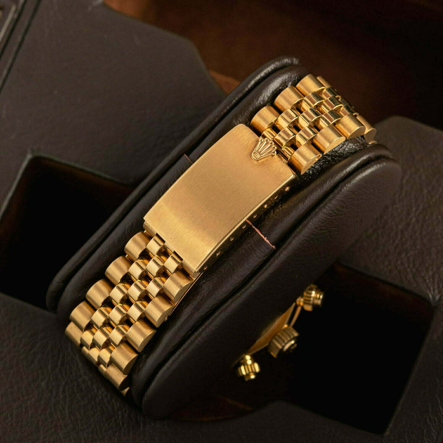 More often than once, the Daytona is associated with the Oyster bracelet, yet there are plenty of examples where the customers’ preference of a different configuration was granted. A Jubilee was the best contender for an alternative look on your gold Daytona as a President bracelet doesn’t fit between the 19mm lug-width. However, neither the 6269 nor the 6270 were in the catalogue and no official ads have surfaced, so it is impossible to tell what bracelet Rolex had in mind. It is safe to assume that if you we’re to spend such an exorbitant amount, the choice would be yours. In this case the Jubilee bracelet has been chosen, something we haven't encountered before.