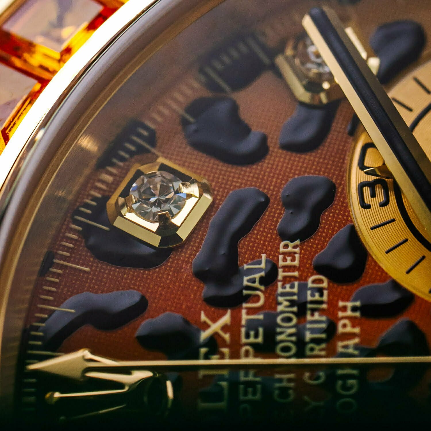 Aptly nicknamed the ‘Leopard’, this 18k yellow gold Daytona features an exquisite 18k yellow gold bezel set with 36 cognac colored sapphires. The lacquered dial, meanwhile, features an extravagant leopard print together with eight diamond set hour markers with 18k gold surrounds, interspersed with applied 18k yellow gold Arabic minute markers at the 15, 30, and 45 positions.