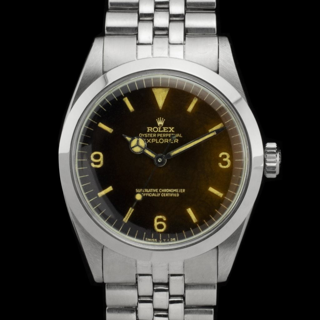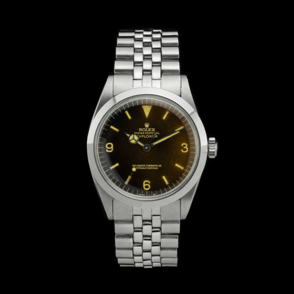 Explore the tropics! This well-conditioned Explorer 1016 surely has been on the wrist of an explorer. The dial of this stunner shows that the watch has been worn and well-lived as it has a beautifully aged tritium index and a chocolate brown colour. However, the owner surely was a well-dressed adventurer because it looks like the watch has been worn under the cuffs of a dress shirt. Why? Well, the dial discolours from deep chocolate brown on the 9 hour side to light, caramel brown on the 3-hour side. It could be that the 3-hour side was not covered by the cuffs and therefore, exposed to more sunlight. Anyhow, this gentleman surely explored the world in style.This Rolex dates back to 1966 and is therefore, one of the latest specimens with the gilt, glossy dial. The yellow-gold text on the dial fits very well with the brown dial. It has a stainless-steel case, with the elegant case diameter of 36mm, which is just perfect for everyone. It comes with a time-correct, stainless steel, folded jubilee bracelet, which instantly makes this adventurous timepiece a classy, dress watch. The watch runs on the 1570 calibre; the first Rolex in-house calibre (together with the 1560) that passed the tests of the COSC. This movement was used for the 1016 until the end of its production in 1989. The domed bezel and lugs are so sharp that it looks like the case barely has been polished.