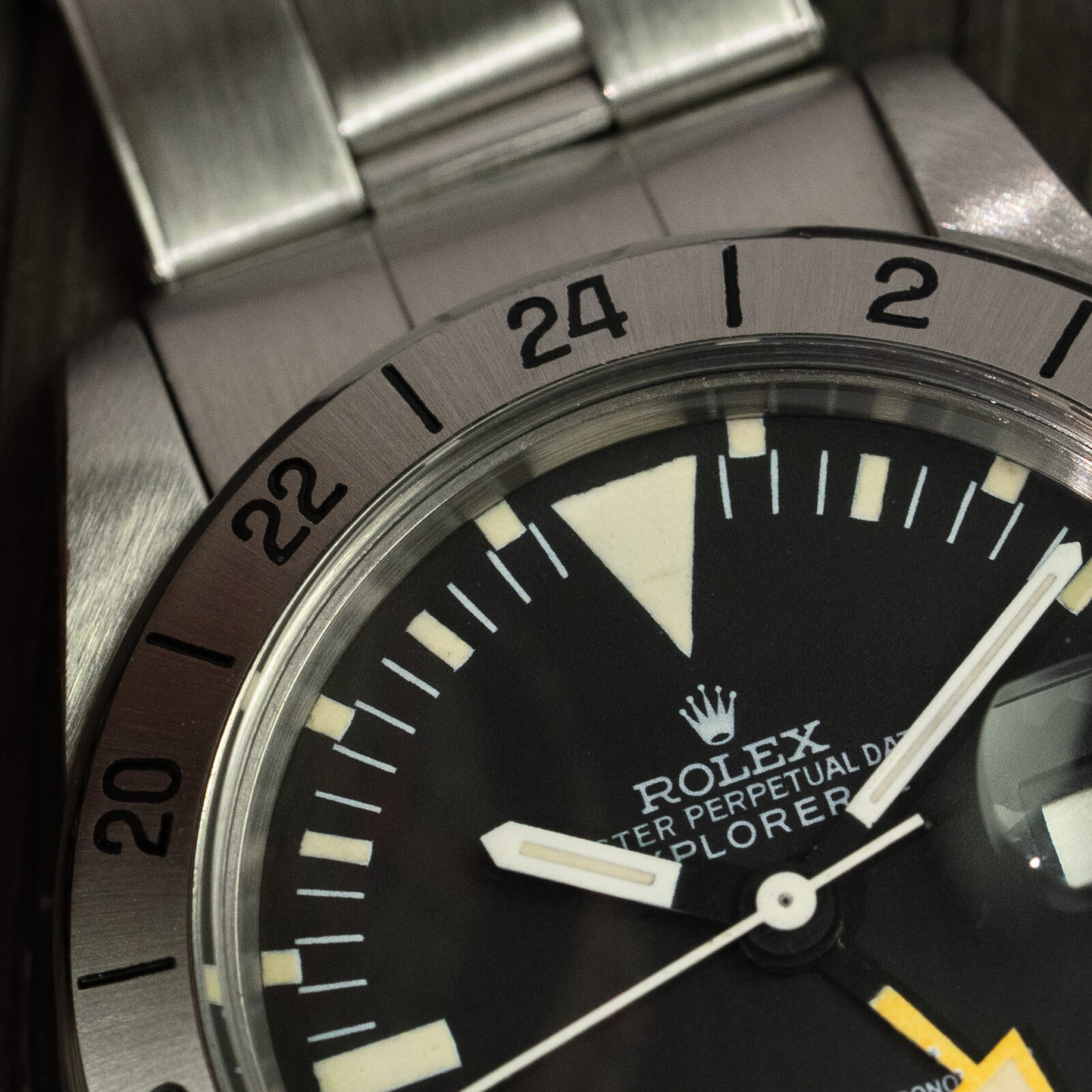 The Rolex Explorer II was made to address one very specific problem. As you may have noticed it features an extra orange colored 24-hour hand, which is referred to as the 'Freccione' or 'Big Arrow'. Next to that it also has an engraved 24-hour scaled bezel, in this case an Mk2 bezel, that is often paired and periodically correct with the Mk1 dials, which we can also find here. And because of this bezel; the lucky explorer can prevent losing all notion of time by being able to distinguish night from day during his or hers explorations to the far North where the sun might not pop up for months on end.
