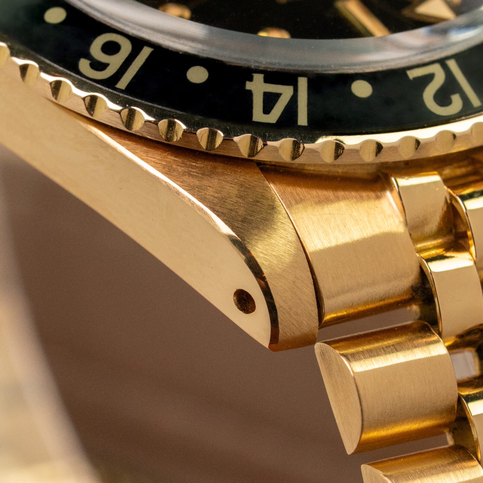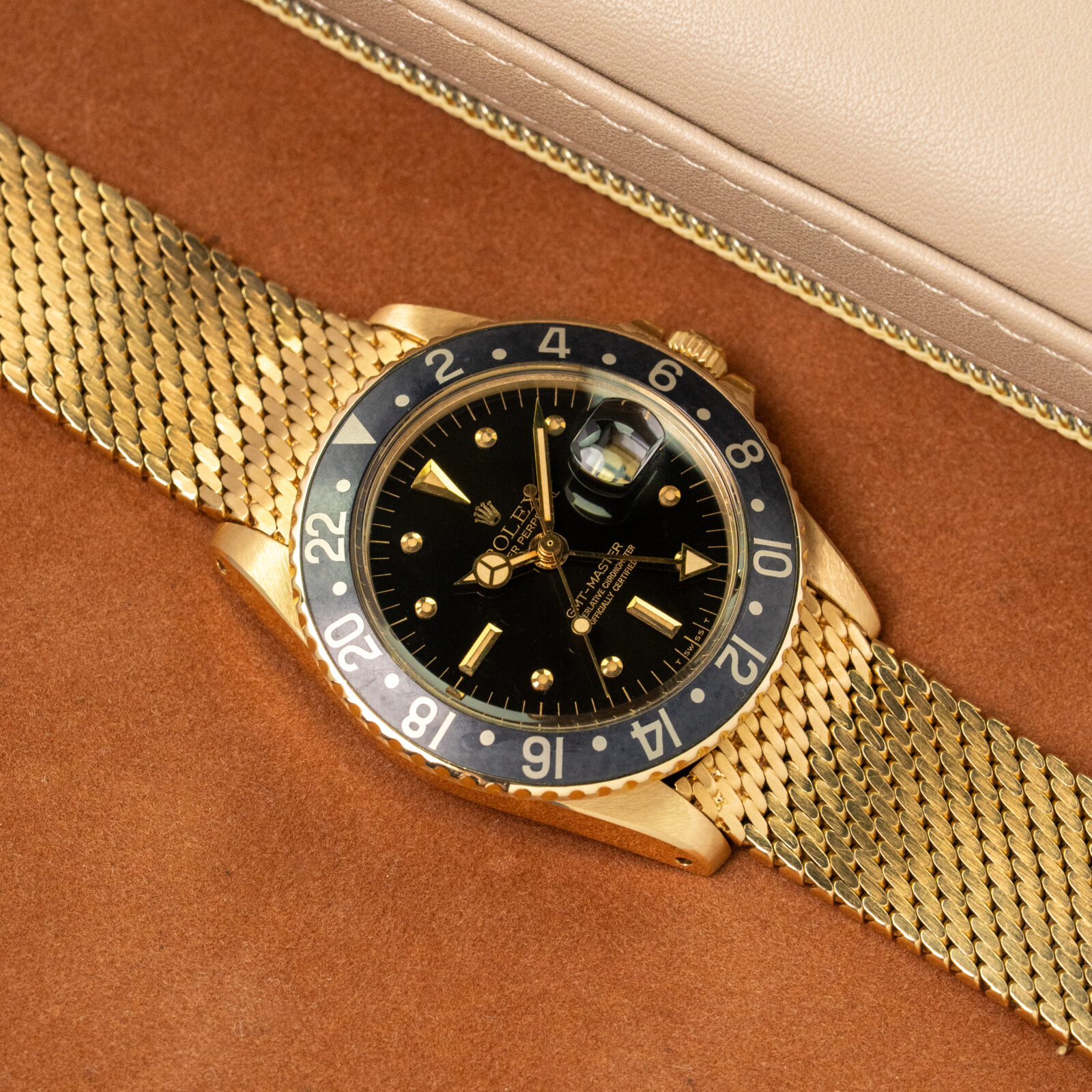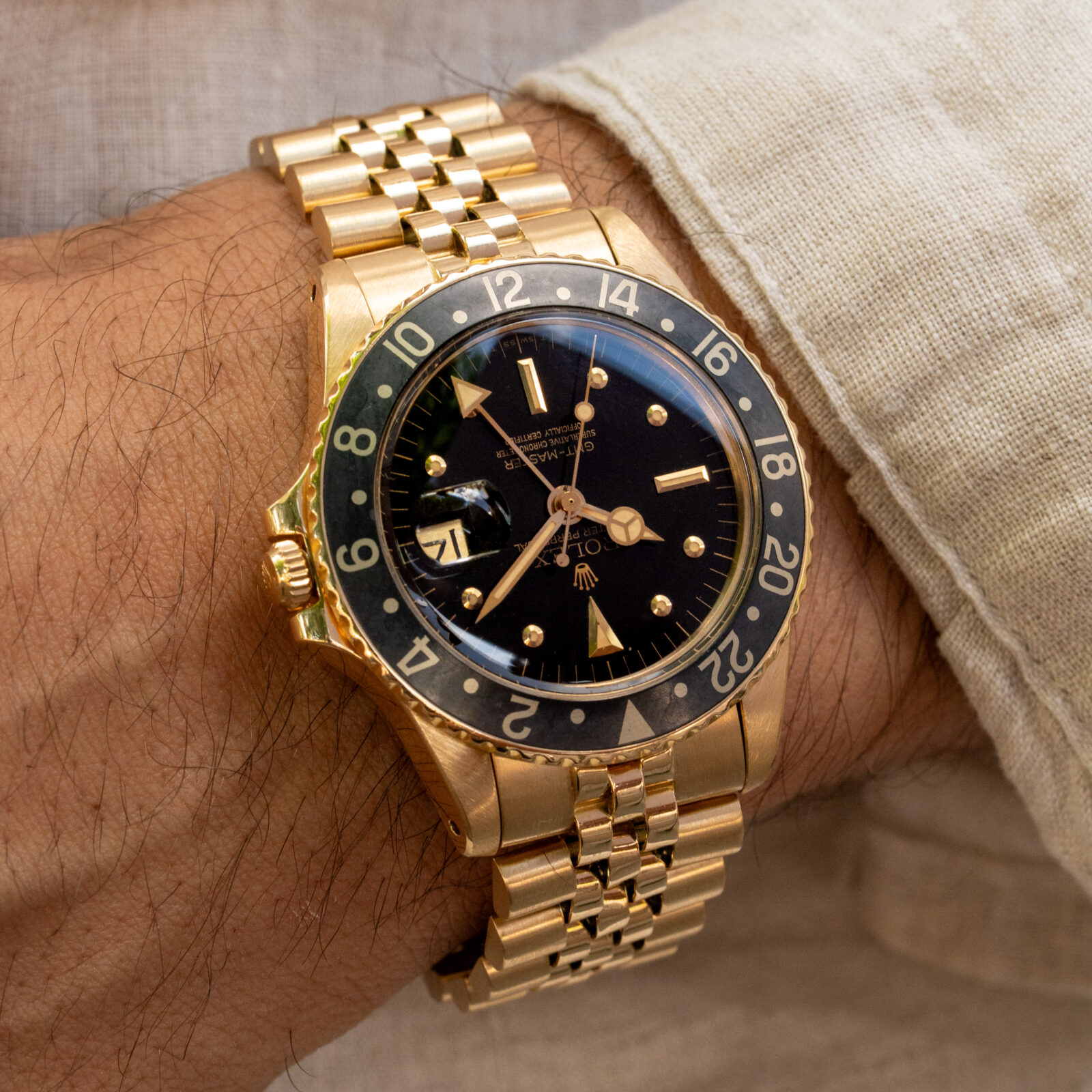 This 1675/8 ticks all the boxes — and then some. Full yellow gold case with chamfered lugs? Check. Glossy black “nipple dial” with warm tritium plots and matching hands? Absolutely. And that bezel insert? Originally black, now perfectly faded into a moody charcoal that looks like it’s been places. The whole package oozes 1970s jet-set cool.