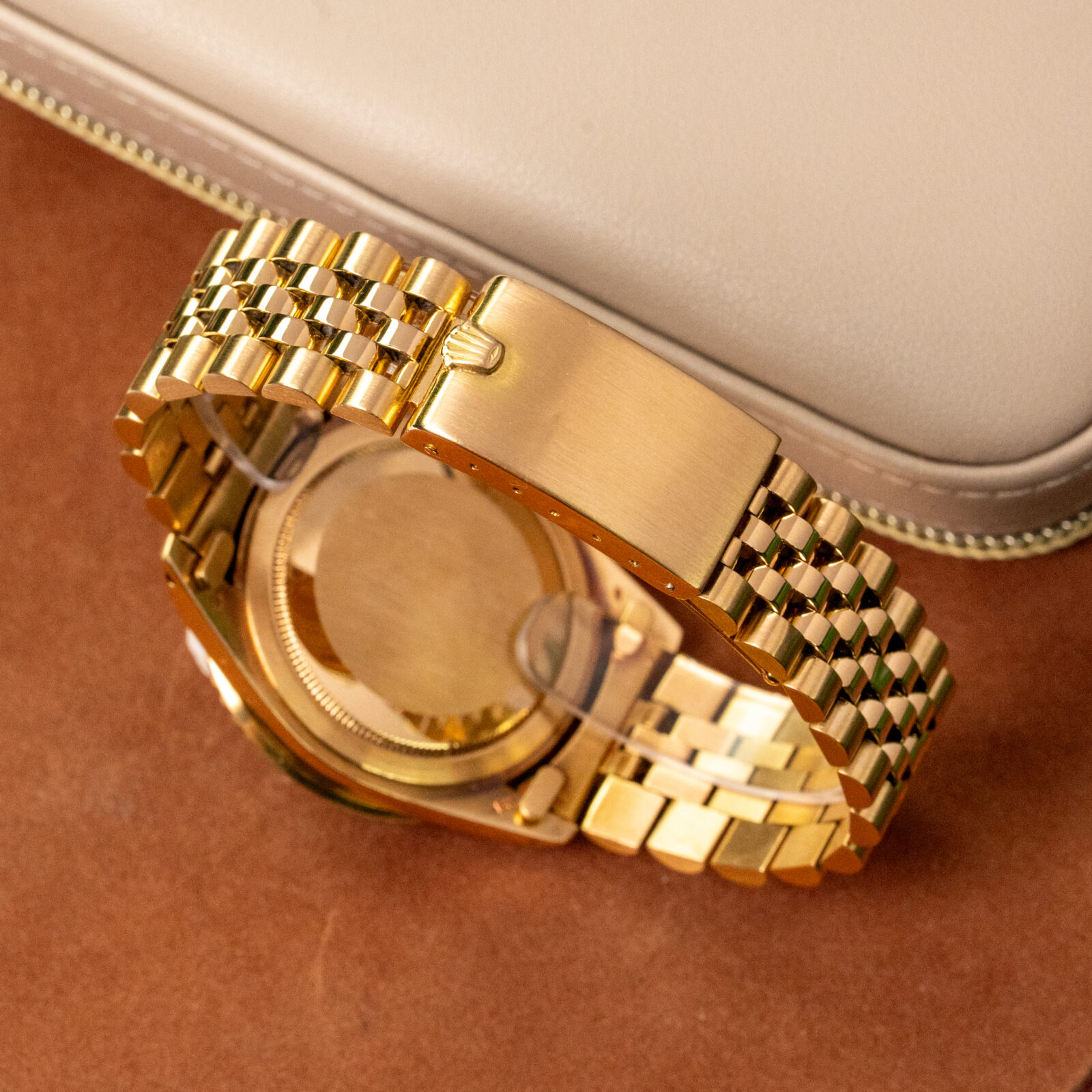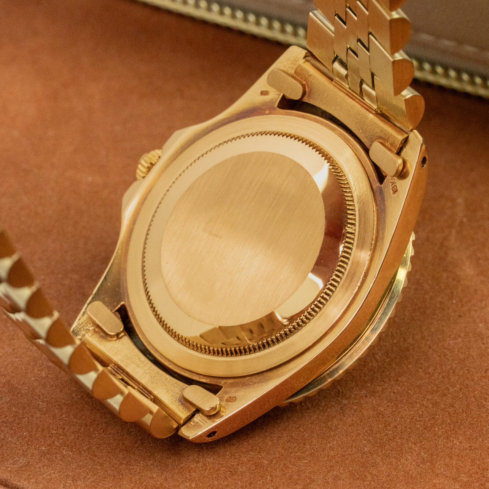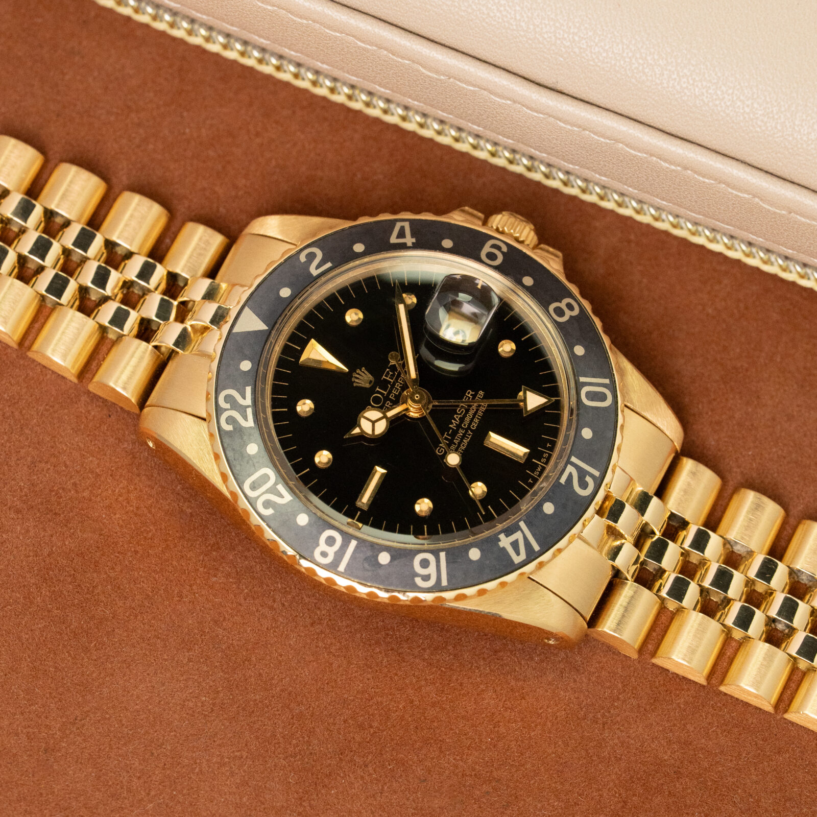 This 1675/8 ticks all the boxes — and then some. Full yellow gold case with chamfered lugs? Check. Glossy black “nipple dial” with warm tritium plots and matching hands? Absolutely. And that bezel insert? Originally black, now perfectly faded into a moody charcoal that looks like it’s been places. The whole package oozes 1970s jet-set cool.