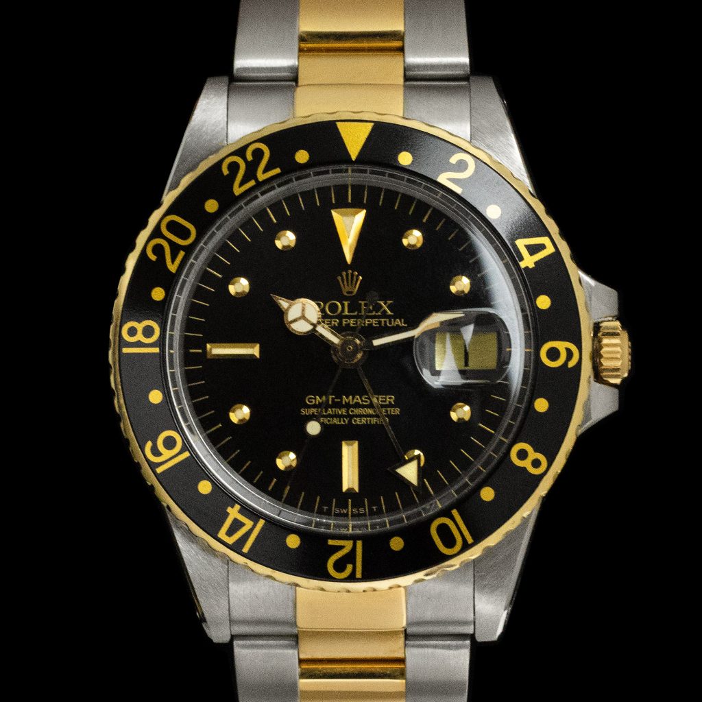 Rolex GMT-MasterFasten your seatbelts for the story of the Rolex GMT-Master. Aviation company Pan-Am requested Rolex to create a wristwatch that would display multiple time-zones simultaneously, as their flights got longer; crossing multiple time-zones. Rolex came up with the GMT-Master (‘GMT’ stands for ‘Greenwich Mean Time’) in 1954. The watch features a date-function and an extra hour hand (with triangle) that points out the second time zone on the bi-directional turning, 24hour bezel.Still linked to aviation and although meant for professional use, it enjoys a much wider fan base ever since it first saw light. Over the years it underwent some changes and there are so many wonderful variations of this all-time Rolex classic. Some GMT’s are great as a single purchase, others are a wonderful addition to any collection and some of them can be considered as the crowning glory.REF. 1675Introduced in 1959 and with a very long production run of little over 20 years: the 1675! On this model they added the ‘pointed crown guards’ (1675 with PCG AKA ‘Cornino)’ that got replaced by regular rounded crown guards in 64/65. The dial also underwent some changes from glossy gilt chapterring to a matte radial dial in the end. (with a lot of variations in between, like the rare ‘exclamation mark’, ‘underline’ and ‘Double-swiss’ dials). There was a change in the red GMT hand as well as the small arrow was replaced by a bigger one.The 1675 was mainly produced in steel, but was also available in 18k yellow gold or a combination of both materials. In the early 70s it became the first Rolex Professional watch with – optional – factory fitted jubilee bracelet.