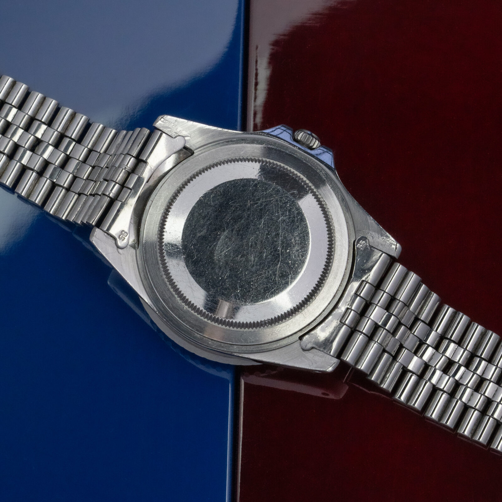 This 1675 has a beautiful "red-back" bezel inlay, which has elegantly faded over time due to the factors of nature. This GMT-Master dates back to 1966 and. With its 1.3M serial it comes with the coveted original 'Gilt Dial', which retains a perfect mirror gloss. This specific one is referred to as Type C. The lumeplots, together with the original hand-set -with small GMT-arrow- have created a stunning yellowish hue matching perfectly. The 40mm case that houses the calibre 1575 is carried by a stainless steel and folded Jubilee bracelet with '55' end links. It dates back to 4th quarter of 1965, so matching the period of the case.