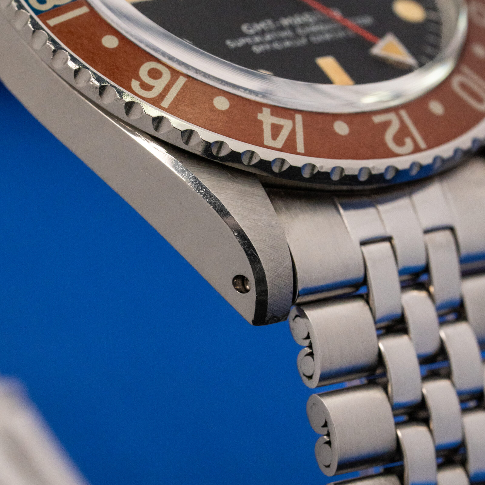 At first glance, the watch draws you in with its beautifully aged “Pepsi” bezel; a term affectionately coined by collectors for its red and blue color scheme. Yet decades of sun, wear, and time have softened those once-bright colors into a sublime blend of soft red and cerulean, a natural patina that cannot be replicated, only earned. It’s a visual testament to a life well lived, whispering stories of faraway places and fleeting time zones.