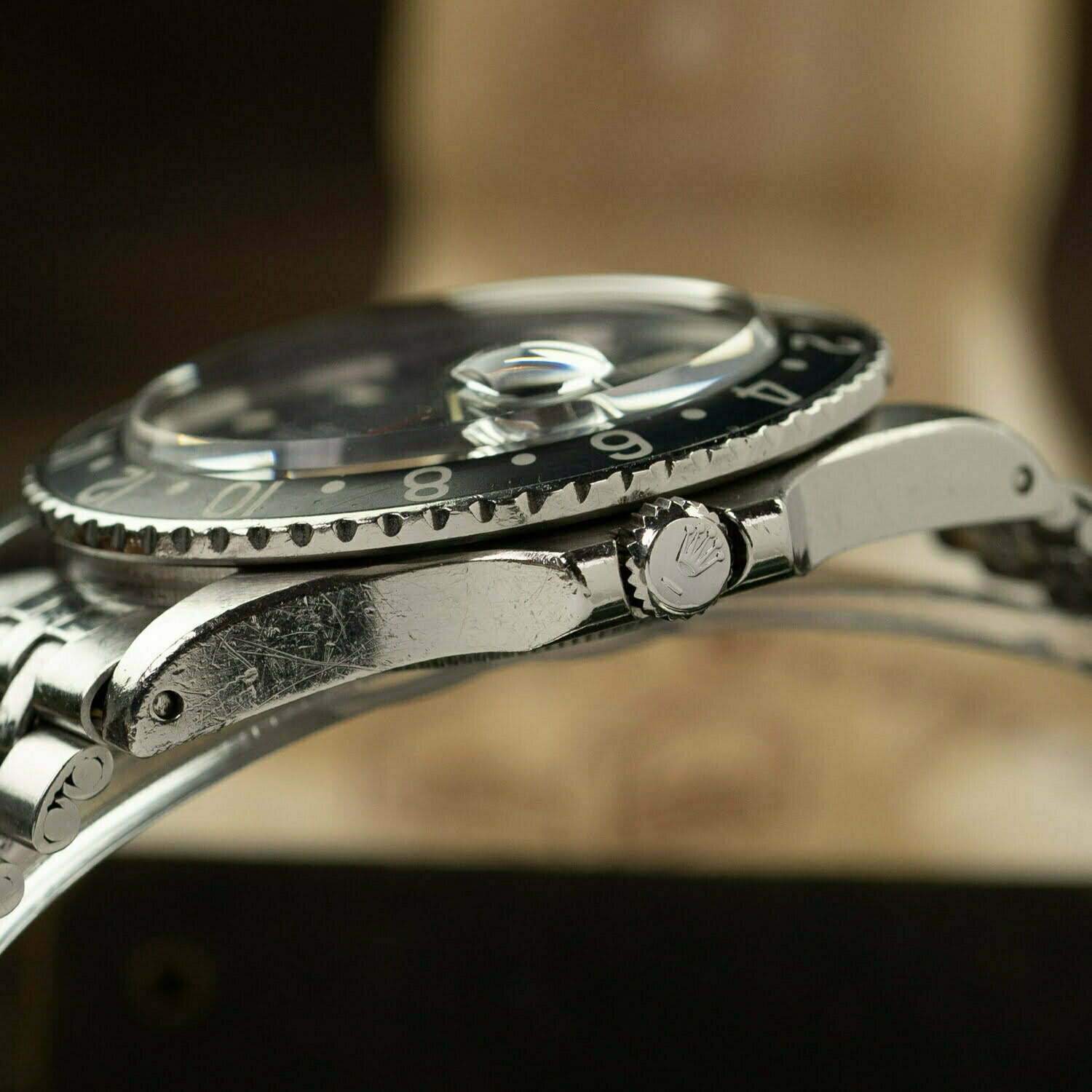 Fasten your seatbelts for the story of the Rolex GMT-Master. Aviation company Pan-Am requested Rolex to create a wristwatch that would display multiple time-zones simultaneously, as their flights got longer; crossing multiple time-zones. Rolex came up with the GMT-Master (‘GMT’ stands for ‘Greenwich Mean Time’) in 1954. The watch features a date-function and an extra hour hand (with triangle) that points out the second time zone on the bi-directional turning, 24hour bezel. Still linked to aviation and although meant for professional use, it enjoys a much wider fan base ever since it first saw light. Over the years it underwent some changes and there are so many wonderful variations of this all-time Rolex classic. Some GMT’s are great as a single purchase, others are a wonderful addition to any collection and some of them can be considered as the crowning glory.Reference 1675Introduced in 1959 and with a very long production run of little over 20 years: the 1675! On this model they added the ‘pointed crown guards’ (1675 with PCG AKA ‘Cornino)’ that got replaced by regular rounded crown guards in 64/65. The dial also underwent some changes from glossy gilt chapterring to a matte radial dial in the end. (with a lot of variations in between, like the rare ‘exclamation mark’, ‘underline’ and ‘Double-swiss’ dials). There was a change in the red GMT hand as well as the small arrow was replaced by a bigger one. The 1675 was mainly produced in steel, but was also available in 18k yellow gold or a combination of both materials. In the early 70s it became the first Rolex Professional watch with – optional – factory fitted jubilee bracelet.'Pepsi Bezel'The red/ blue bezel inserts on the steel GMT’s are referred to as ‘Pepsi bezels’ as it assembles the same colours, but in fact Rolex chose this combination because of the Pan-Am colours. The heritage of the Pepsi bezel starts in 1959, when the rare bakelite bezels were used. Up until 2007 aluminium Pepsi bezels were used (optional, next to an all-black or black/ red aka ‘Coke bezel’). After being discontinued for 7 years, Rolex re-launched the beloved ‘Pepsi’, yet this time made out of Cerachromand only available on the white-gold model. In 2018 Basel world Rolex introduced the stainless steel Pepsi with Jubilee bracelet.