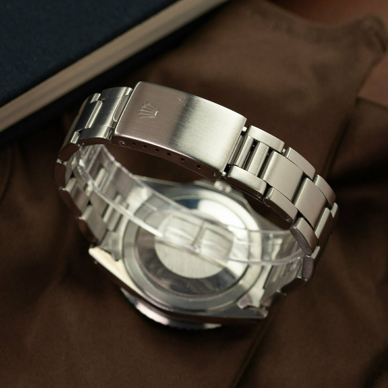 The reference 16750 is known with 2 dial configuration. The earlier examples having a matte black dial, just like its predecessor. But the later generation ones come like this: very glossy and with white gold hourmarker surroundings! The tritium inside those surroundings and in the handset, turned into a warm beige color, perfectly matching the patinated look of the uni-coloured, 24 hour bezel. Icing on the cake is the so-called "spider dial". This flaw in the lacquer used back then, caused cracking; as these lines on the surface present a unique pattern.