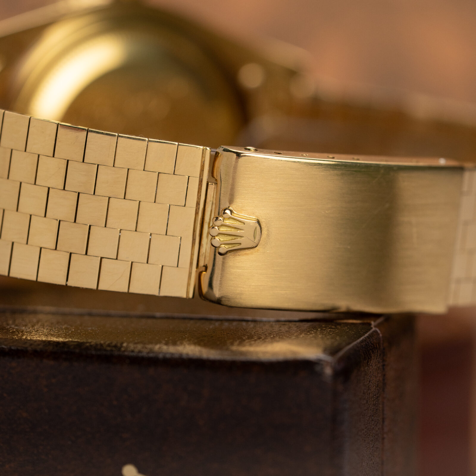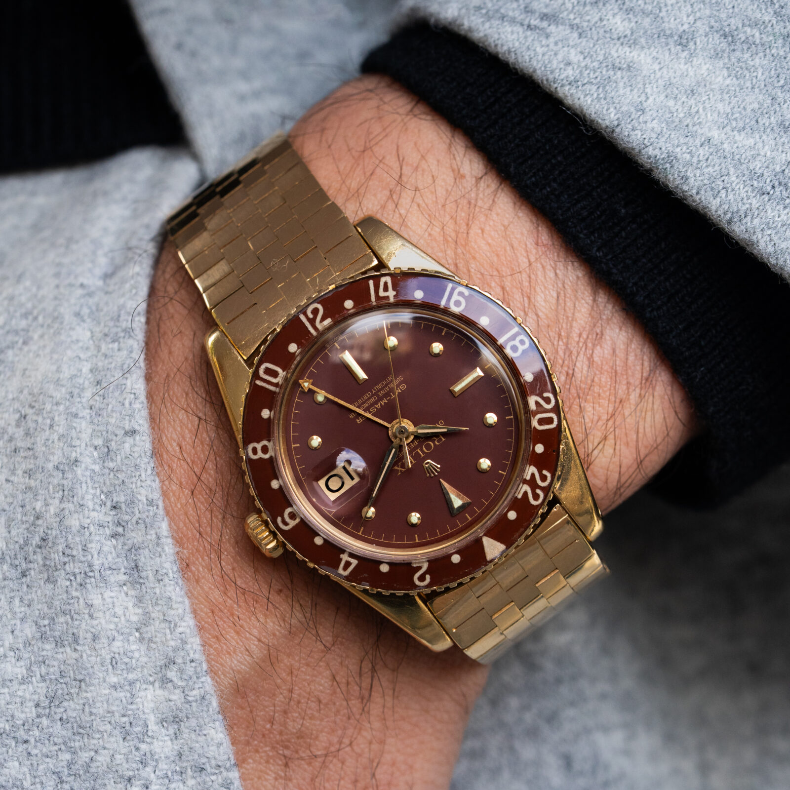 Crafted entirely in 18-carat yellow gold, the 6542/8 was the most refined expression of Rolex’s new dual time-zone instrument. Its brown lacquered dial, glossy and deep, was punctuated by raised gilt inscriptions and “nipple” hour markers. The bezel, produced in fragile yet beautiful bakelite, offered the 24-hour scale that defined the GMT line, rendered here in tones that provides a harmony with the warmth of the case. For that extra flavor; an original brick bracelet in matching metal was added.