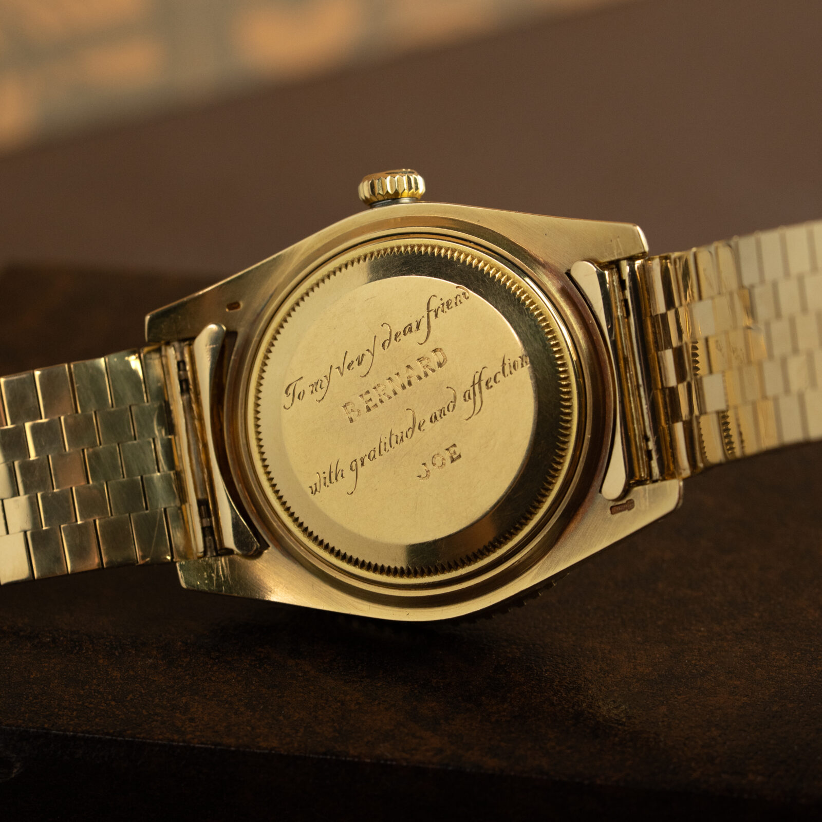 The engraving on the caseback, rendered in two charmingly distinct fonts, lends the watch a touch of personal romance. Whoever Joe was, he clearly held Bernard in high regard; gifting him an object of such value and thoughtfulness. Bernard, in turn, cared for it with remarkable devotion. The watch has survived in exceptional condition, retaining its original bakelite bezel, free from any notable damage. The lacquered dial remains beautifully preserved, its surface untouched by time, and the original hands perfectly match the warm tone of the radium-filled hour markers.