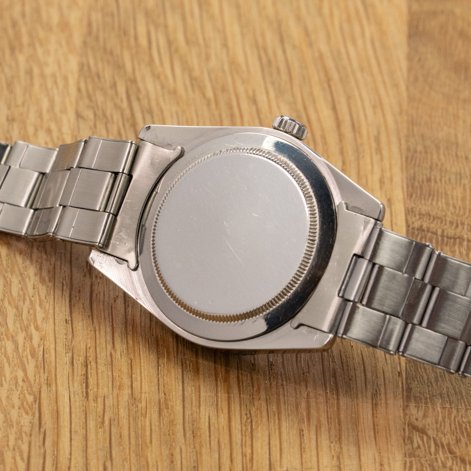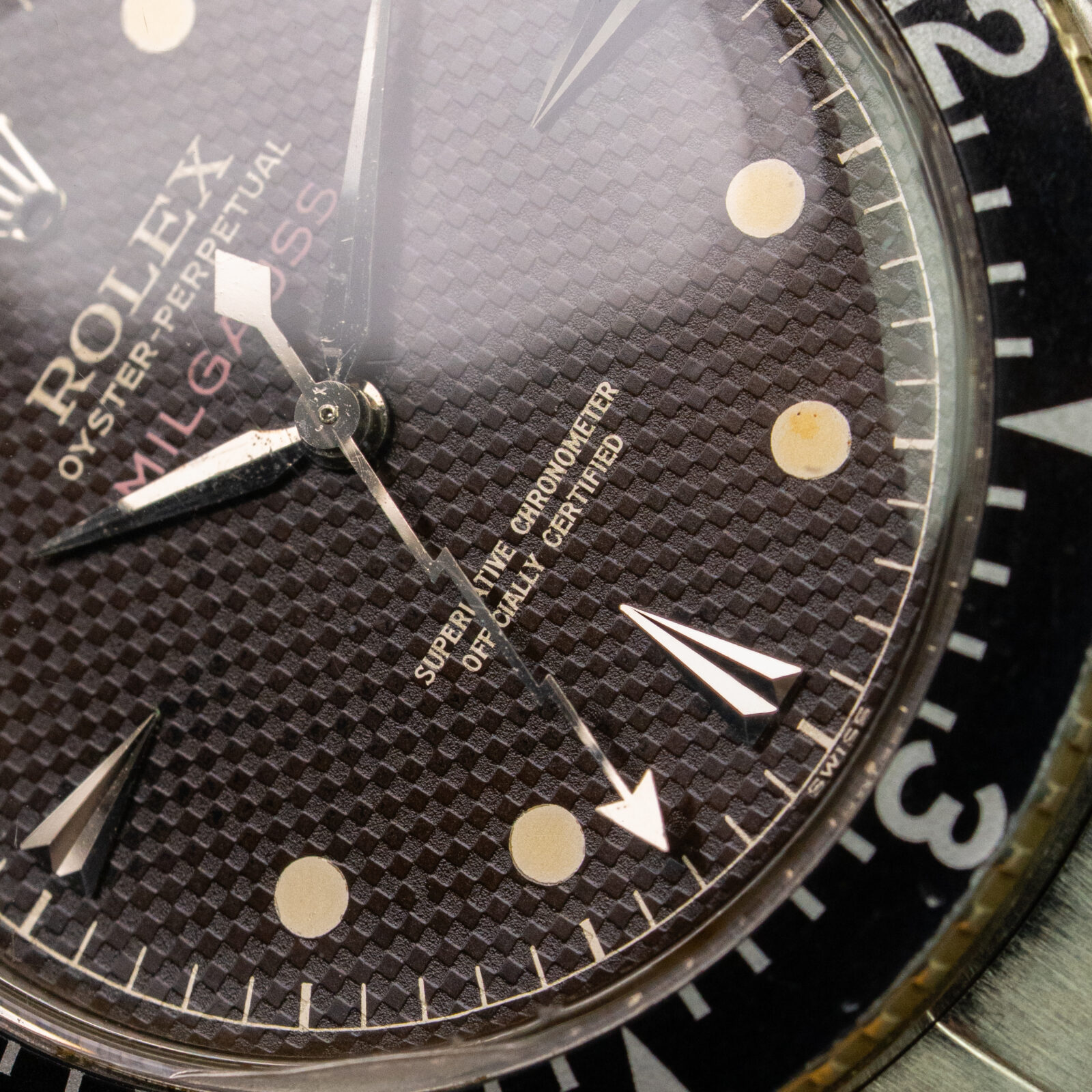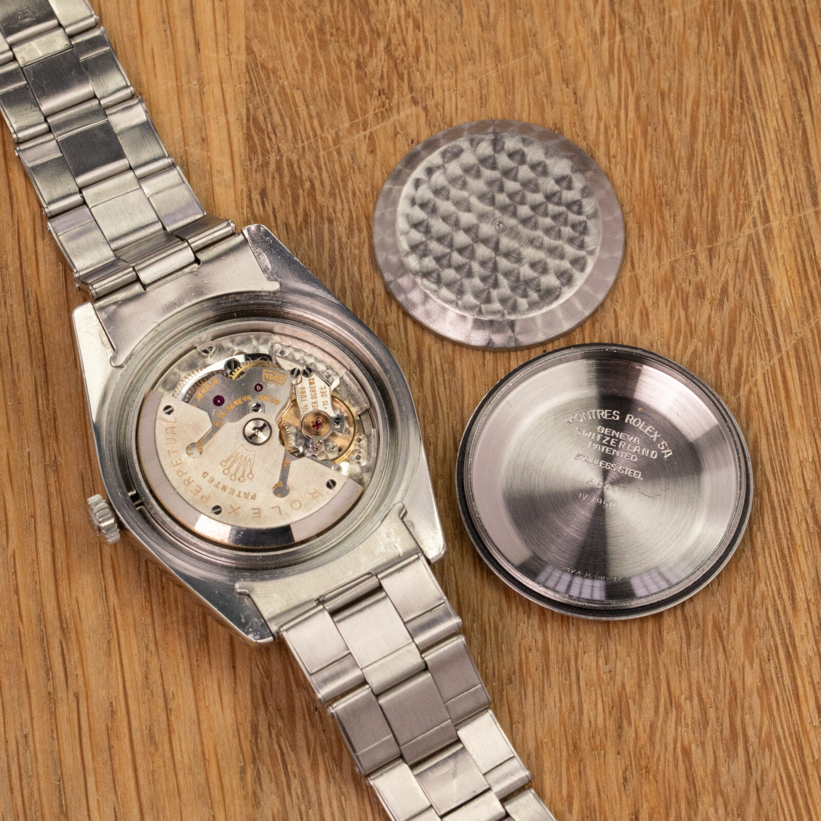 The case has thick lugs but has definitely seen a polishing wheel in the course of the last 65 years. Less important -but for full disclosure- the bracelet was replaced in the 1970’s so we sourced a period-correct one (dated 59) to compliment this amazing specimen.