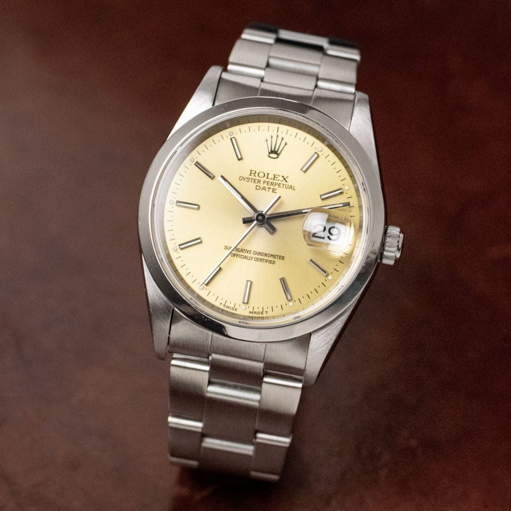 A great classic from Rolex in this week's drop!The Rolex Date 15200 already has the sapphire crystal and, in this case, a stainless steel Oyster bracelet. The champagne dial is signed 'Superlative Chronometer Officially Certified' and the watch has a stainless steel Oyster case measuring 34 mm in diameter. This beauty from 1995 is powered by a calibre 3135 just like the Datejust 162XX-series. What we like about the Date is the sizing, which is slightly smaller than a Datejust. Because of that this watch, with the date and cyclops displayed at the 3-hour position, is the perfect watch for any occasion.