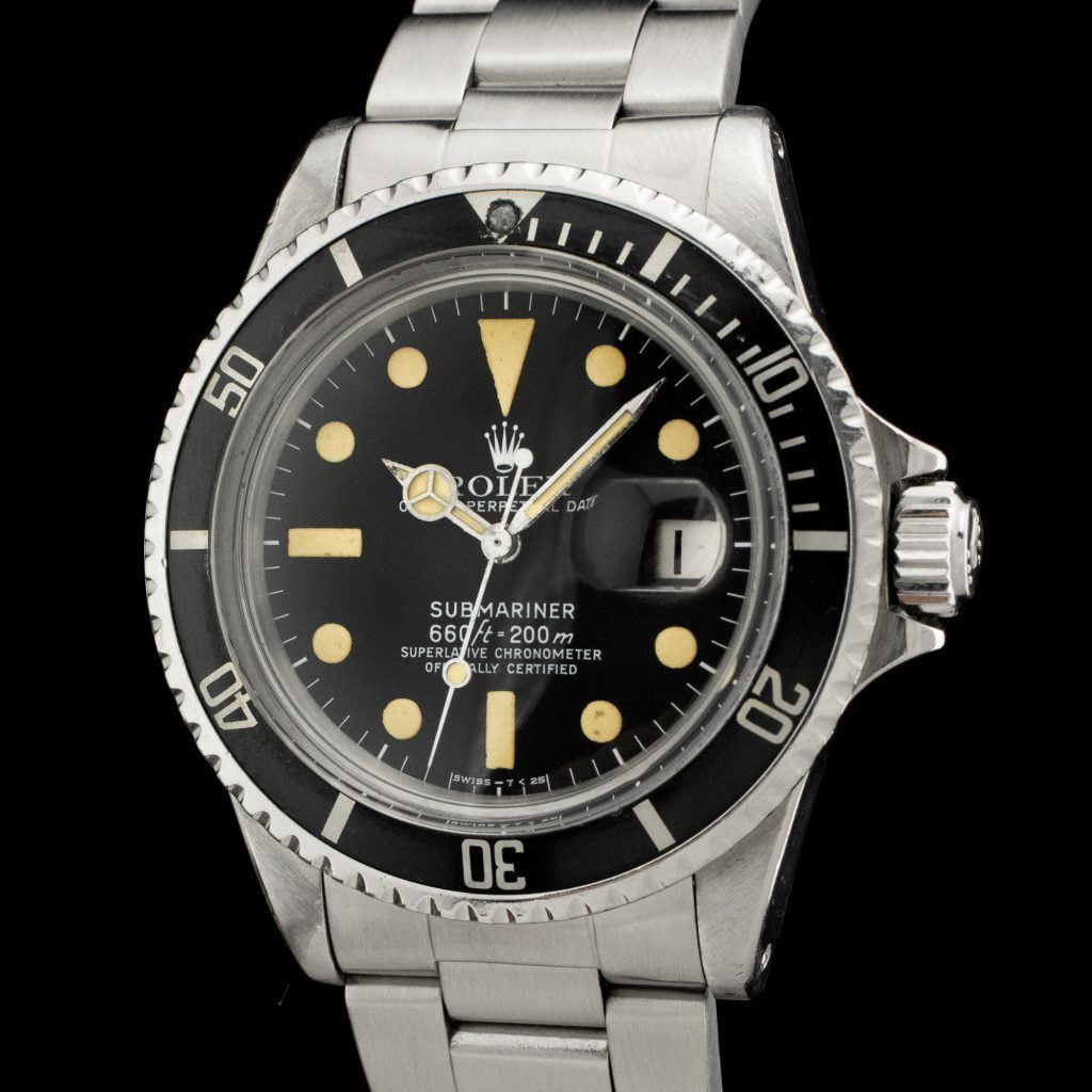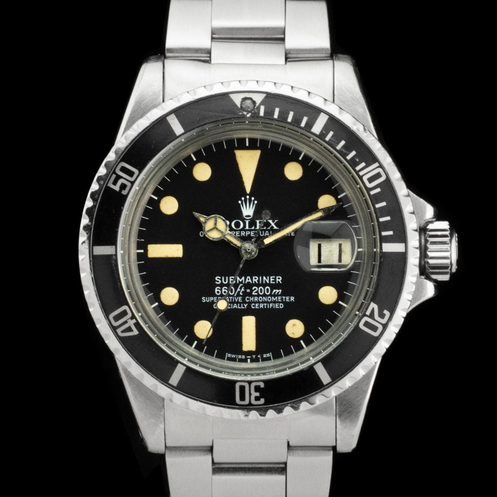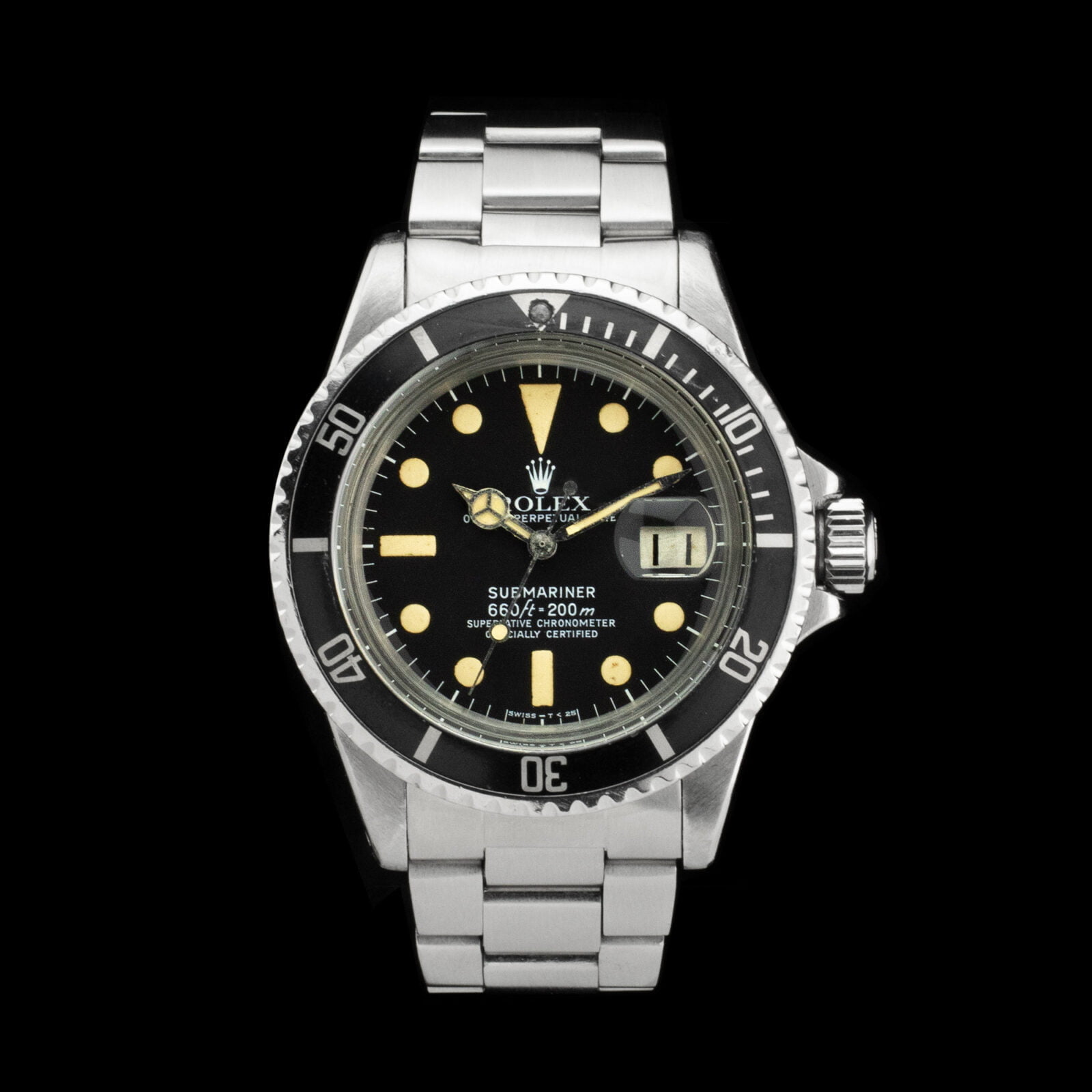 Rolex SubmarinerVisionary Hans Wildorf set out to make the world’s first waterproof and dust proof wristwatch and so in 1926 the ‘Oyster case’ was created. Then later on in 1953, the Rolex Submariner was born, with a water depth rating of 330ft/100M making it one of the world’s first wristwatches designed for the upcoming sport of scuba diving. The wristwatch was created for divers who needed a precise watch which could scale to such depths and be a reliable and accurate way of measuring (with the turning bezel) the time spent underwater. A major aspect of creating such a time piece was to make it easily legible yet aesthetically pleasing, hence the large contrasting white tritium hour markers and Mercedes hand on the black dial. The rugged look was adopted by no other than himself Mr Bond. (Sean Connory as Bond wore it in 1962’s ‘Dr. No’. The watch was also featured in the later ‘Goldfinger’ and ‘Thunderball’ movie.) A legend was born and overtime it proved to be arguably one of the best, most desirable and iconic luxury watches of all time.REF. 1680The Submariner 1680 was produced between 1967 until 1979. It was the first Submariner with the date function. This reference has a calibre 1575 based on the cal.1530. In the first 7 years of production the 1680 was printed with Submariner on the dial in red instead of white, the “red Submariner”. The early models are extra desirable and feature a “Meter first dial” (which refers to the 200 meters depth rating being displayed before the 600 feet depth rating.)
