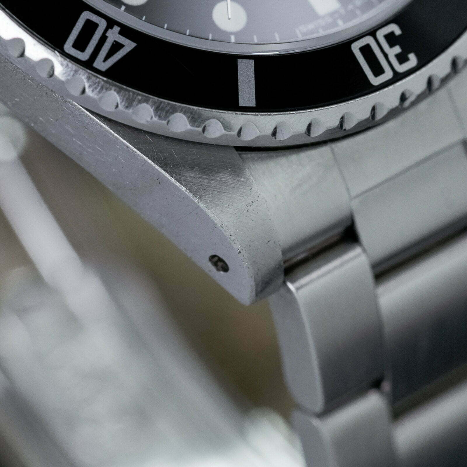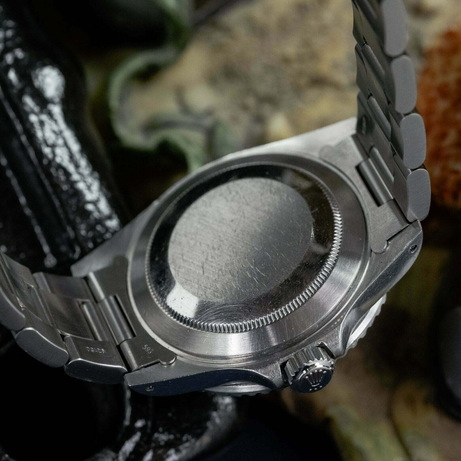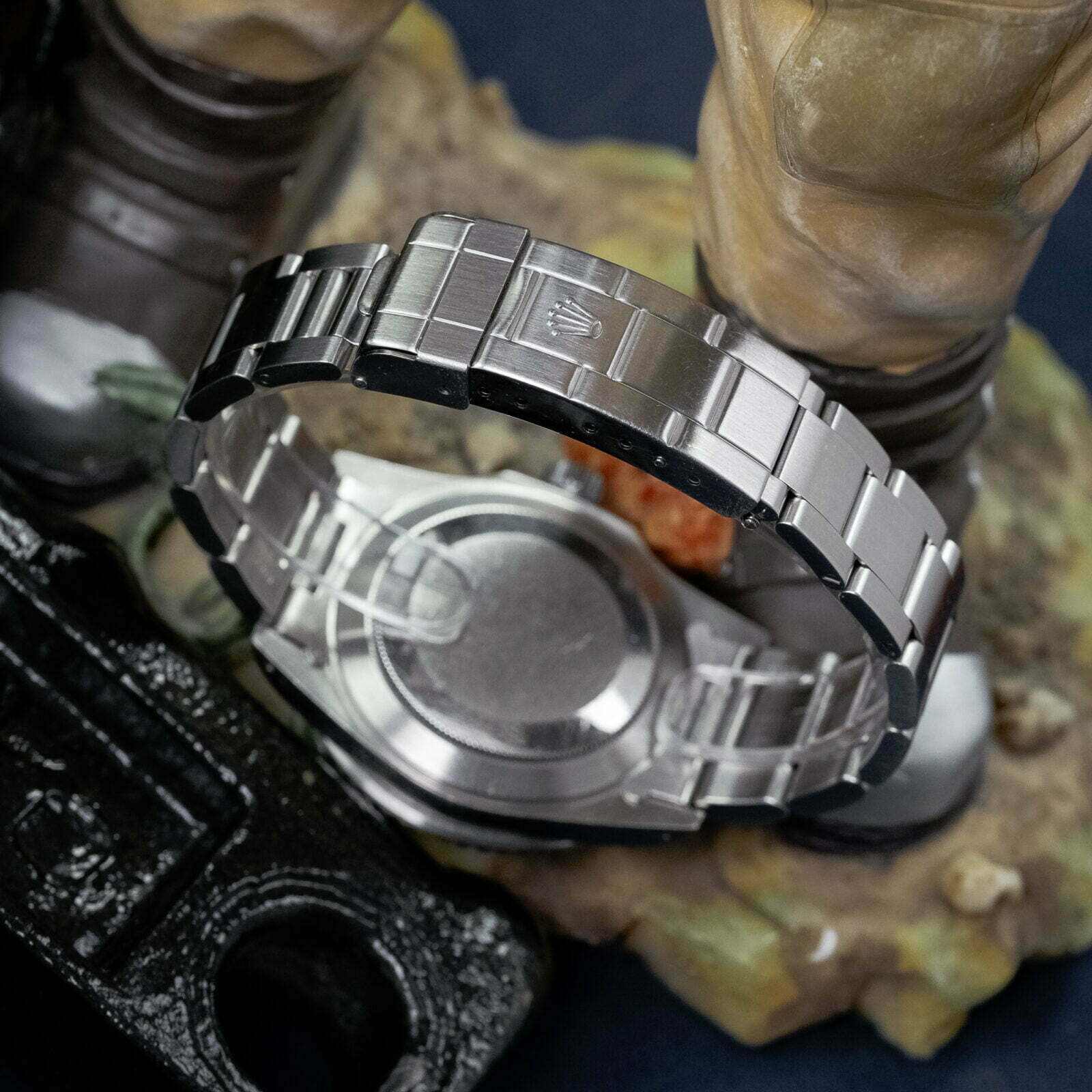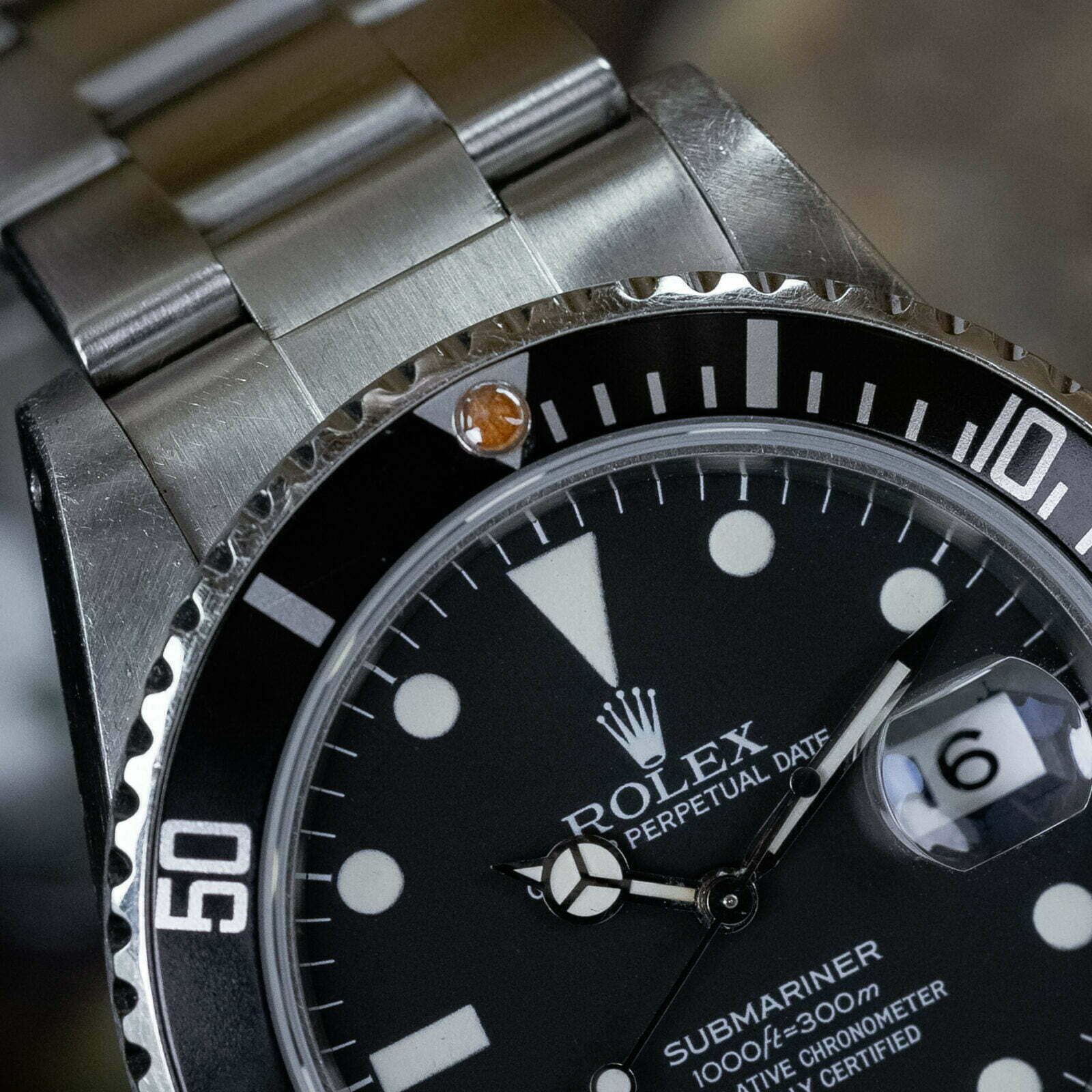 This 16800 dates back to 1982 and is in excellent condition with a thick and sharp stainless steel case, with chamfers still visible, and a sturdy Oyster bracelet. The matte black dial dial is spotless and has turned to a lovely charcoal gray color and the tritium indices, hands, and lume pip are in perfect condition too. The original bezel still features a deep black color, the discoloured tritium lime-pip that adds character to this legendary toolwatch.