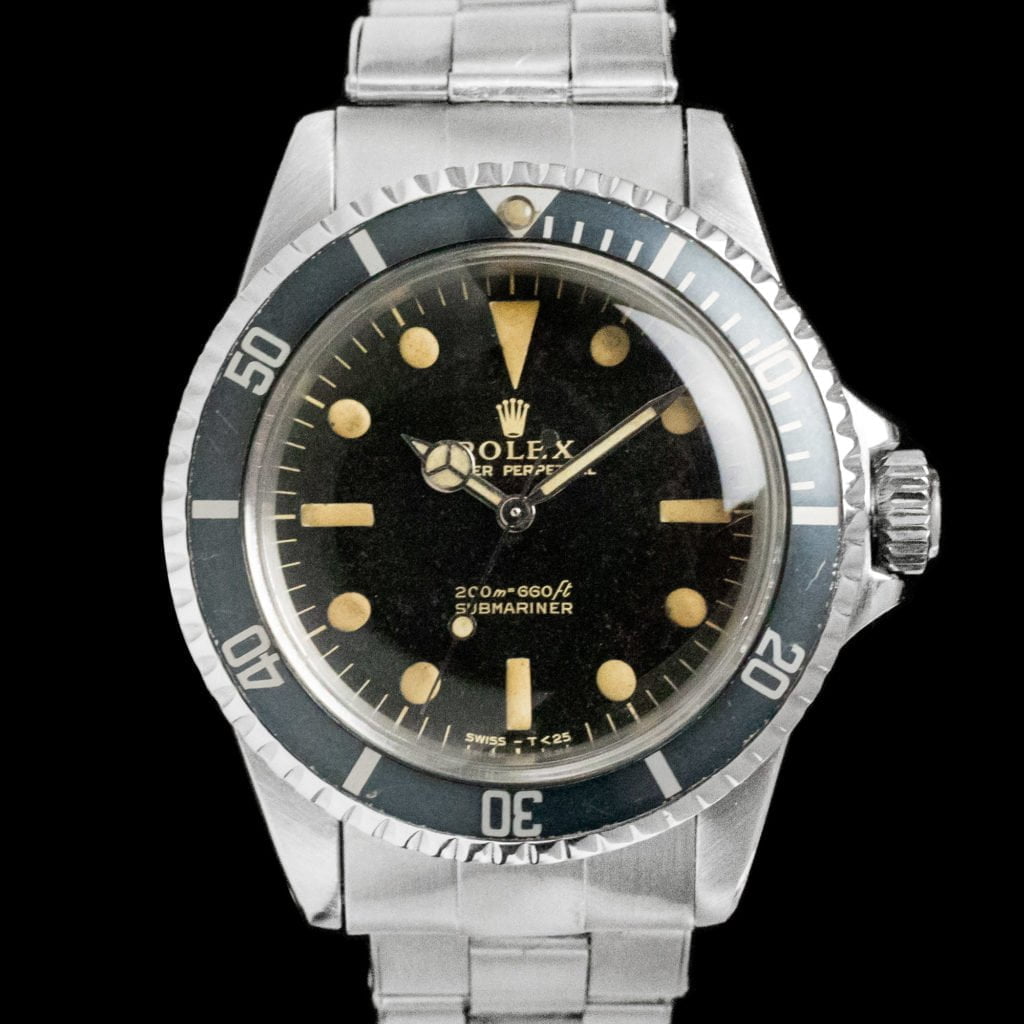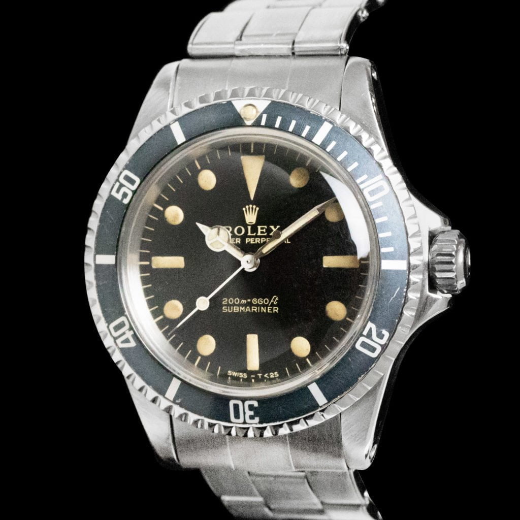 Rolex SubmarinerIn 1953, Rolex introduced one of the world’s first wrist watches geared specifically towards divers: the Submariner. Rolex had to confront a number of challenges when designing its first dive watch. The watch obviously had to withstand significant amounts of pressure and had to accurately measure time spent underwater, which the first Submariner achieved by featuring a 330ft/100m depth rating and a rotating diving bezel. It also had to be easily legible in conditions of reduced visibility yet aesthetically pleasing. Hence, the Sub’s iconic large white hour markers and Mercedes hands set against a contrasting black dial. The Submariner is the most iconic and desirable luxury watch of all time and has been adopted by luminaries such as Jacques Cousteau, Che Guevara, and none other than James Bond. Our favorite Bond, Sean Connery, wore a Big Crown Sub (early reference of the Submariner with a big crown and without crown guards) in the 1962 classic ‘Dr. No’. The watch was also featured in ‘Goldfinger’ and ‘Thunderball’.Reference 5513The Submariner reference 5513 was produced from 1962 to 1989. This model features crown guards, which were made to protect the Oyster crown. The pointed crown guards made their first appearance on the 5513 and were not much later replaced by the rounded crown guards. The base calibre for the 5513 is the 1530, which is not chronometer certified and therefore the dial bears just 2 lines of text instead of 4 lines, which is the case for Superlative Chronometer Officially Certified watches.