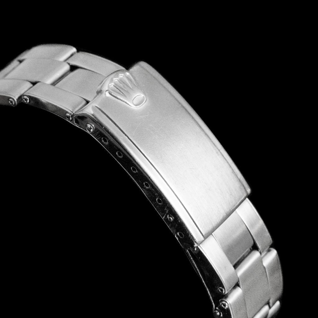 The 5513 was introduced in the early '60s. Gilt, glossy 'Meters First Dials' were used until 1966. Gilt refers to the printing on the dial, which is gold. ‘Meters First’ refers to the meters (200m) depth rating being displayed before the feet (660ft) depth rating on the dial. The 5513 Amsterdam Vintage Watches has on offer is from '64. Two years later the production of this type of dials stopped. The gilt dials got replaced by the matte ‘Meters First Dials'. Around 1969, 'Feet First Dials' also appeared on the market to increase sales in USA and in 1970, Rolex exclusively produced 'Feet First' versions. So, the 'Meters First Dials', especially the gilt ones, were produced for a relative short period and are therefore rare and highly collectible. The example we have has a dark-yellow/orange-coloured tritium index, which looks breath-taking together with the clean gilt dial. A feature, we think is very cool, is this example's faded MK II bezel which has taken on a grey colour. The watch comes on a stainless steel USA riveted Oyster bracelet. The USA riveted bracelets have hollow screws in the links whereas the European ones have solid pins. It runs on the calibre 1520.