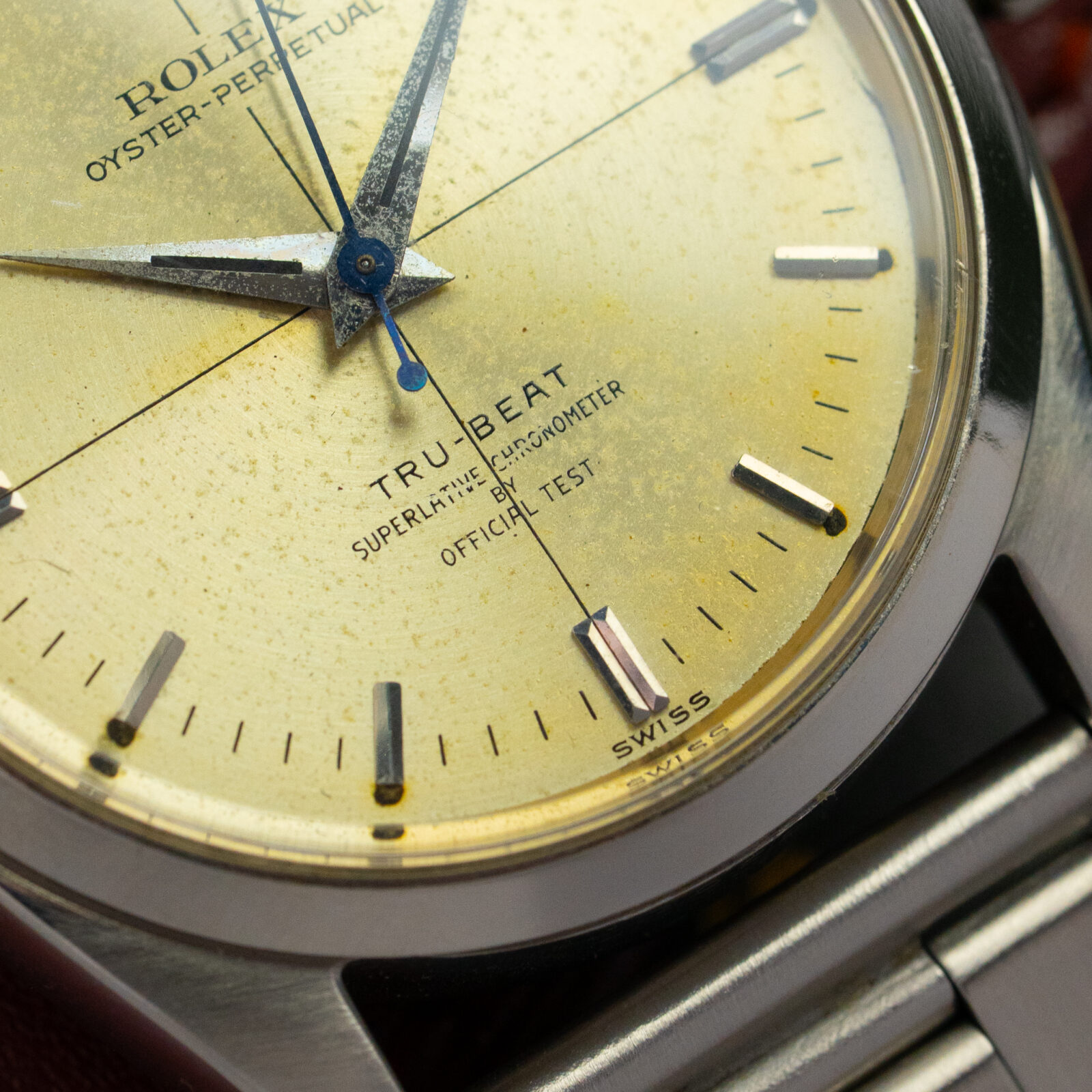 We’re thrilled to bring you this unusual Rolex model: the Tru-Beat, carrying reference 6556. This awesome and rare piece dates back to the year 1955 and was made to help doctors measure hart beat. The watch’s name comes from true beat, which is also known as dead beats or dead seconds. Thanks to the legendary caliber 1040, the one that terrifies every watchmaker due to its complexity, this watch doesn’t have the famous sweeping seconds. As a matter of fact, this watch ticks like a quartz, which makes it easier for doctors to precisely measure a patient's hart beat. People in the '50s weren’t convinced by the Tru-Beat’s ticking seconds and as a result sales were disappointing and Rolex stopped the production after 5 years. Due to the lack of spare parts, many of the 1040 calibers were replaced by caliber 1030. This makes it very hard to find an all-original, ticking Rolex Tru-Beat nowadays.