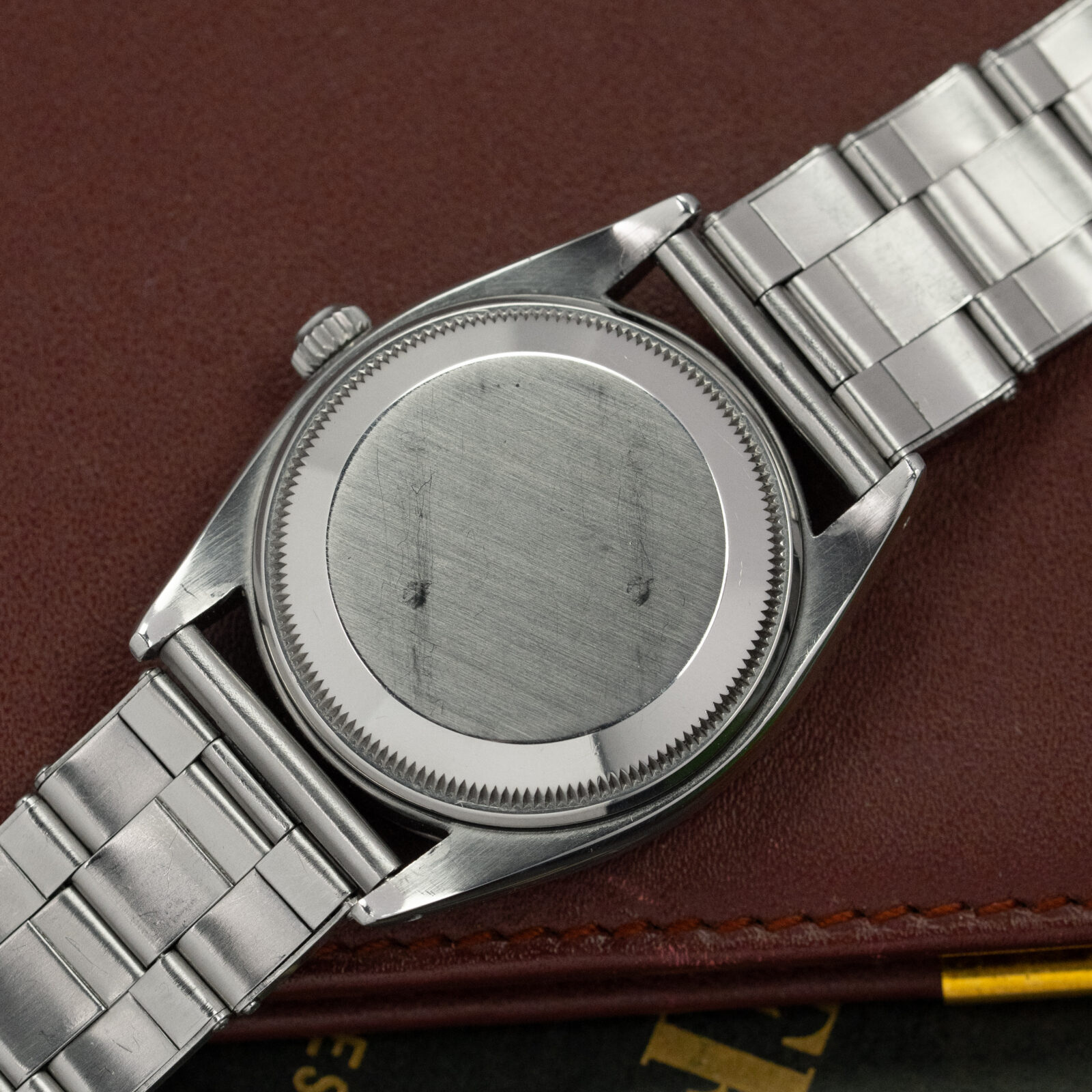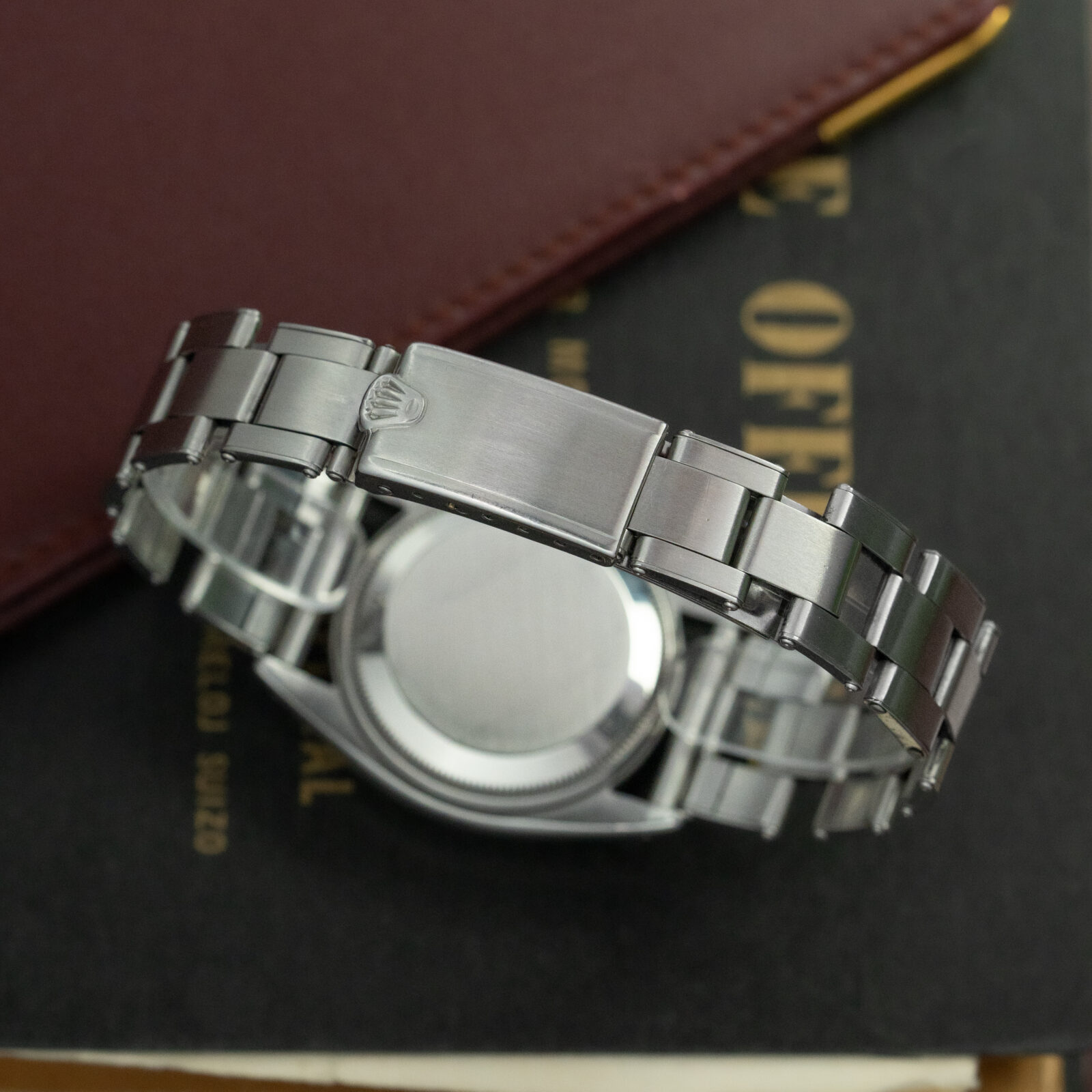 The extendable Gay Freres riveted Oyster with straight-end links completes this rare 34mm measuring package.