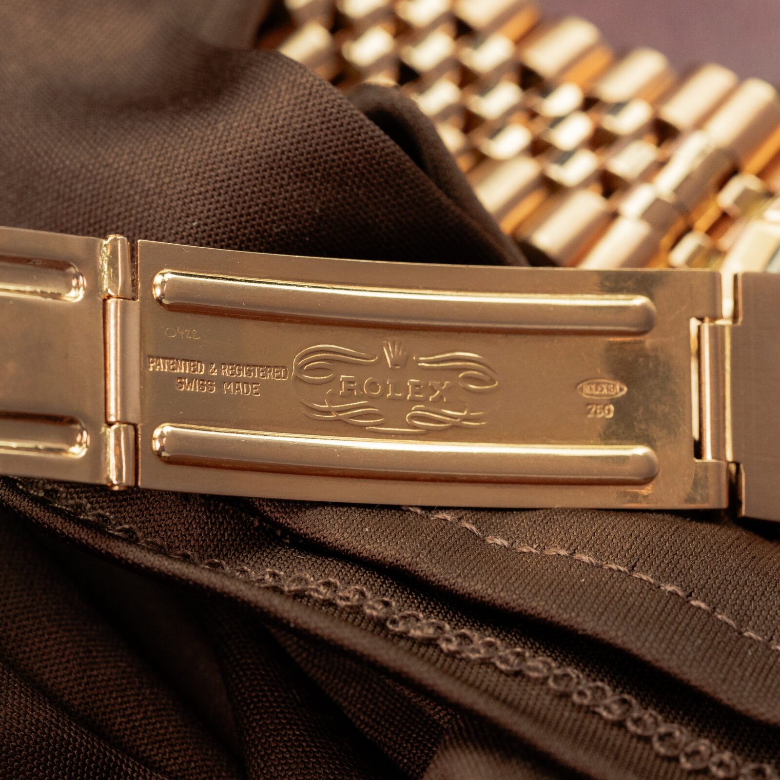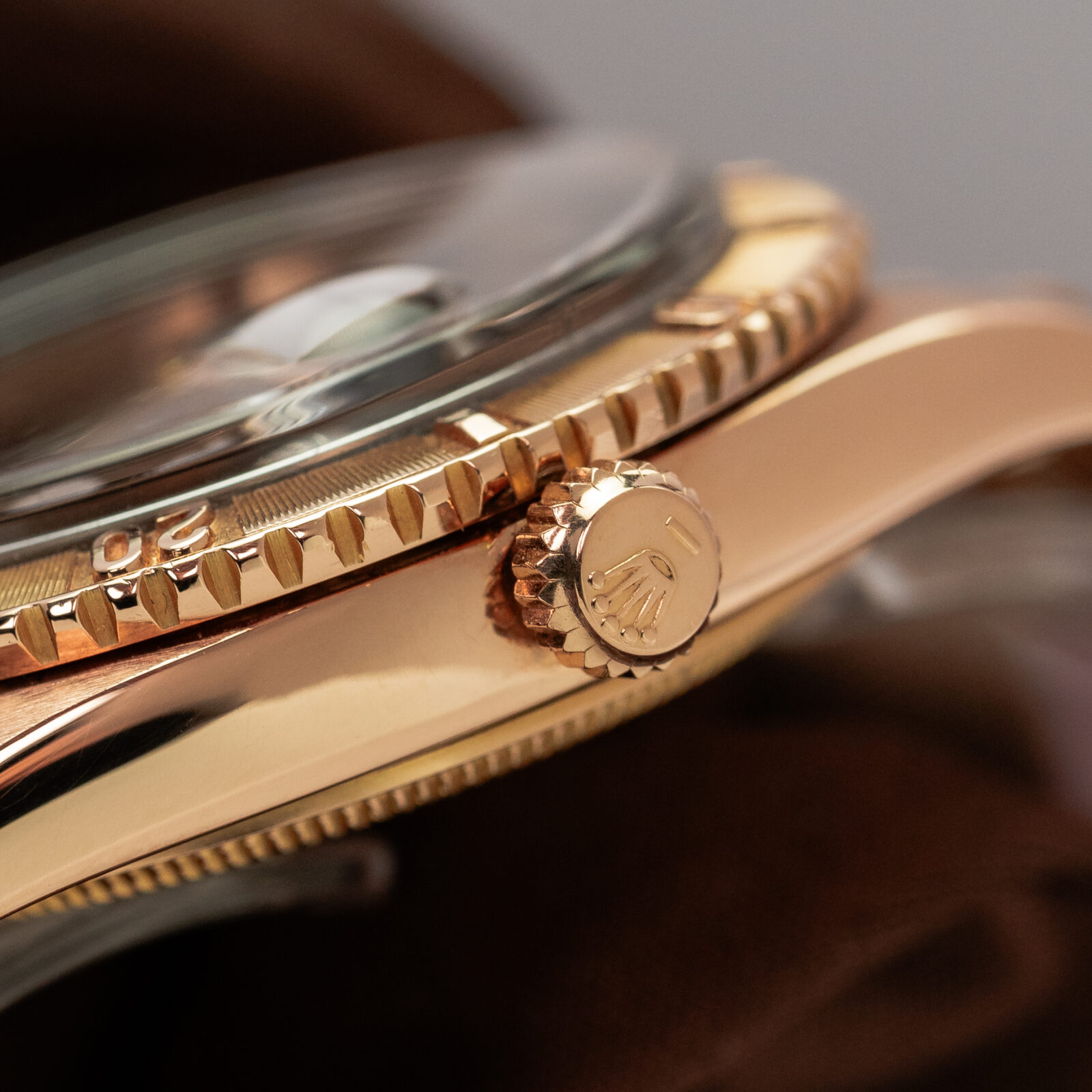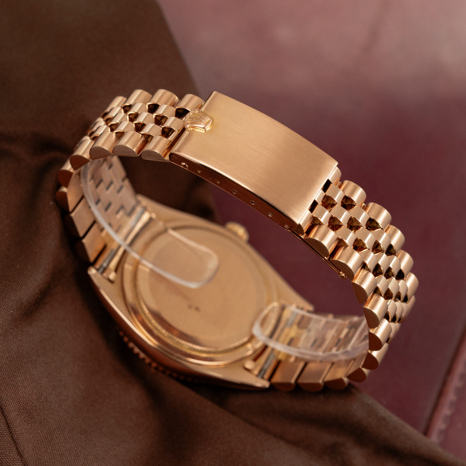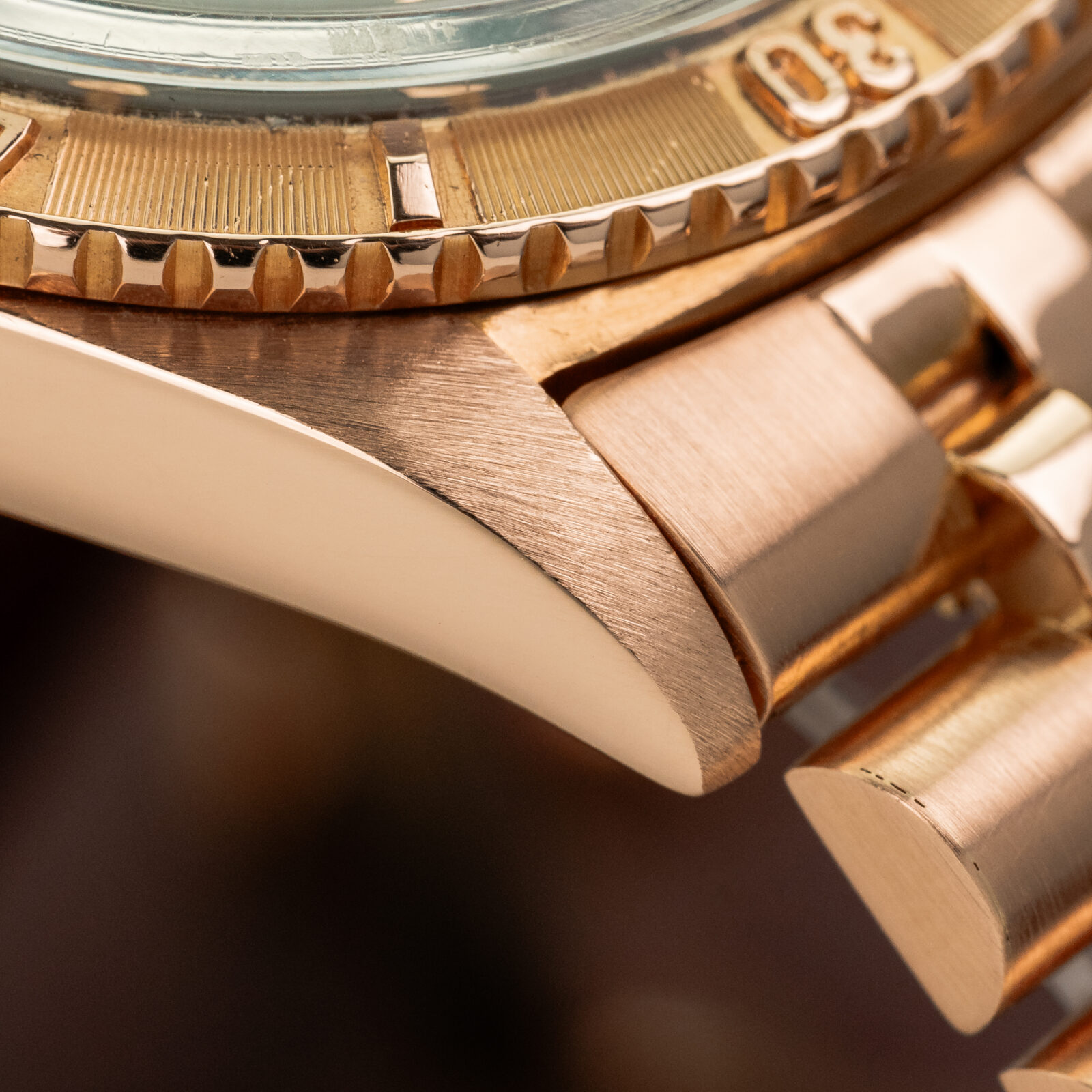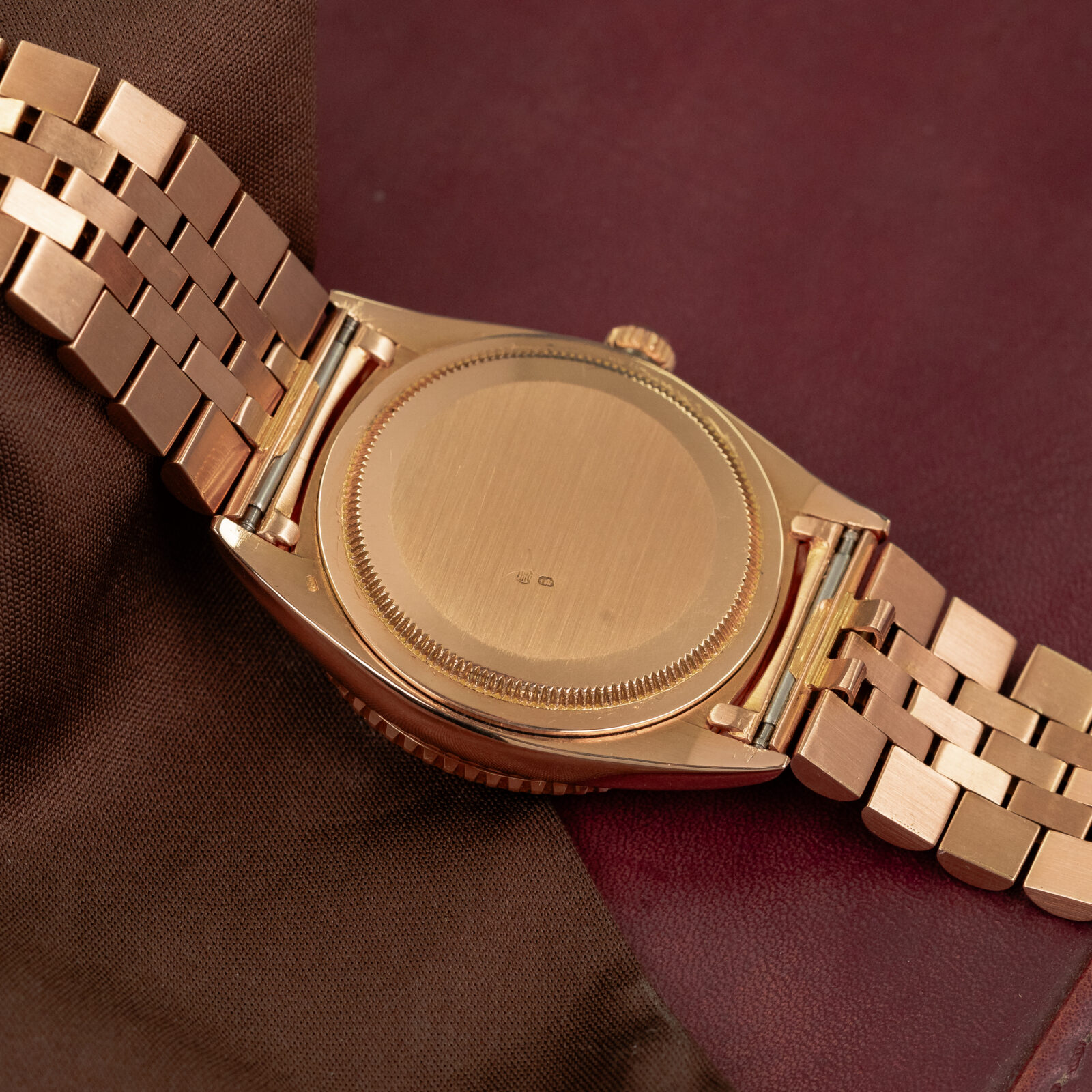 Next to all the comforts and beauty that the regular Datejust provides, the Turn-O-Graph has a bi-directional turning bezel, giving it a sportier look and an alternative feel. This Rolex Datejust Turn-O-Graph reference 1625 dates back to 1962 and is absolutely breathtaking. The watch is executed in the exceedingly rare 18k rose gold case with a diameter of 36 mm. Unlike its predecessors (the 6309 and 6609), the use of this metal alloy is extremely rare for this reference. After extensive research we could only track down two other pink gold 1625. Thanks to the factors of nature combined with the materials used by Rolex, back in the day, has created this incredible, evenly faded, brownish hue. The original Jubilee bracelet in matching metal is a rarity in and of itself, even more so when preserved in this condition.